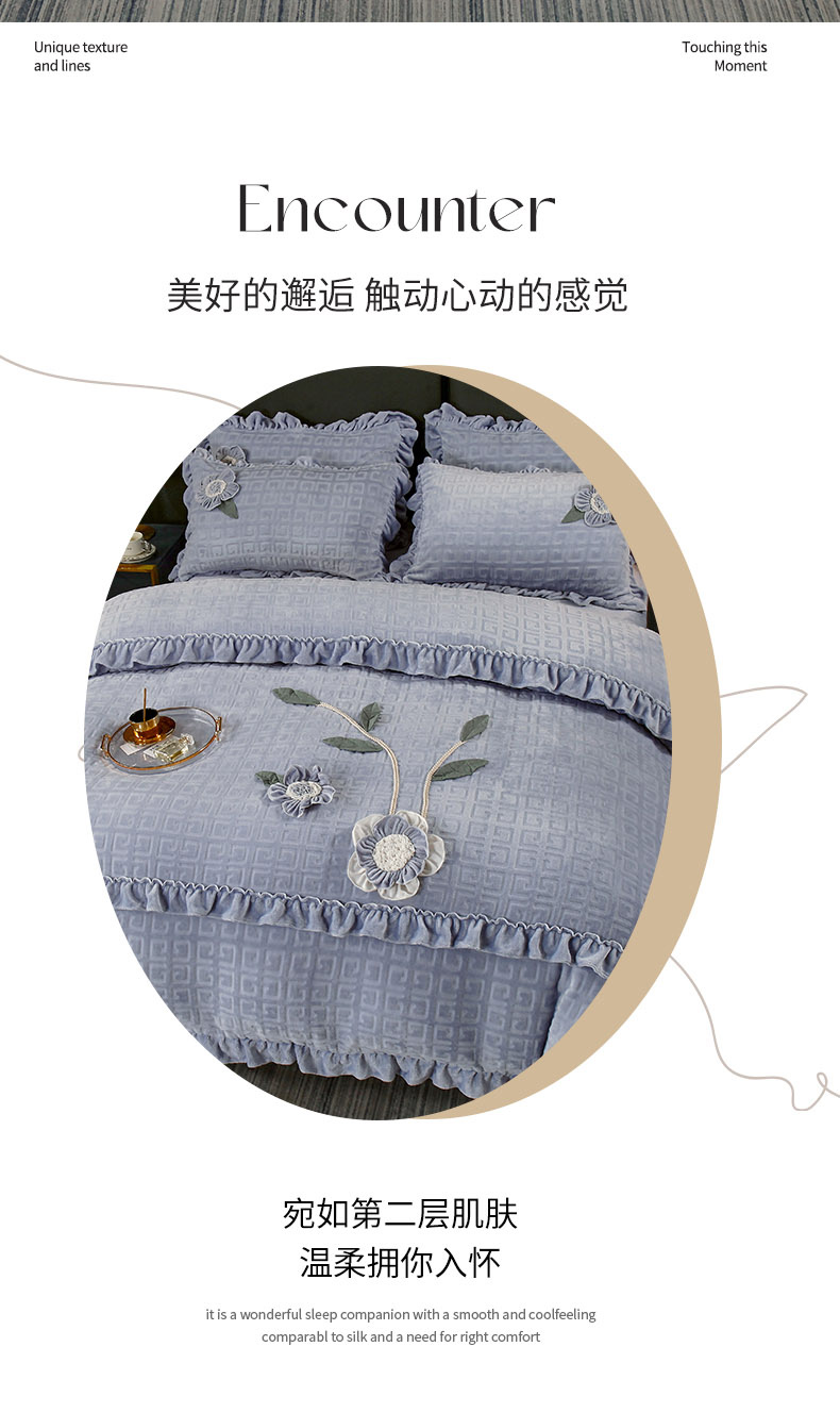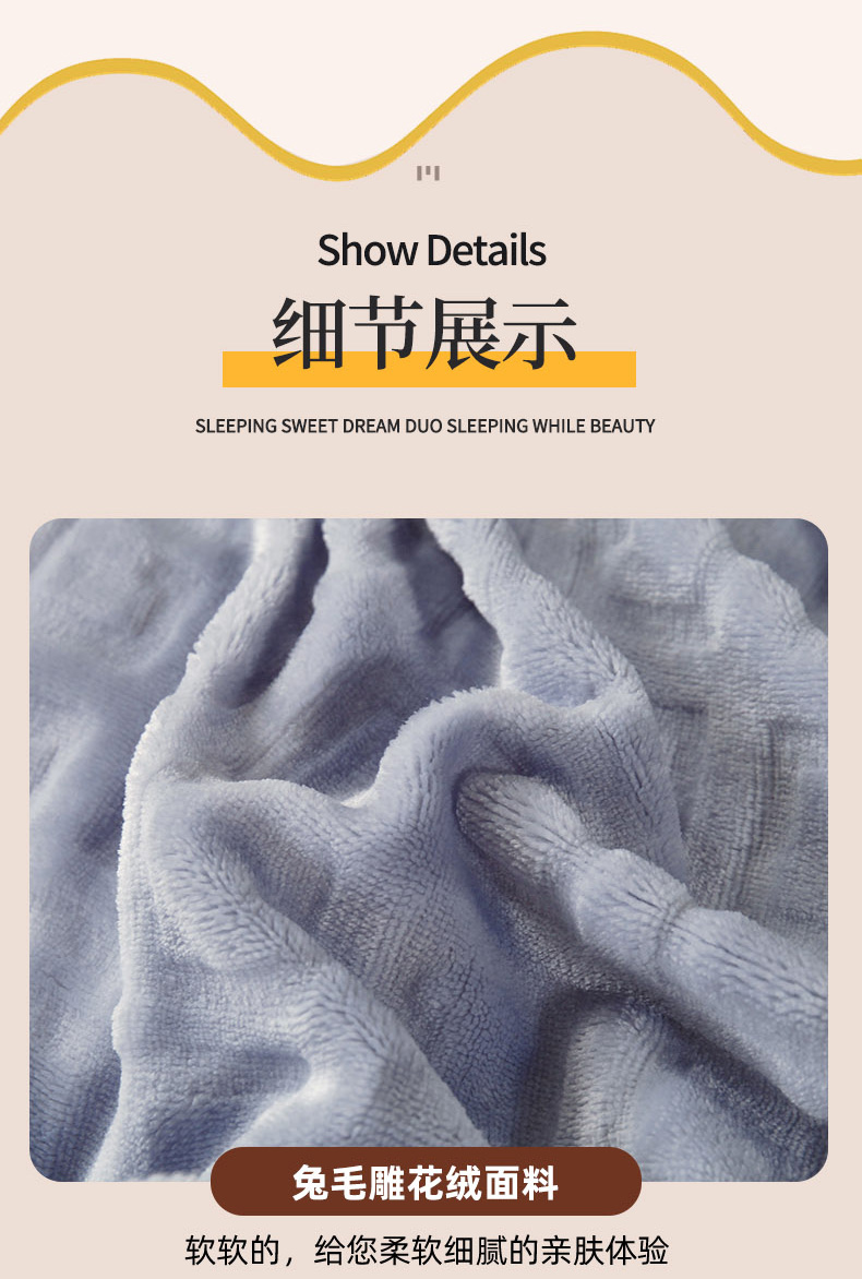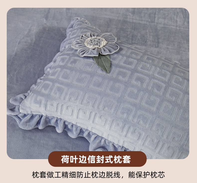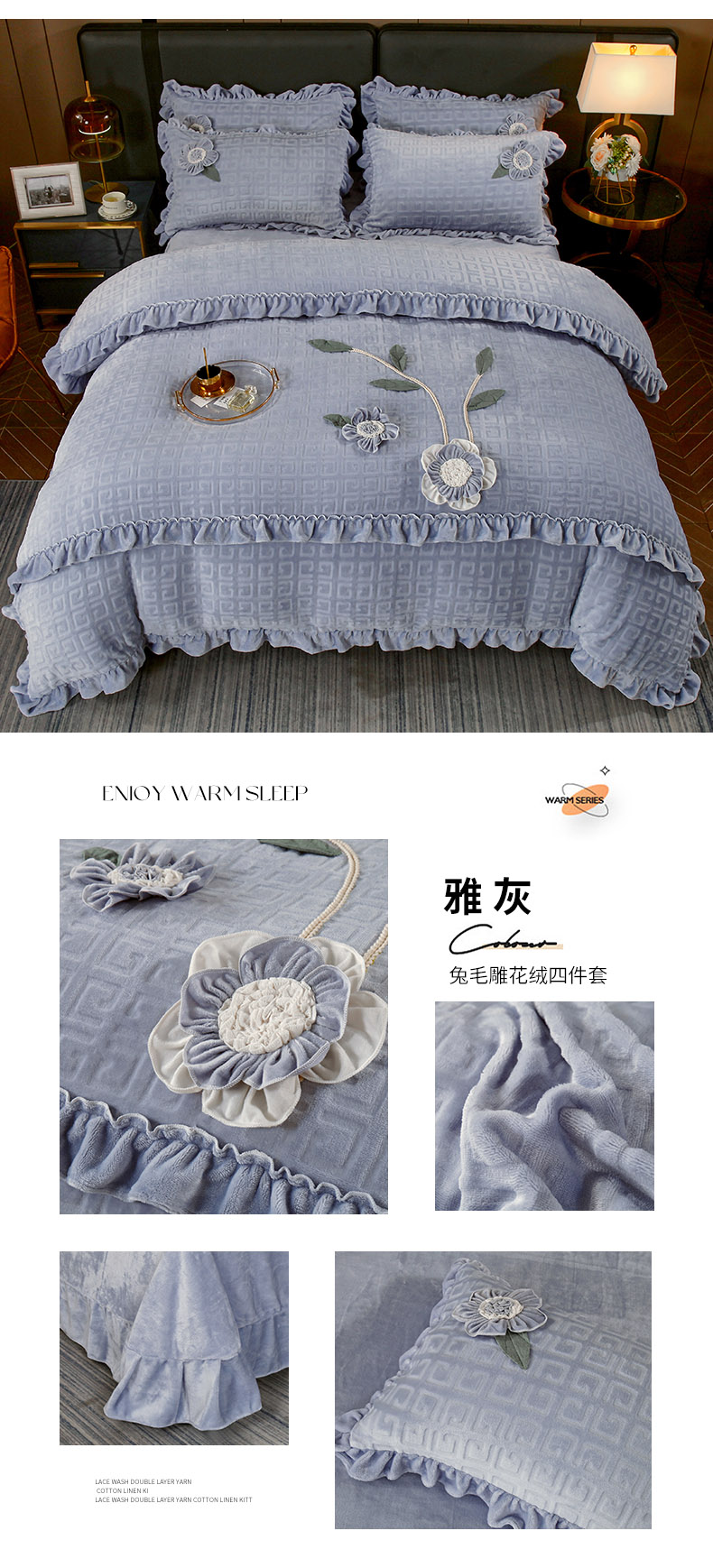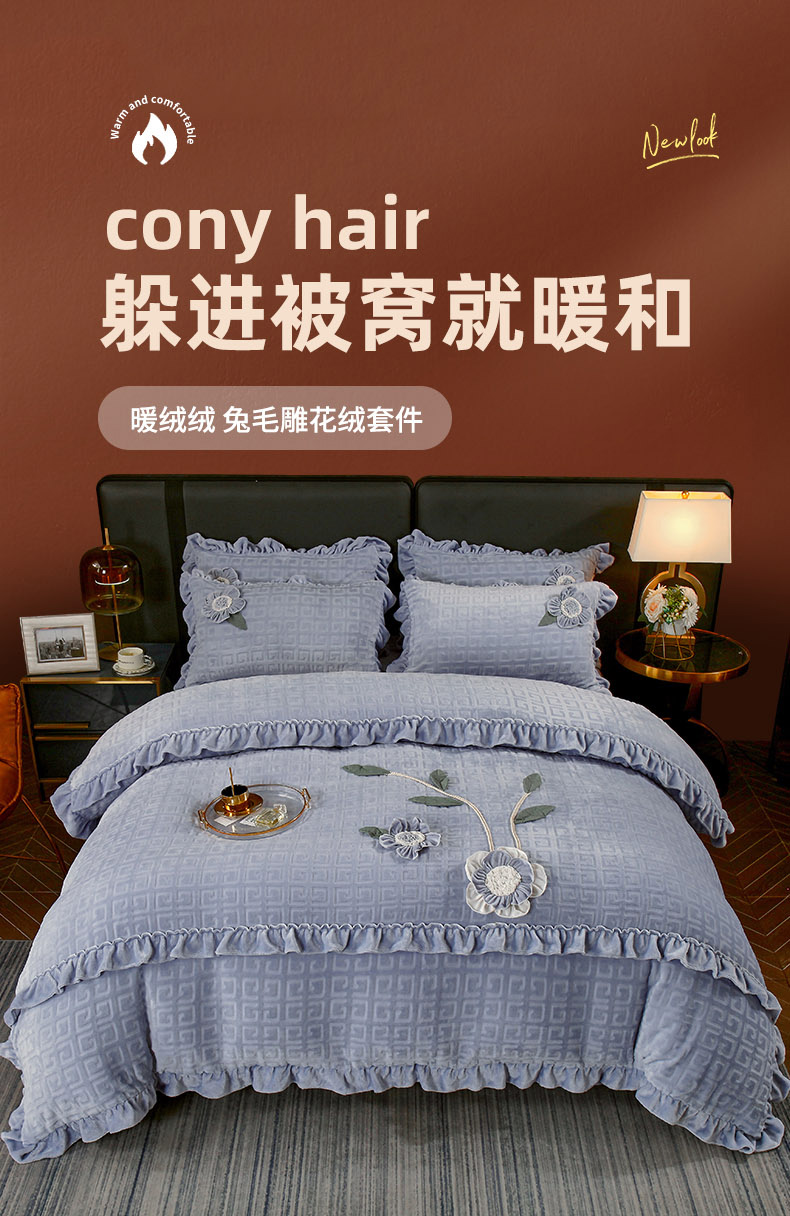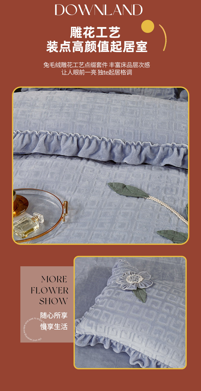 兴美佳家纺 2023新款高克重兔毛绒雕花手工盘花四件套 雅灰