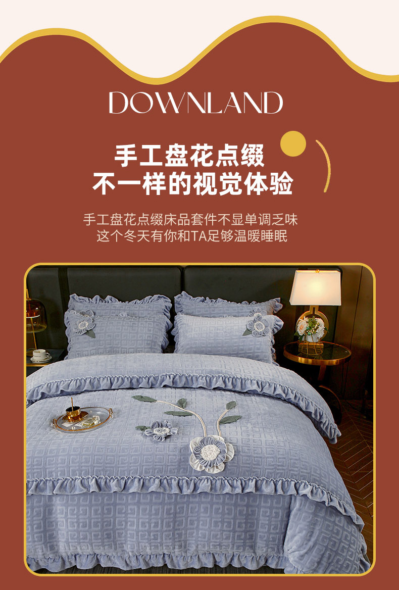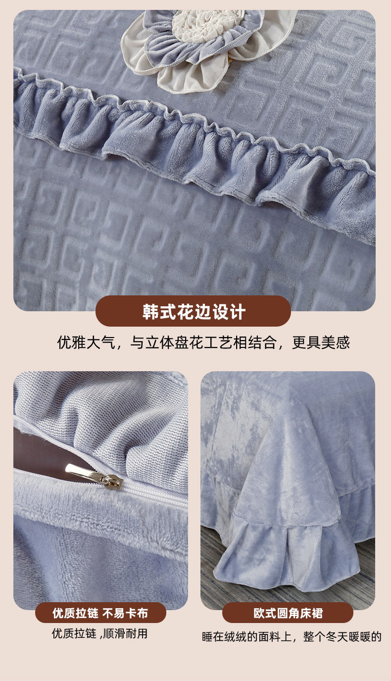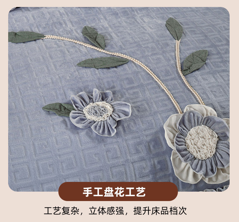 商品名称:兴美佳家纺 2023新款高克重兔毛绒雕花手工盘花四件套 雅灰