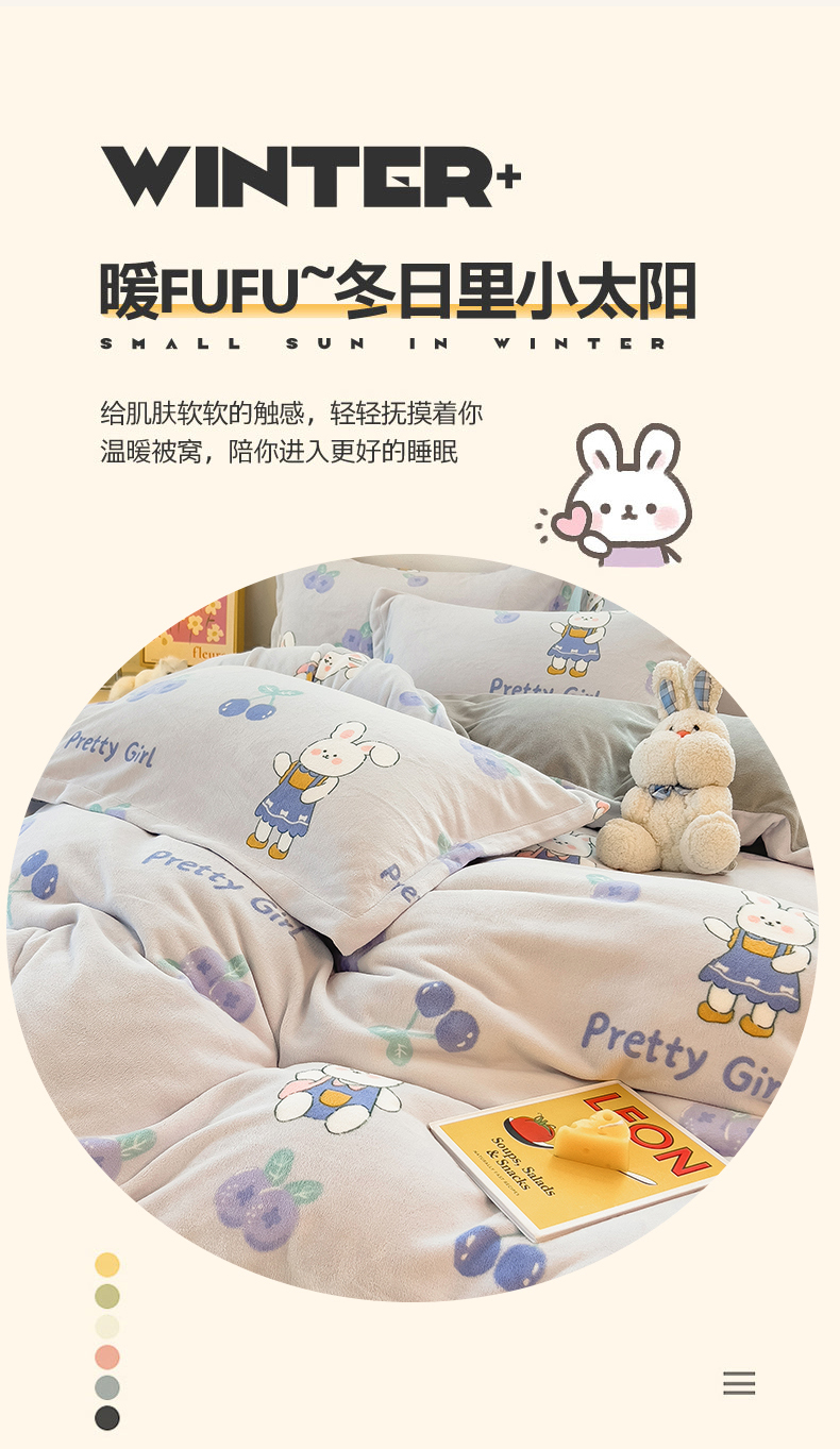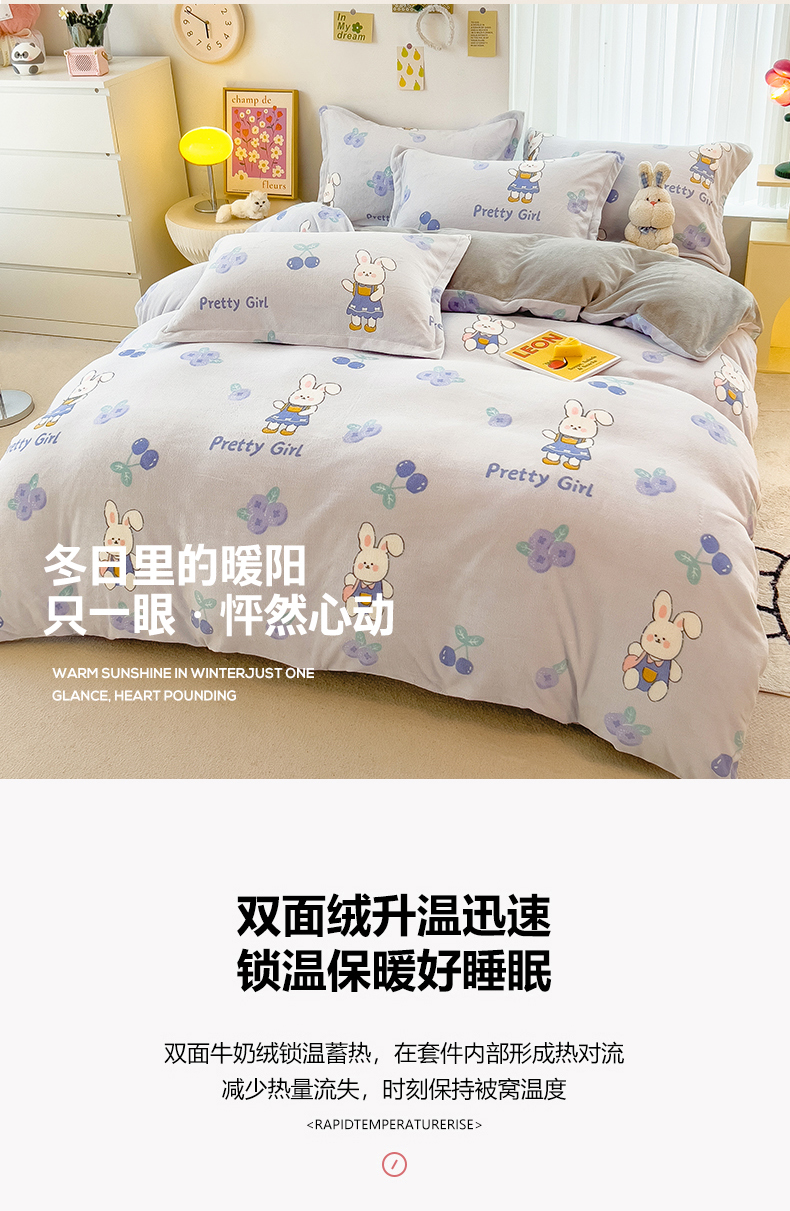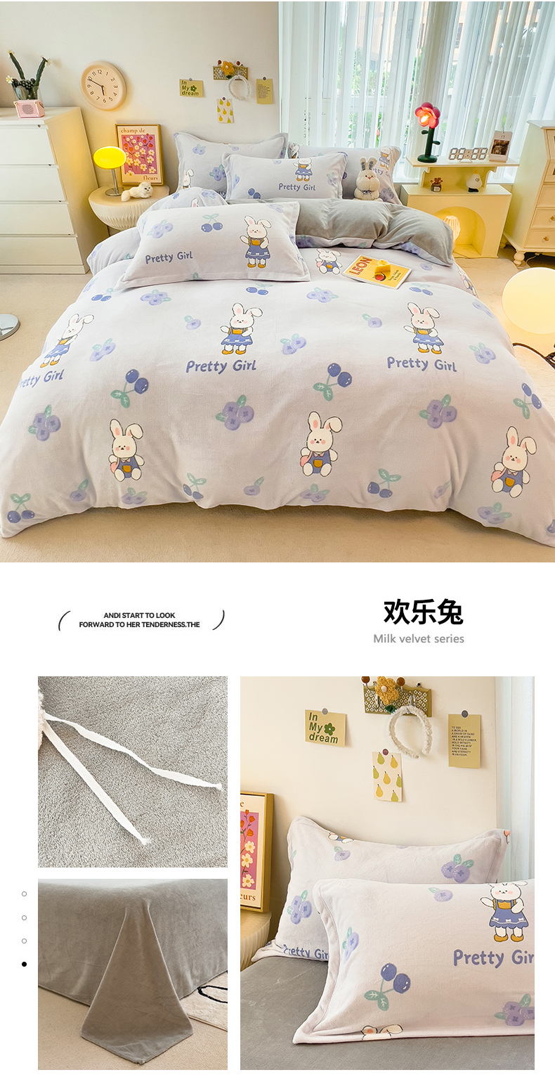 商品名称:全季家居2023新款小清新A类高克重加厚印花牛奶绒四件套 欢乐兔