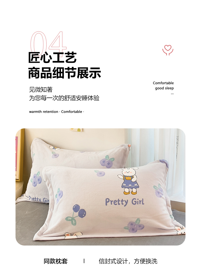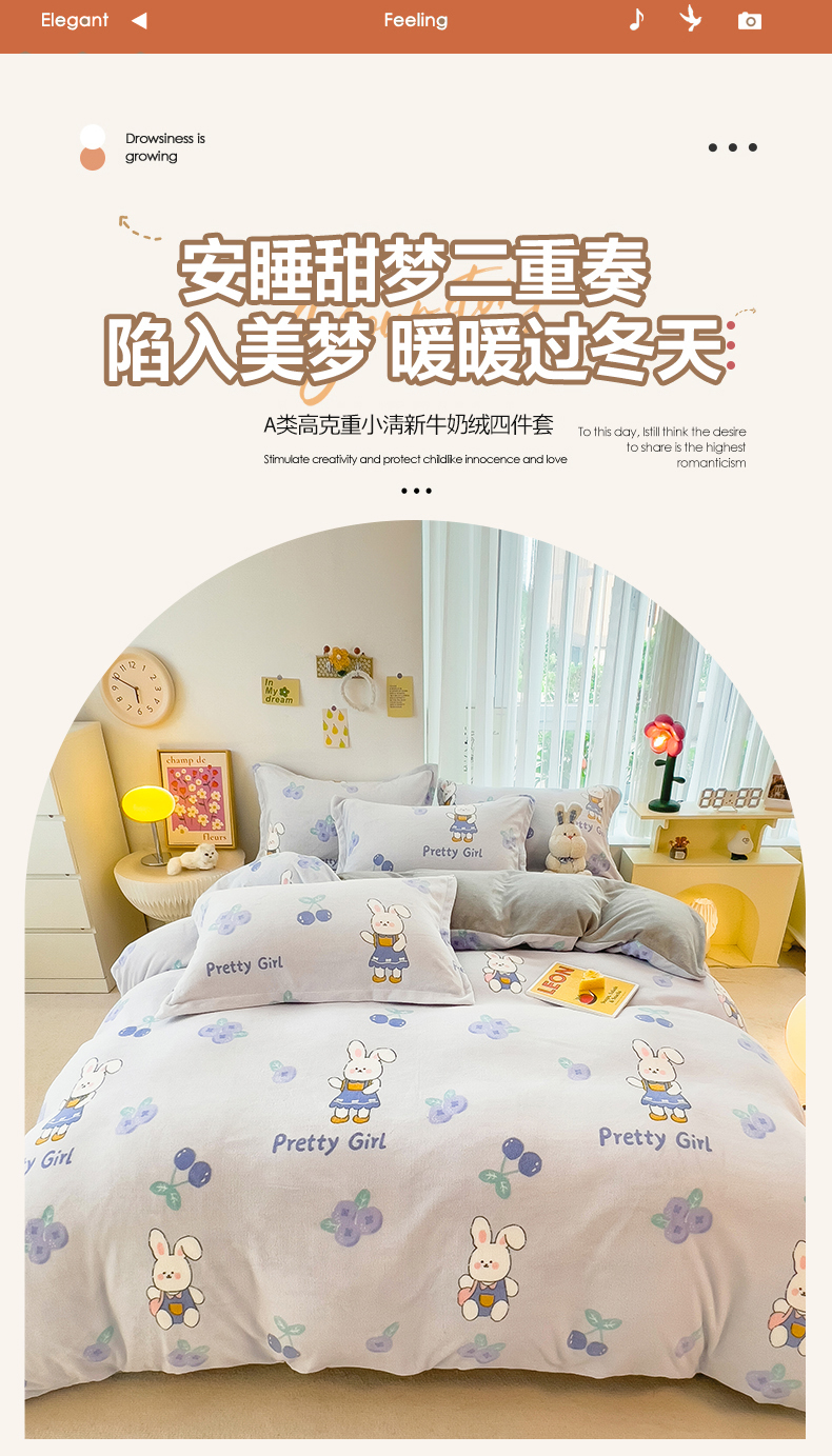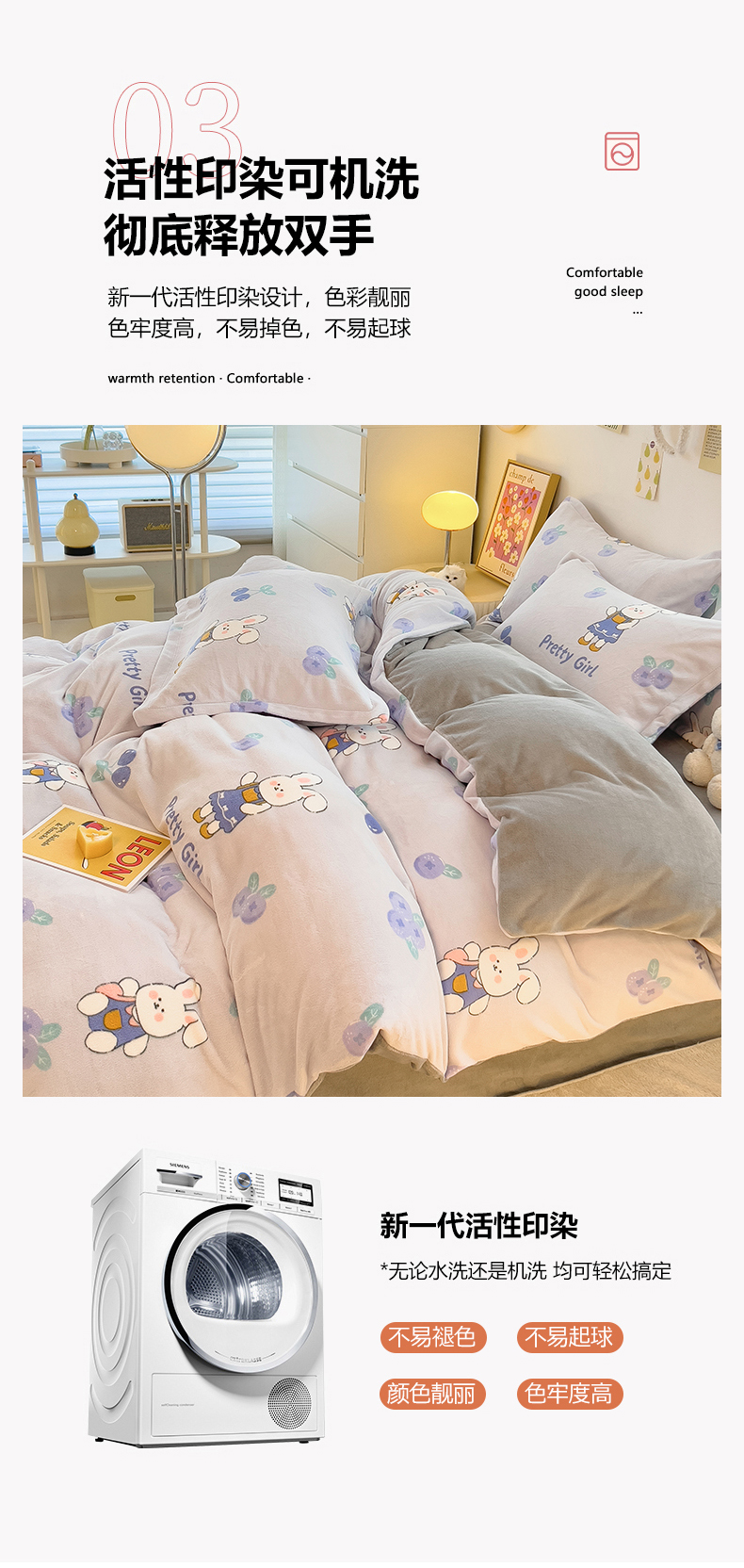 商品名称:全季家居2023新款小清新A类高克重加厚印花牛奶绒四件套 欢乐兔