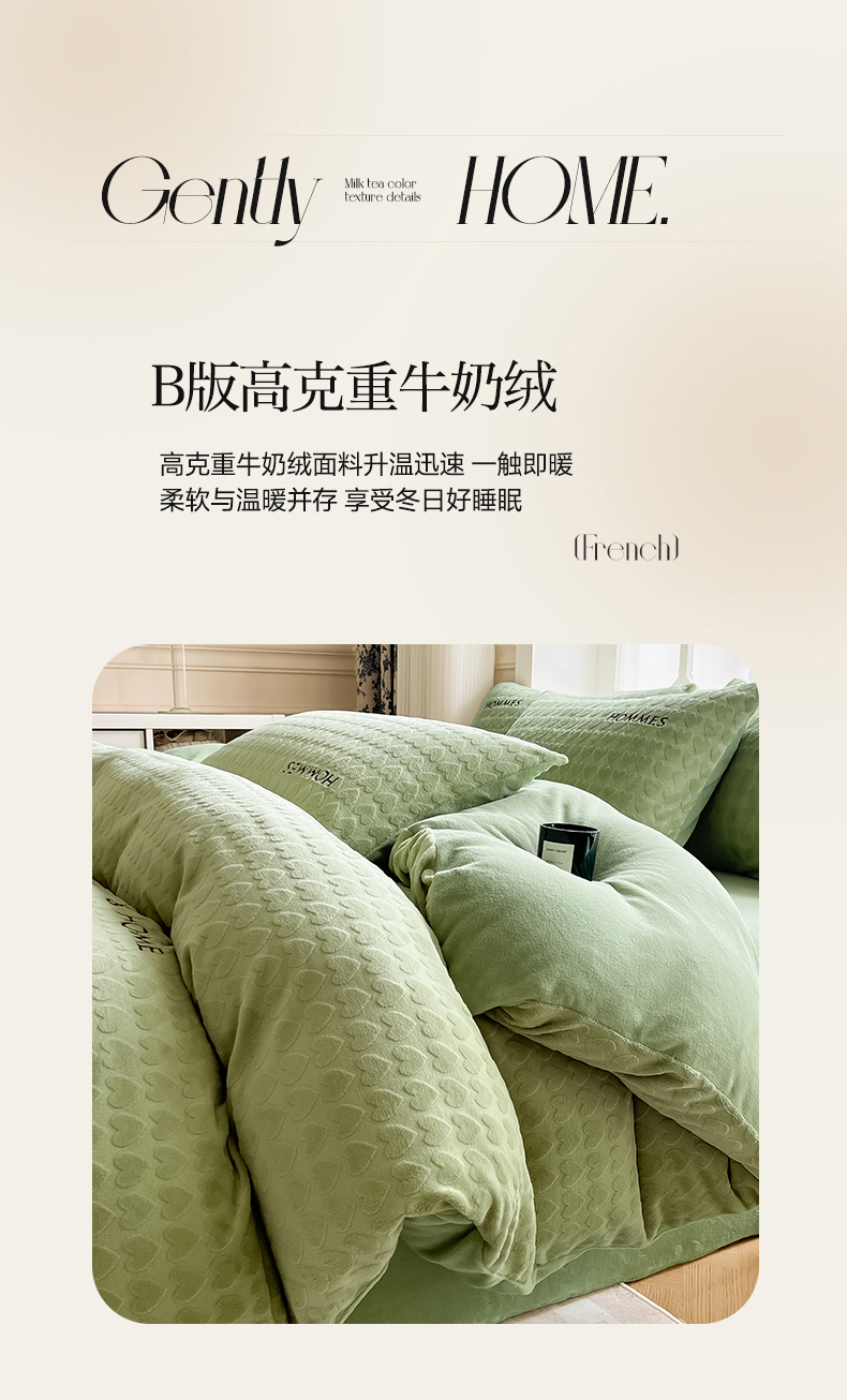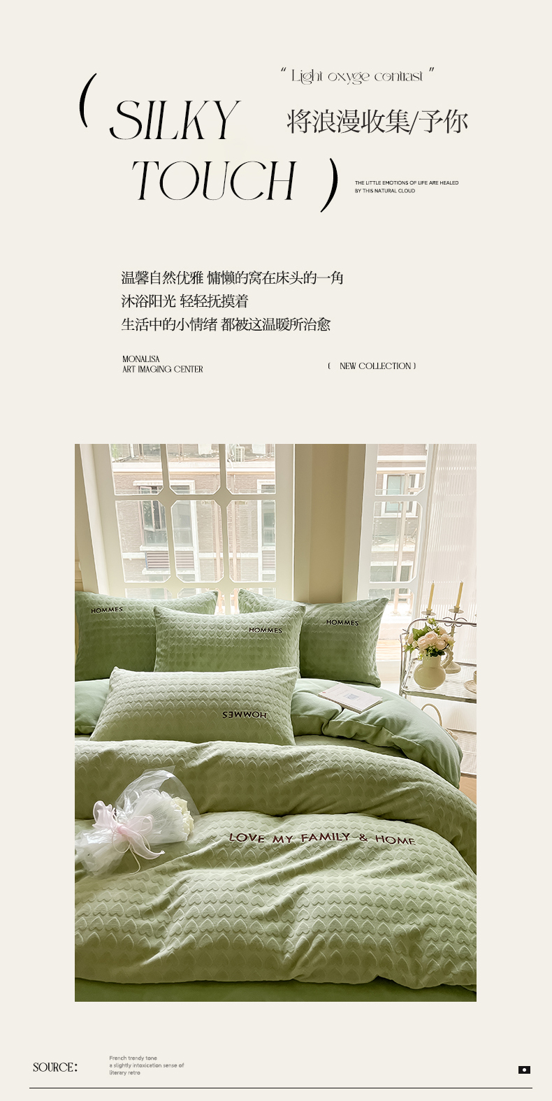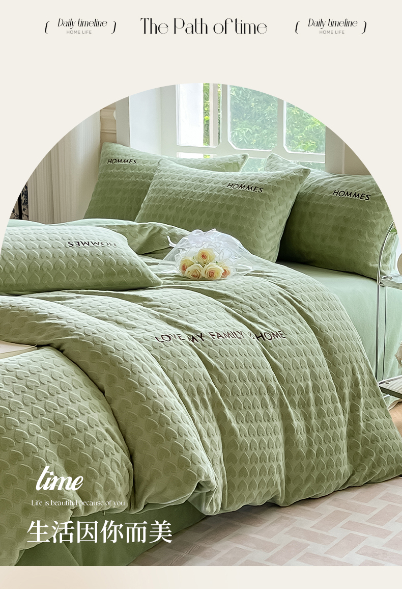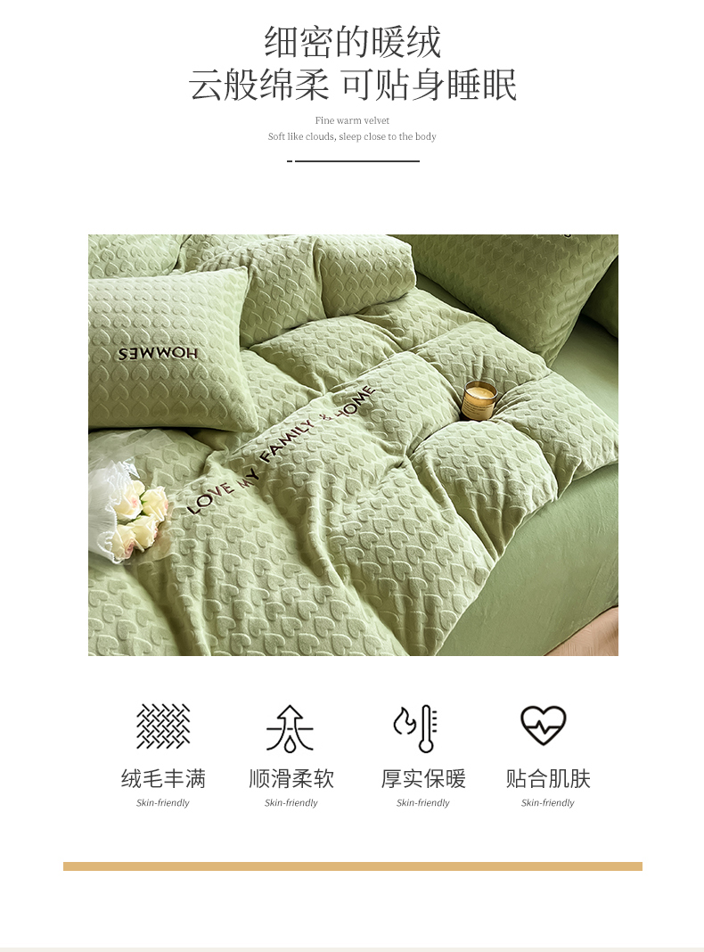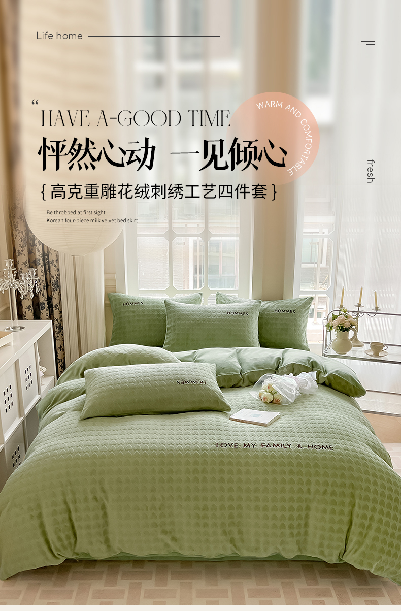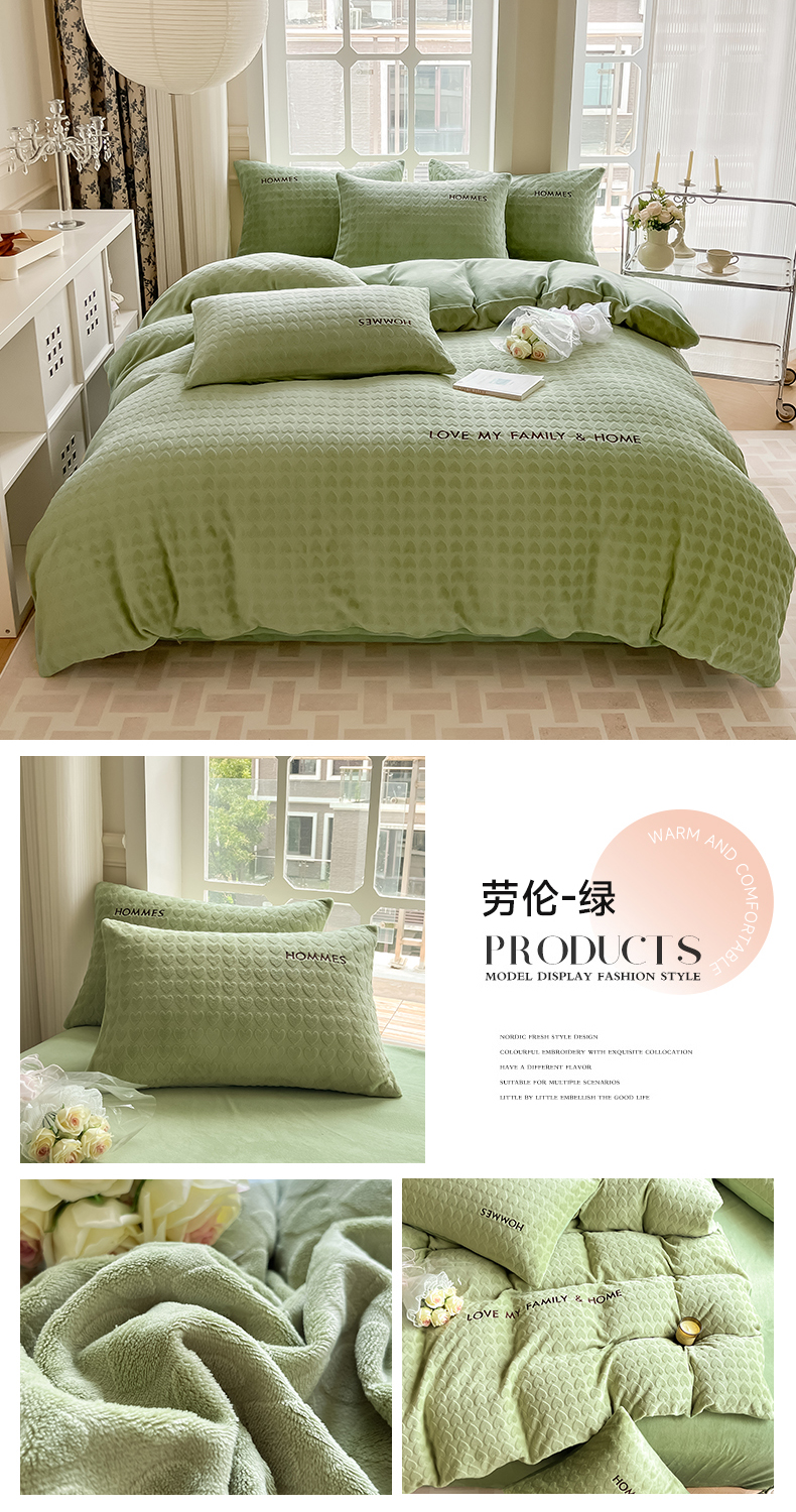 当前位置: 91家纺网 > 商品网购 > 床品套件 > 四件套 > 雕花绒四件套 > 慕尚家纺 2025高克重雕花绒刺绣工艺四件套 劳伦-绿