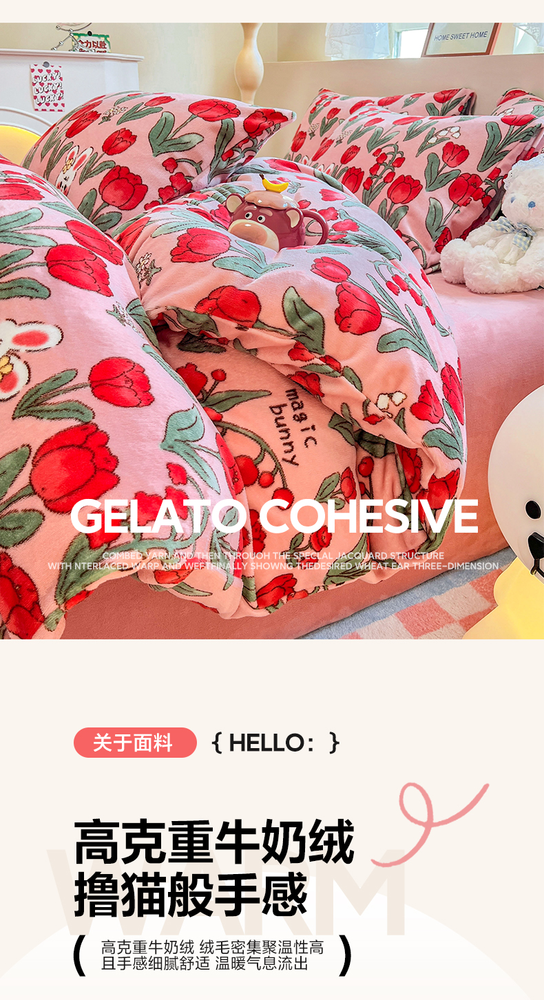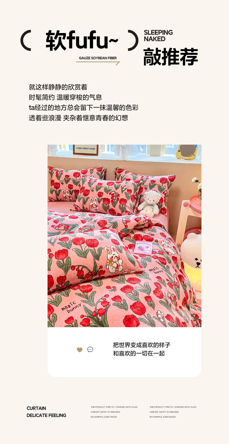 沐辰 2023新款牛奶绒印花四件套 花丛兔兔
