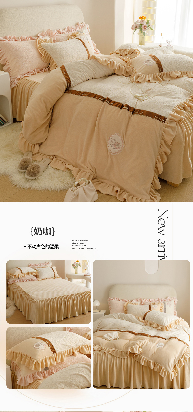 • 91家纺网 家纺一手货源 找家纺 胜权家纺   2023秋冬新款加厚牛奶绒5D雕花刺绣夹棉单床裙单件保暖床裙三件套四件套 奶咖