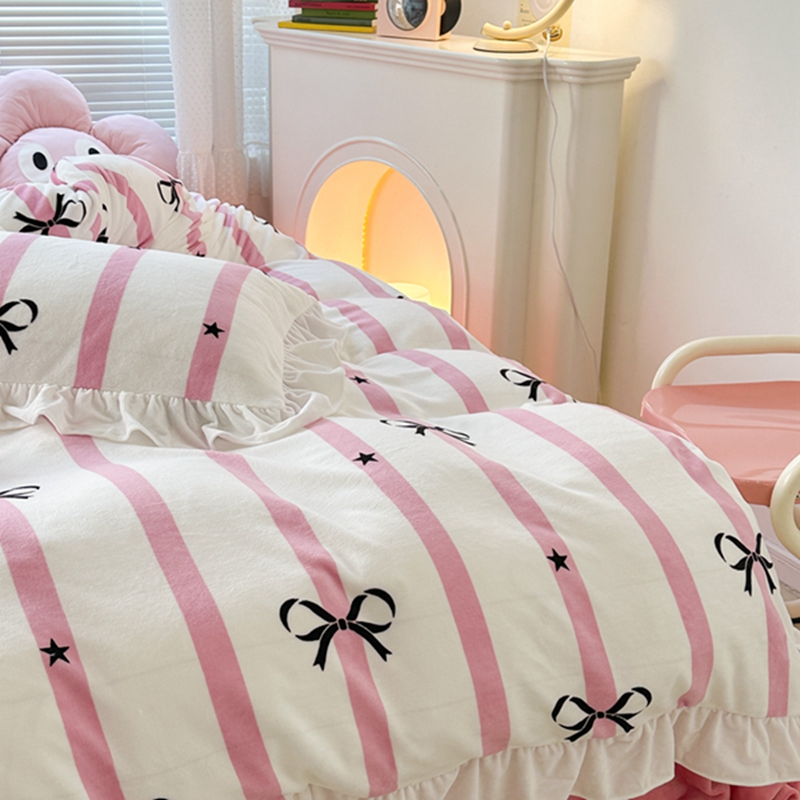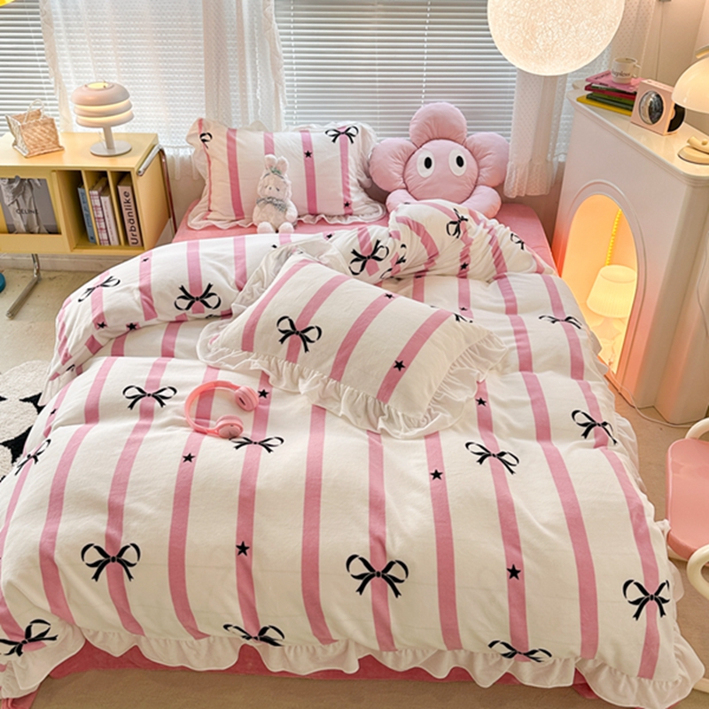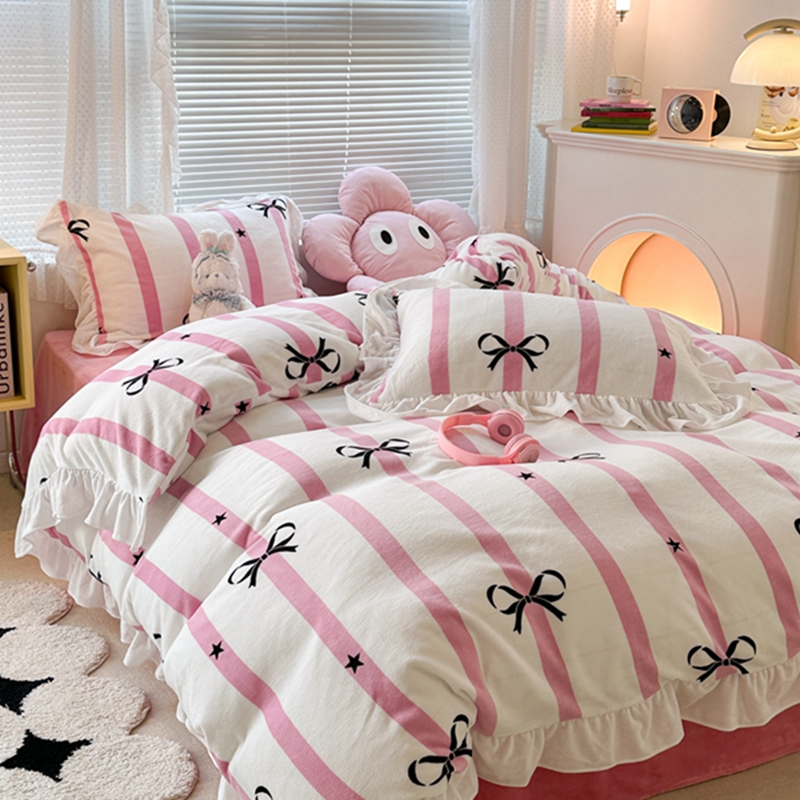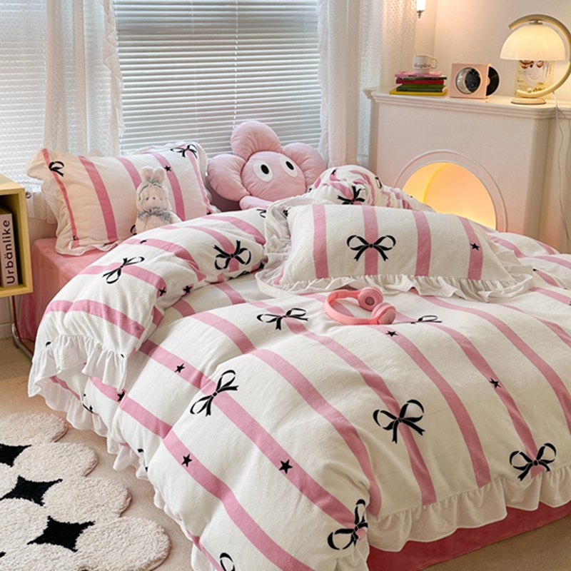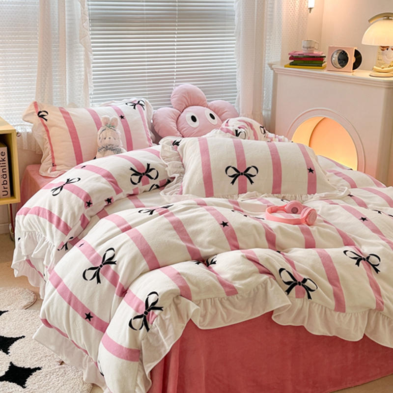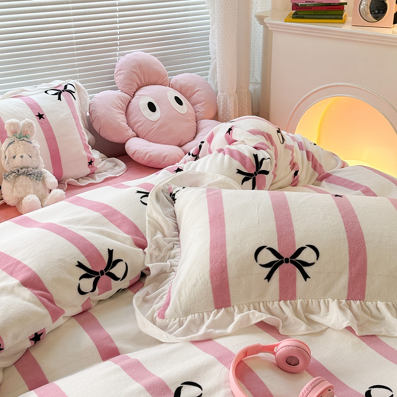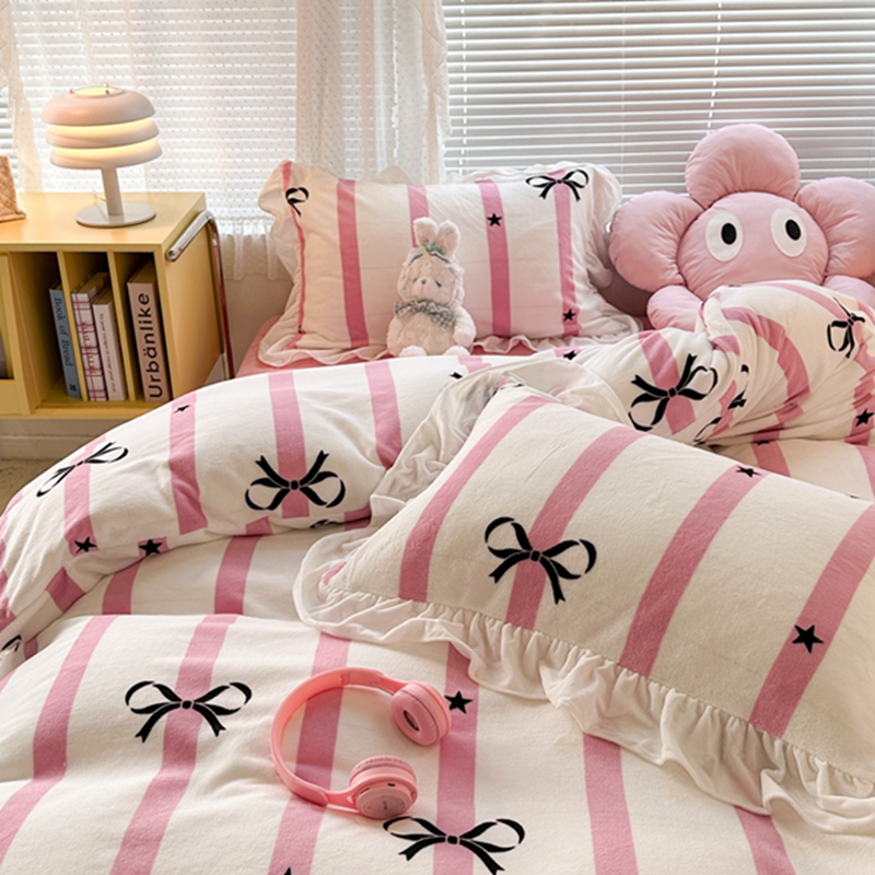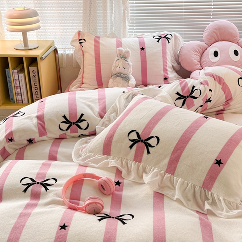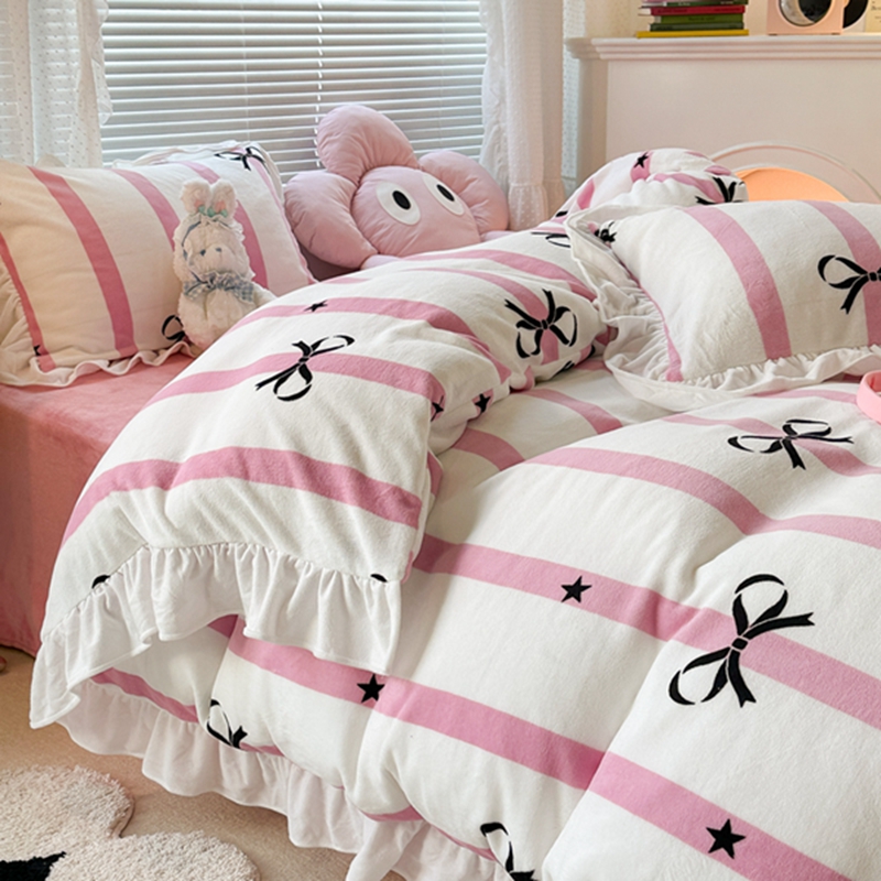昔可家纺 2023新款花边款牛奶绒四件套 粉条星星蝴蝶结