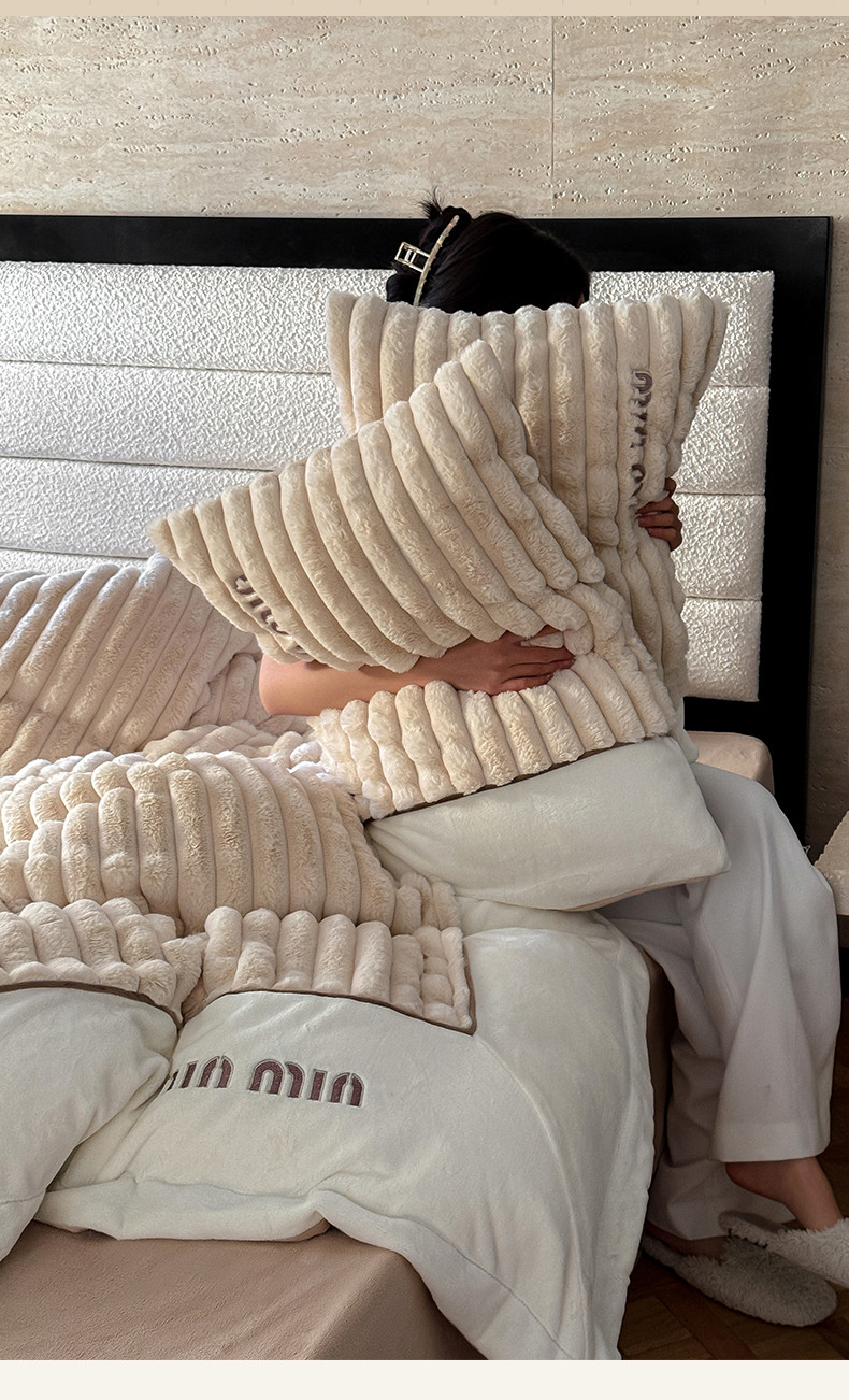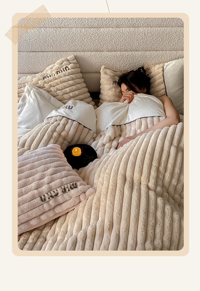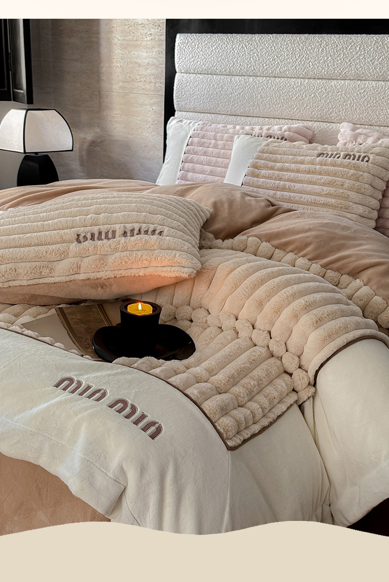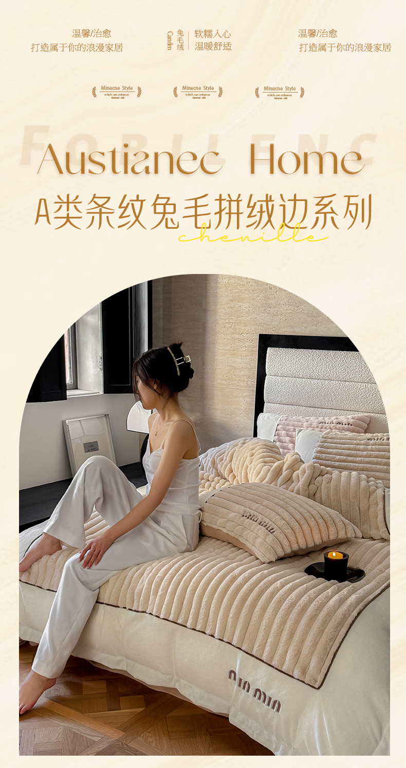 名品优仓 2024新款条纹兔绒拼绒边四件套-安露丝 安露丝-奶咖