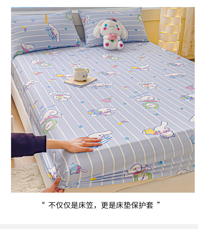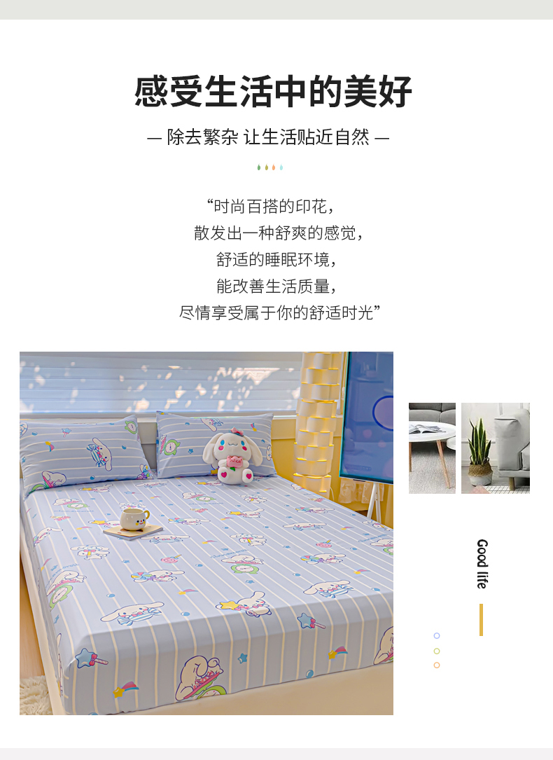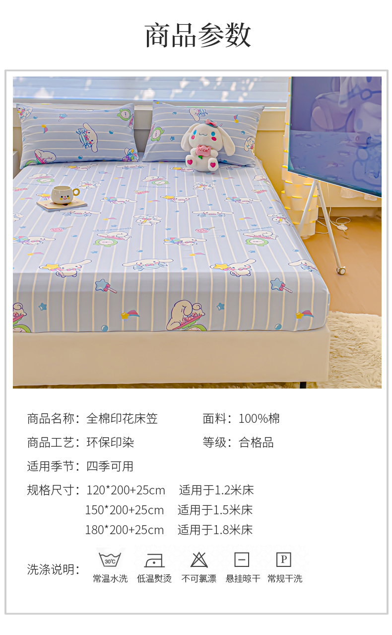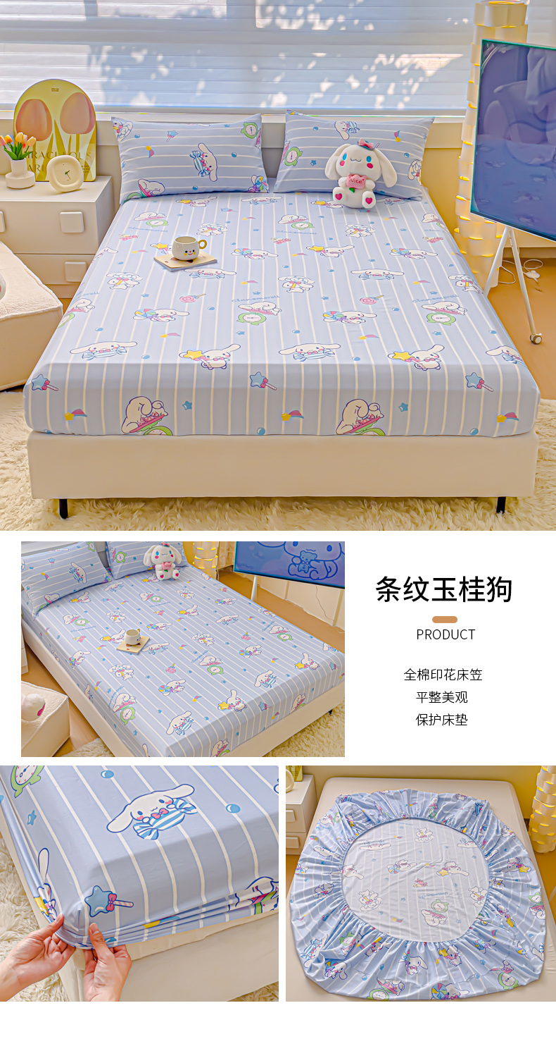 • 91家纺网 家纺一手货源 找家纺 金丝鸟家纺 2024新款全棉三丽鸥系列床笠 条纹玉桂狗