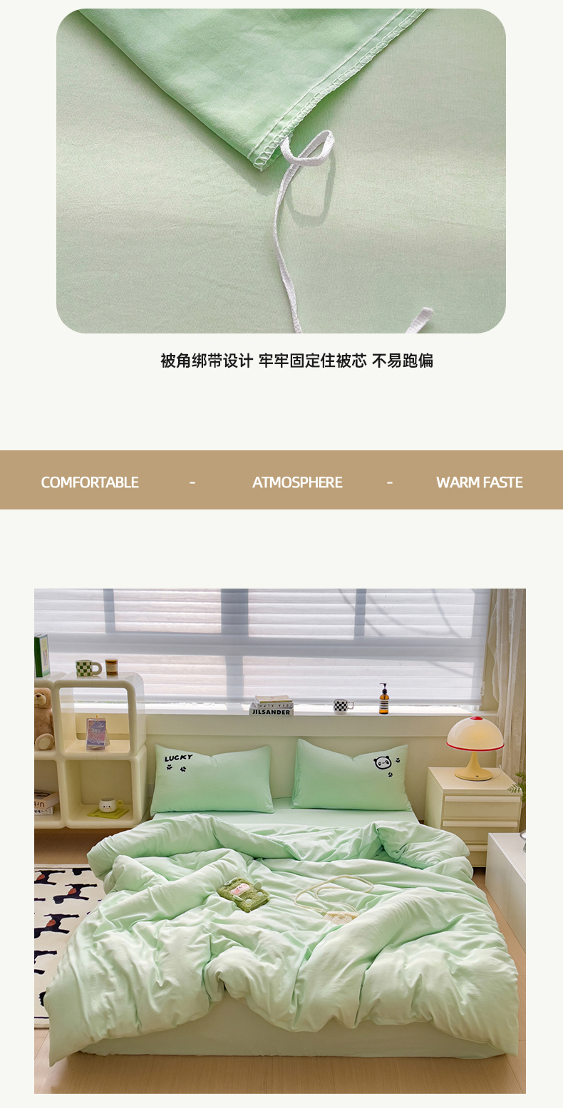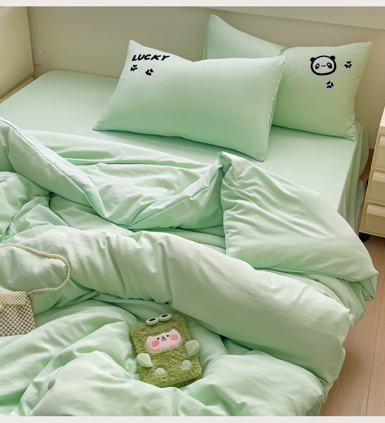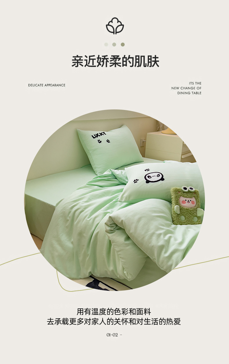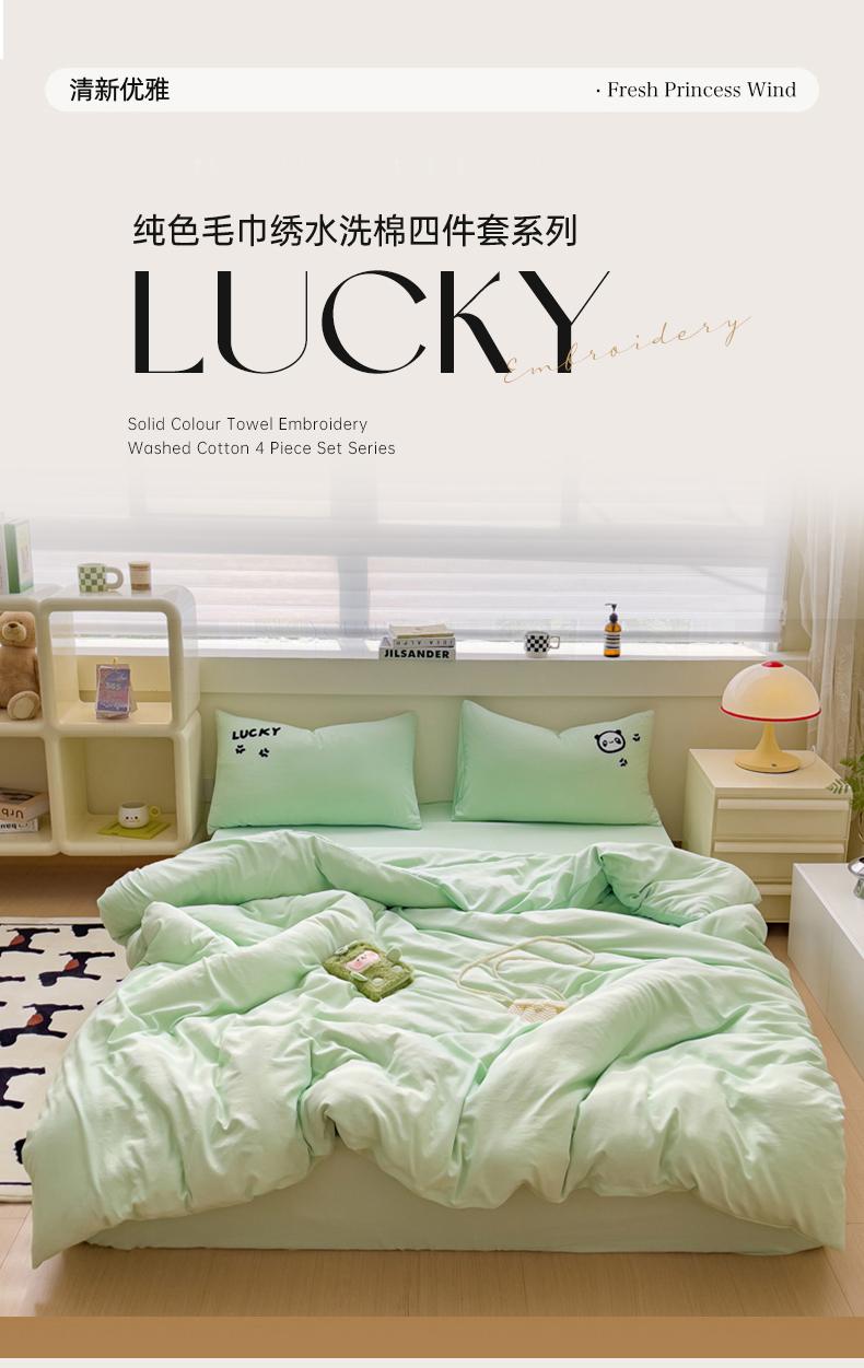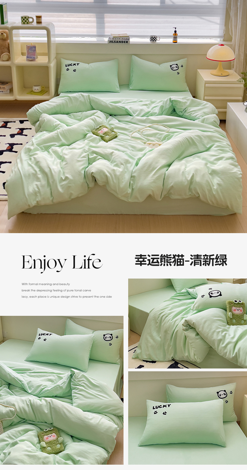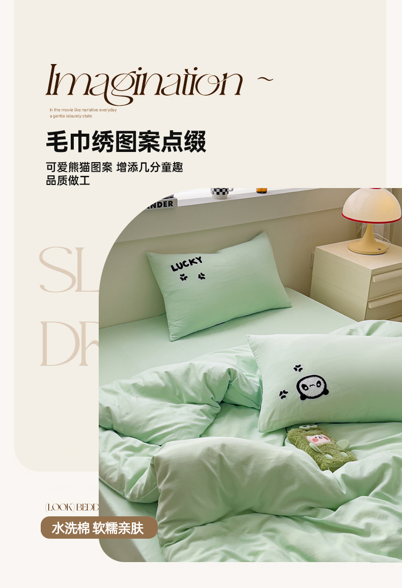 梦嘉居 2024新款直播热款A类ins风多巴胺色超柔亲肤磨毛纯色水洗棉毛巾绣套件-单床笠 幸运熊猫-清新绿