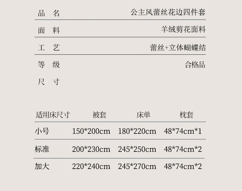 商品名称:(总) 庭笙 新款公主风蕾丝花边羊绒剪花四件套-艾莉亚