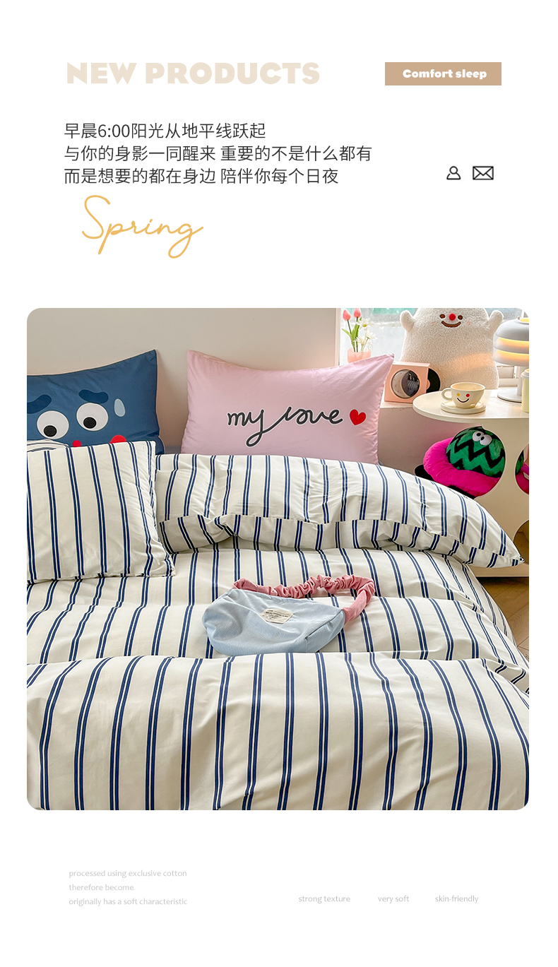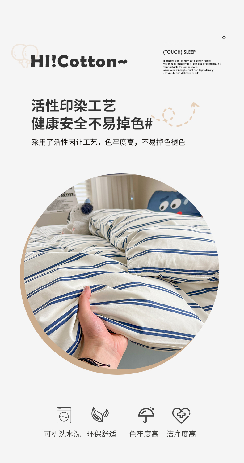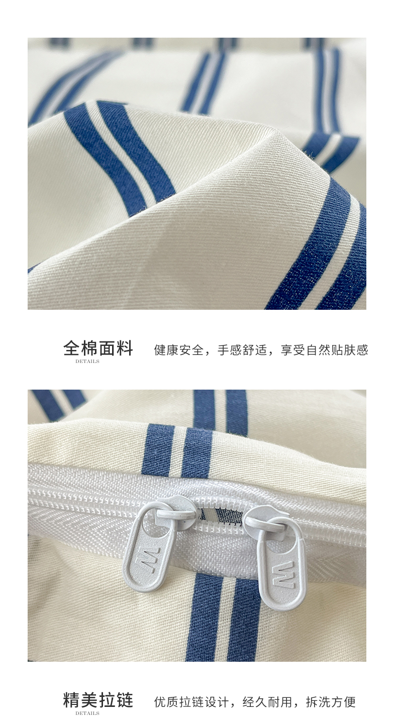 2024新款大版枕套数码印花全棉四件套 蓝竖条