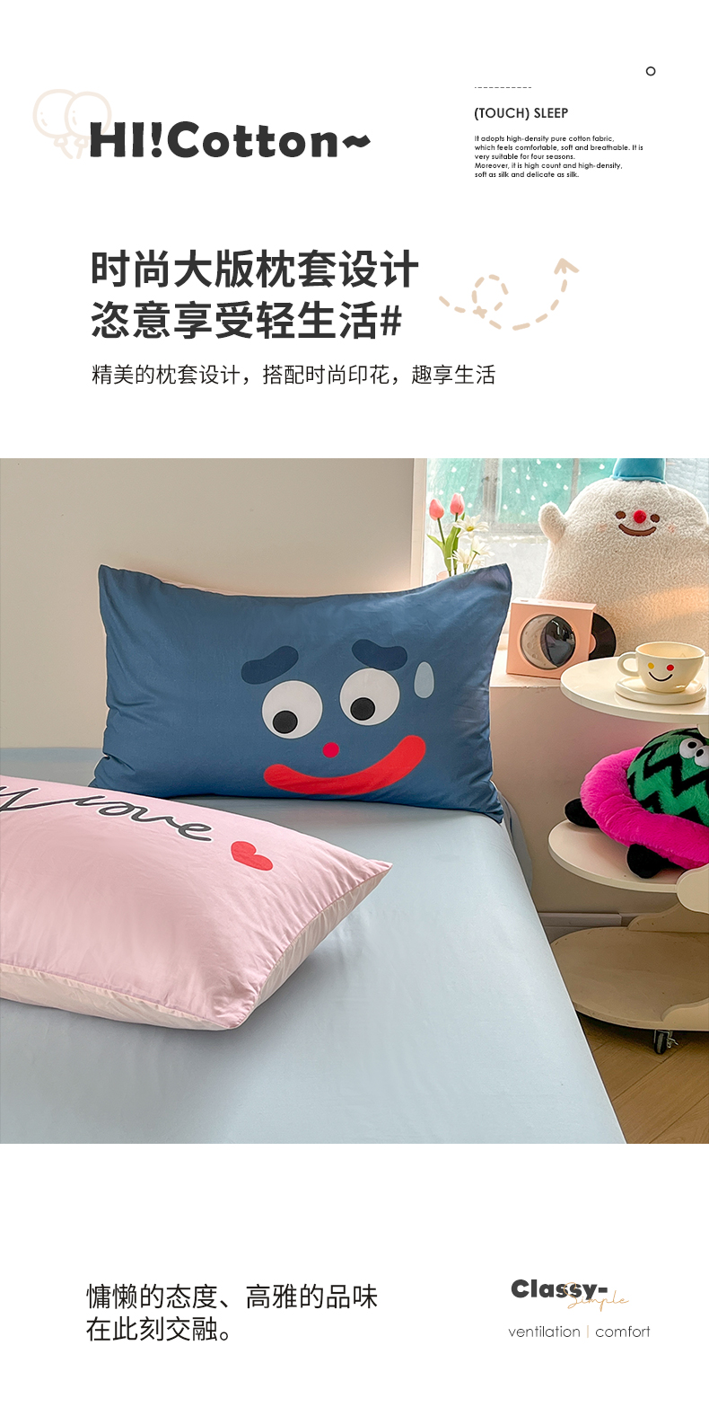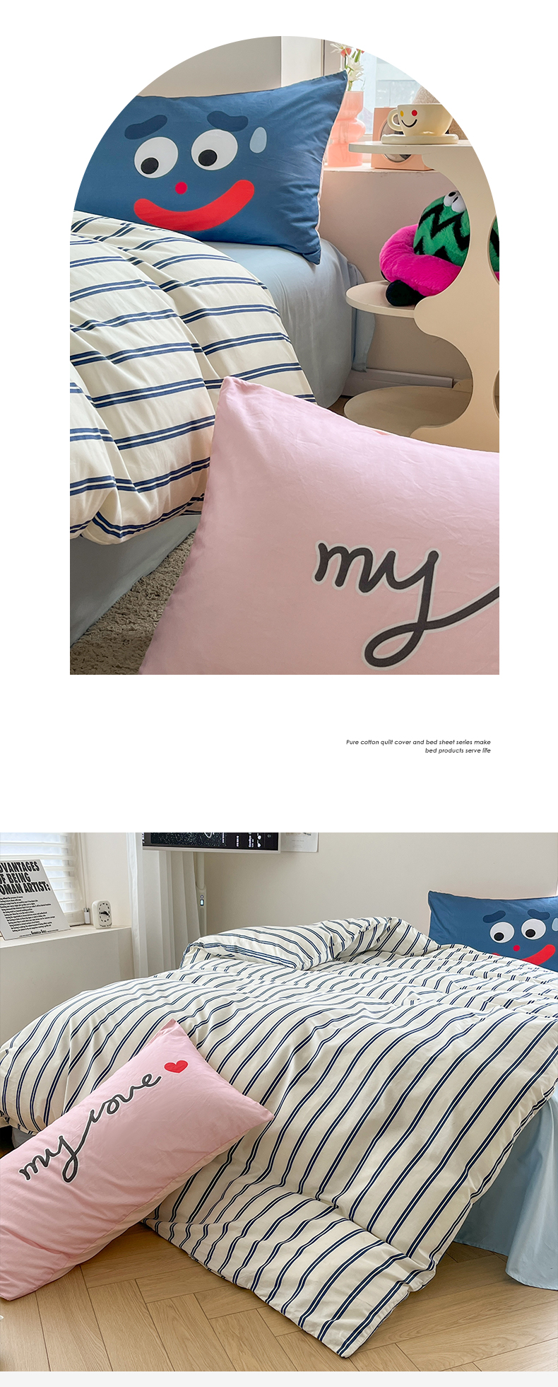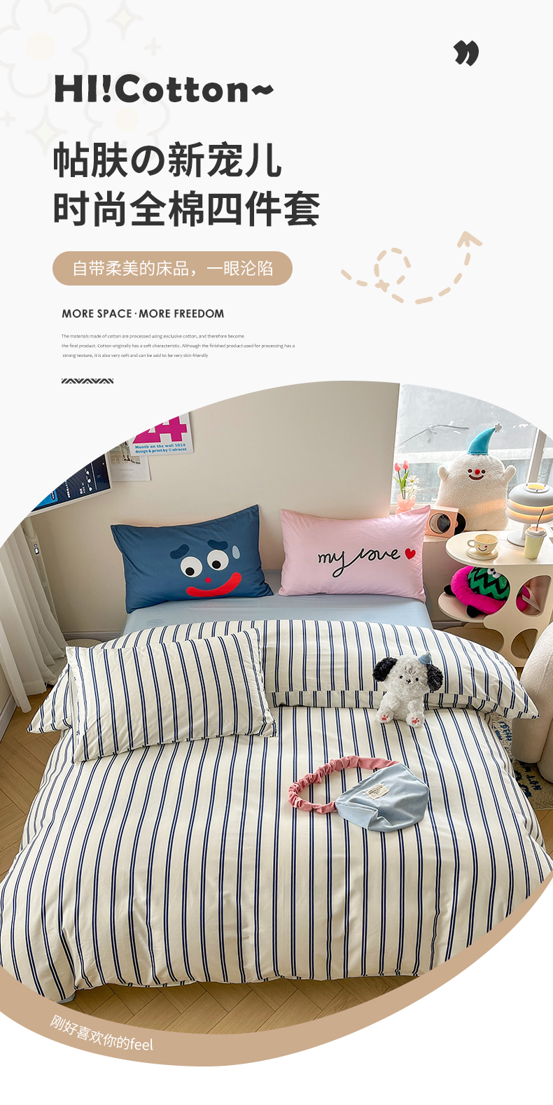 2024新款大版枕套数码印花全棉四件套 蓝竖条