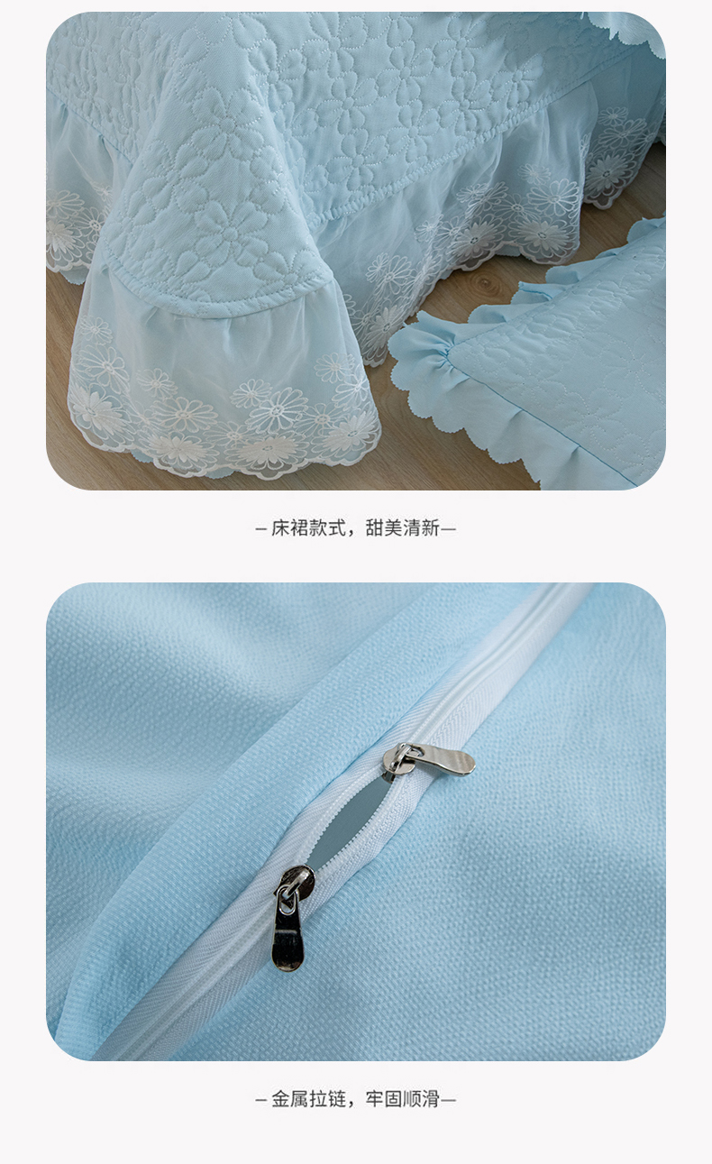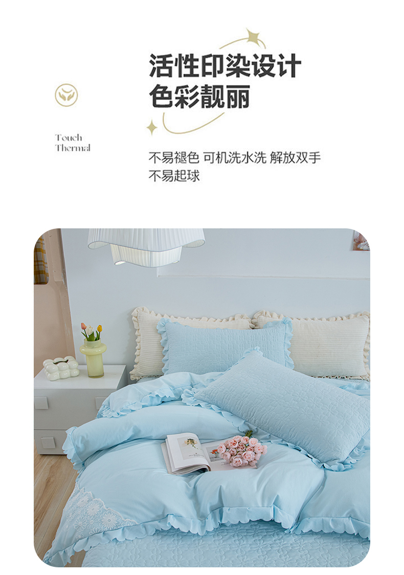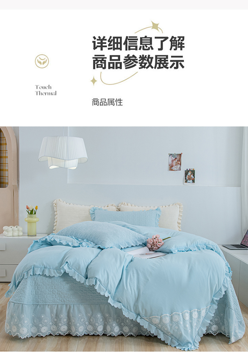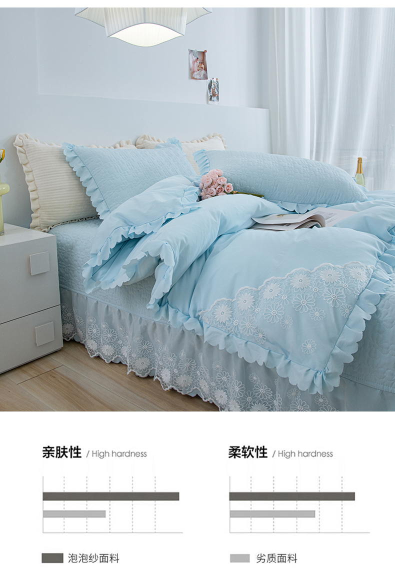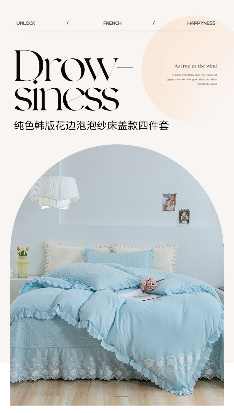 商品名称:乐嘉盈2025新款纯色水洗棉麻韩版花边泡泡纱床盖款四件套 蓝色