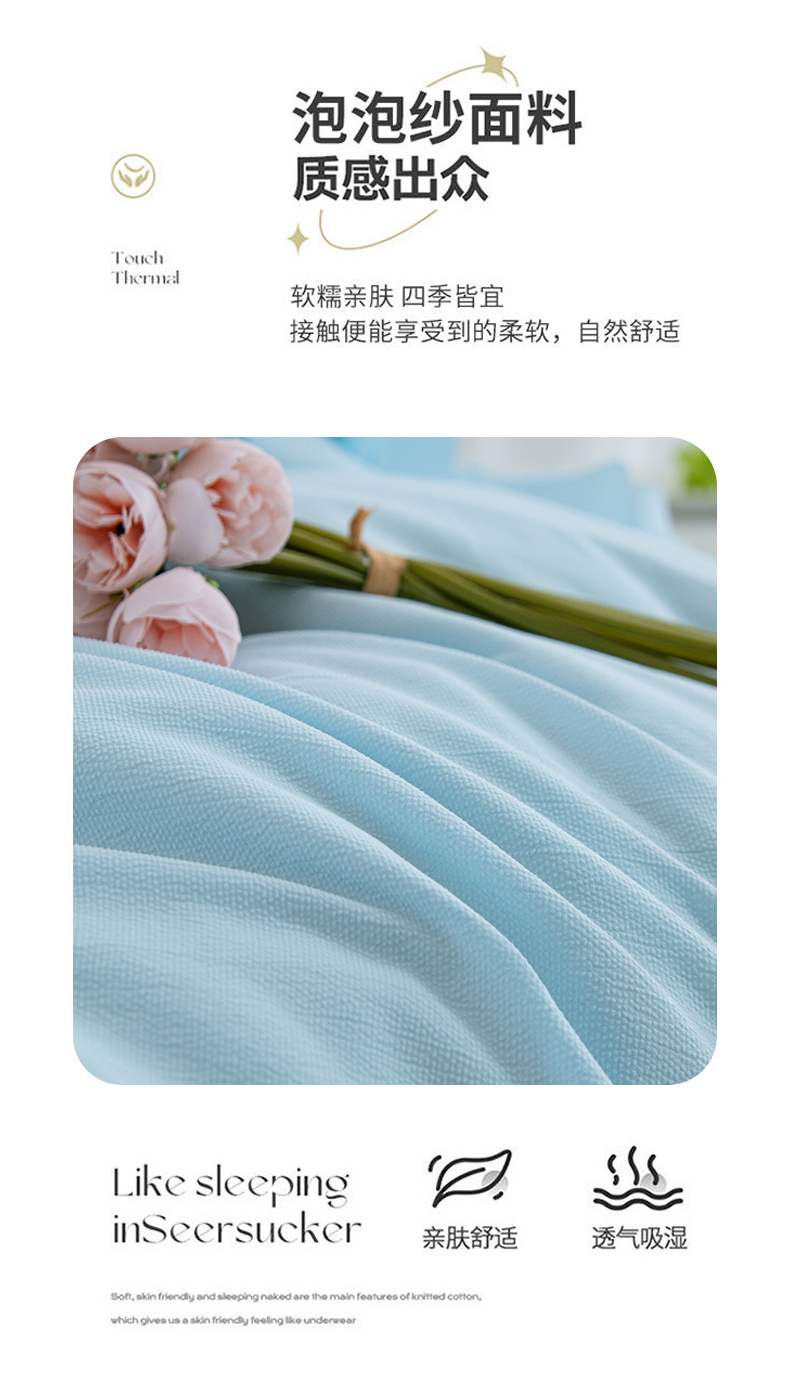(总)乐嘉盈2025新款纯色水洗棉麻韩版花边泡泡纱床盖款四件套,粉色,紫色,绿色,蓝色