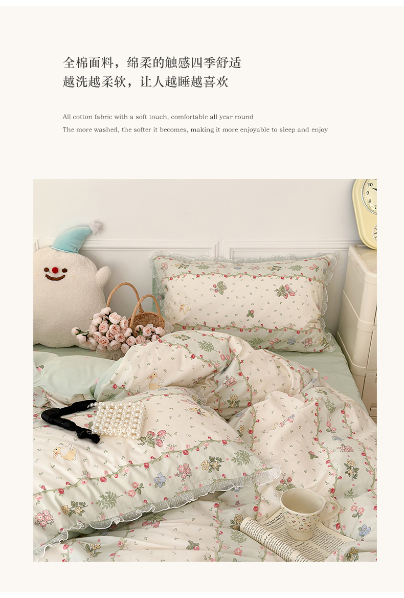 昔可家纺 2024新款全棉仙仙雪纺纱花边四件套 草莓小兔