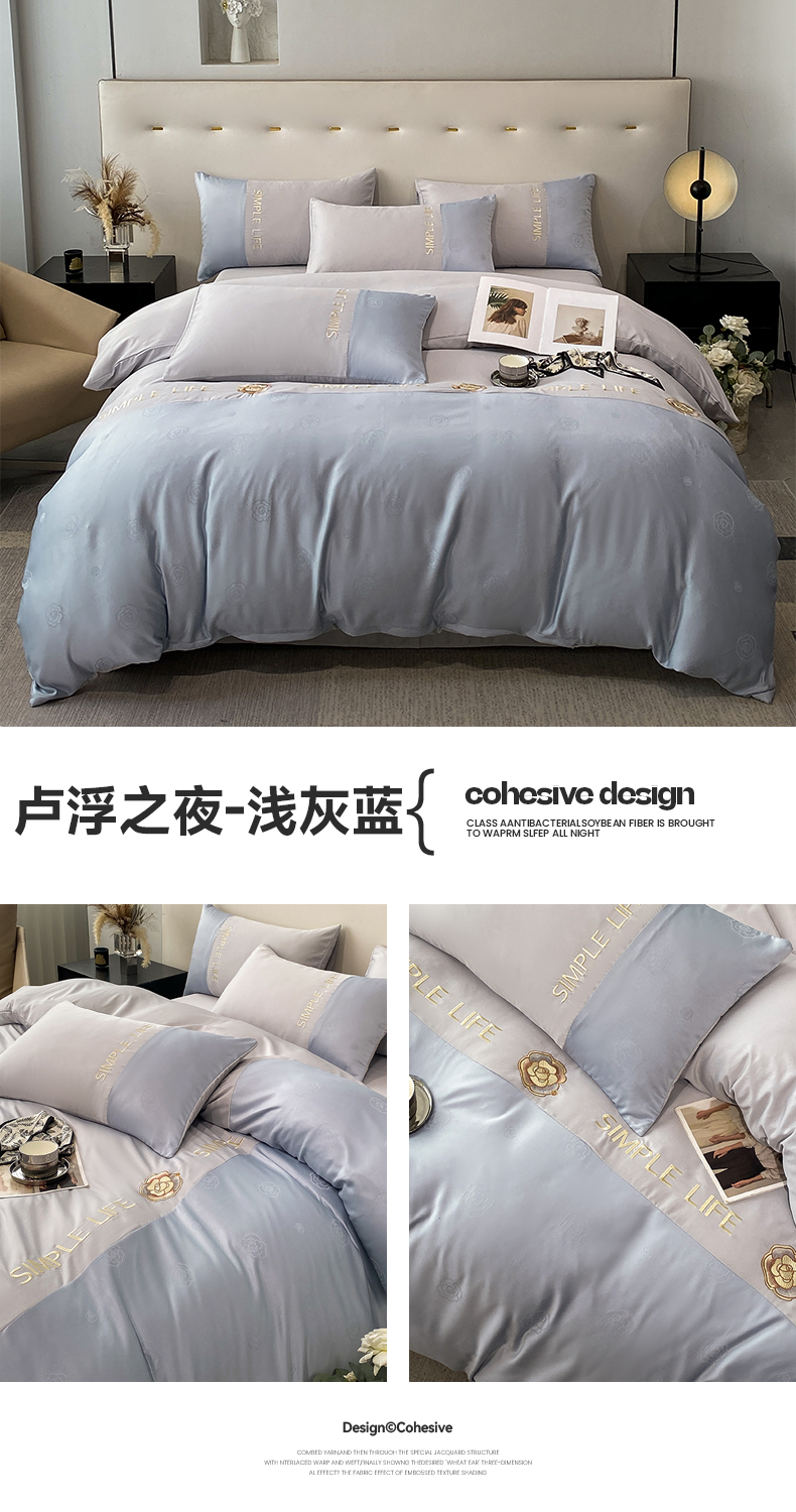 商品名称:澳梵 新款水洗真丝刺绣四件套【卢浮之夜】 卢浮之夜-浅灰蓝