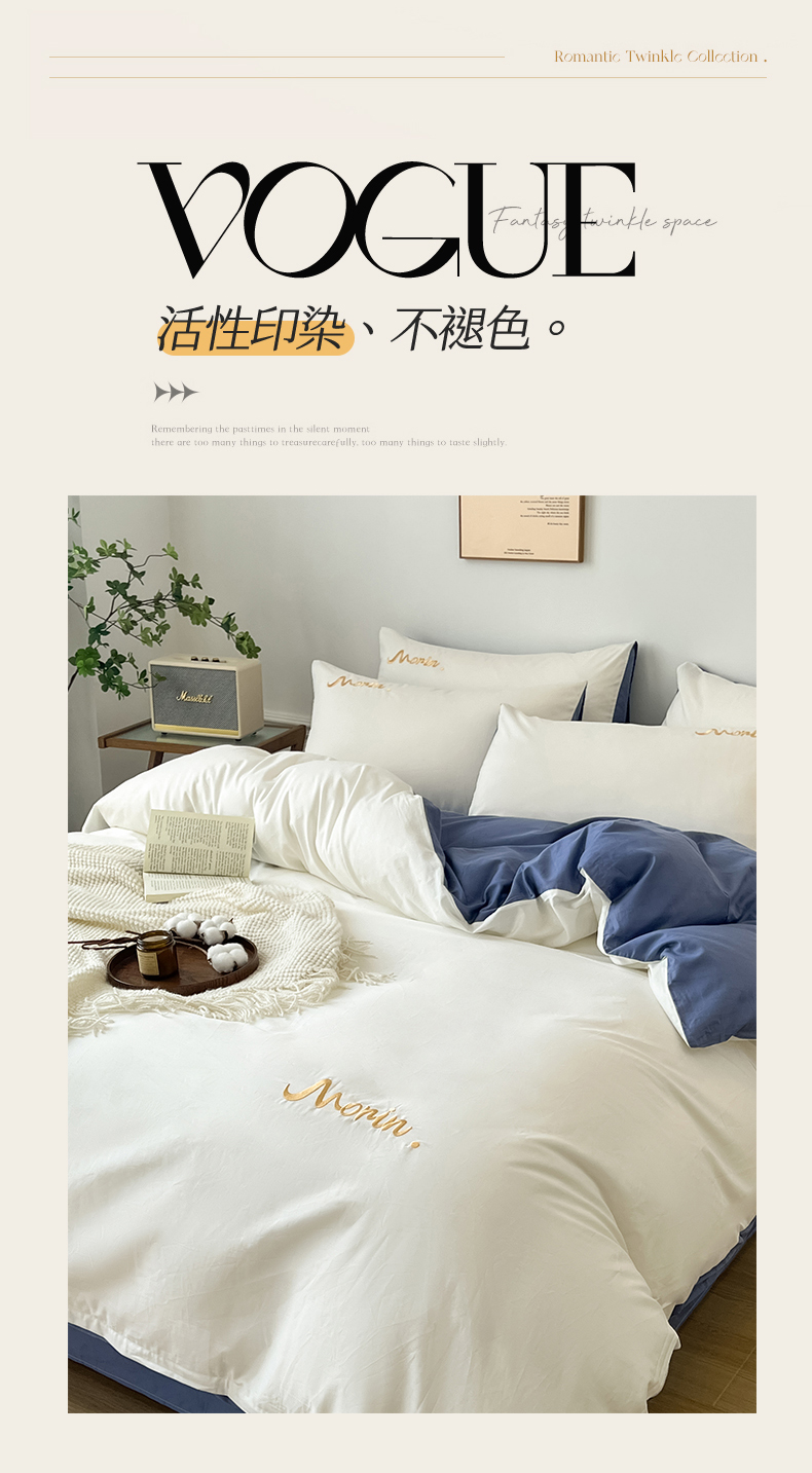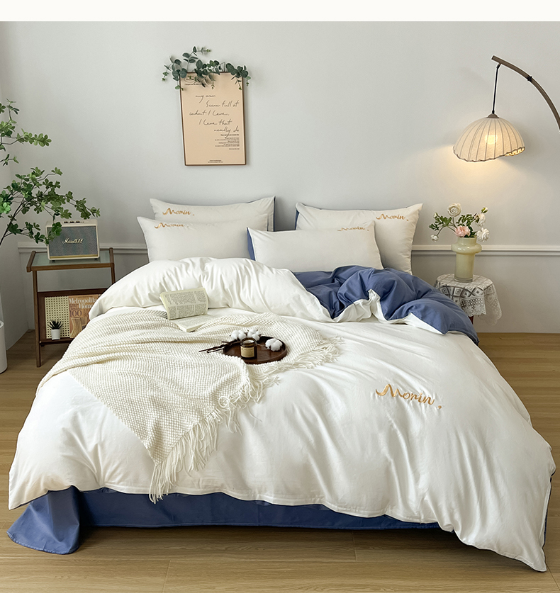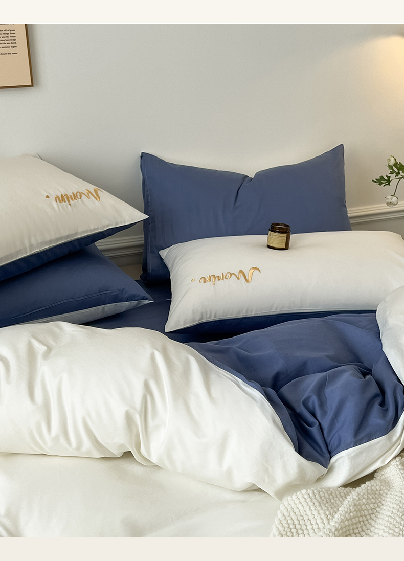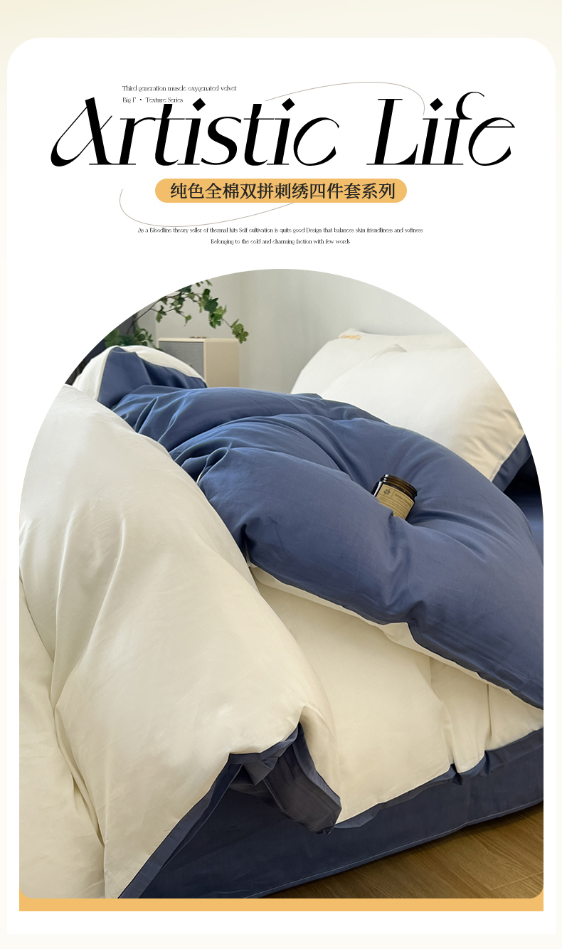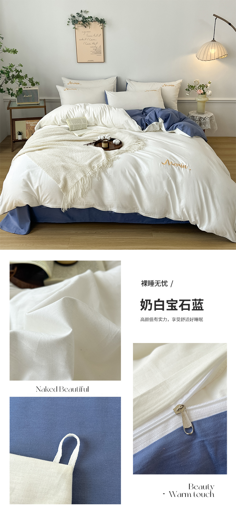 多品家纺 2024新款全棉纯色双拼刺绣四件套 奶白宝石蓝