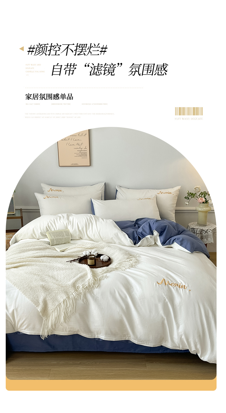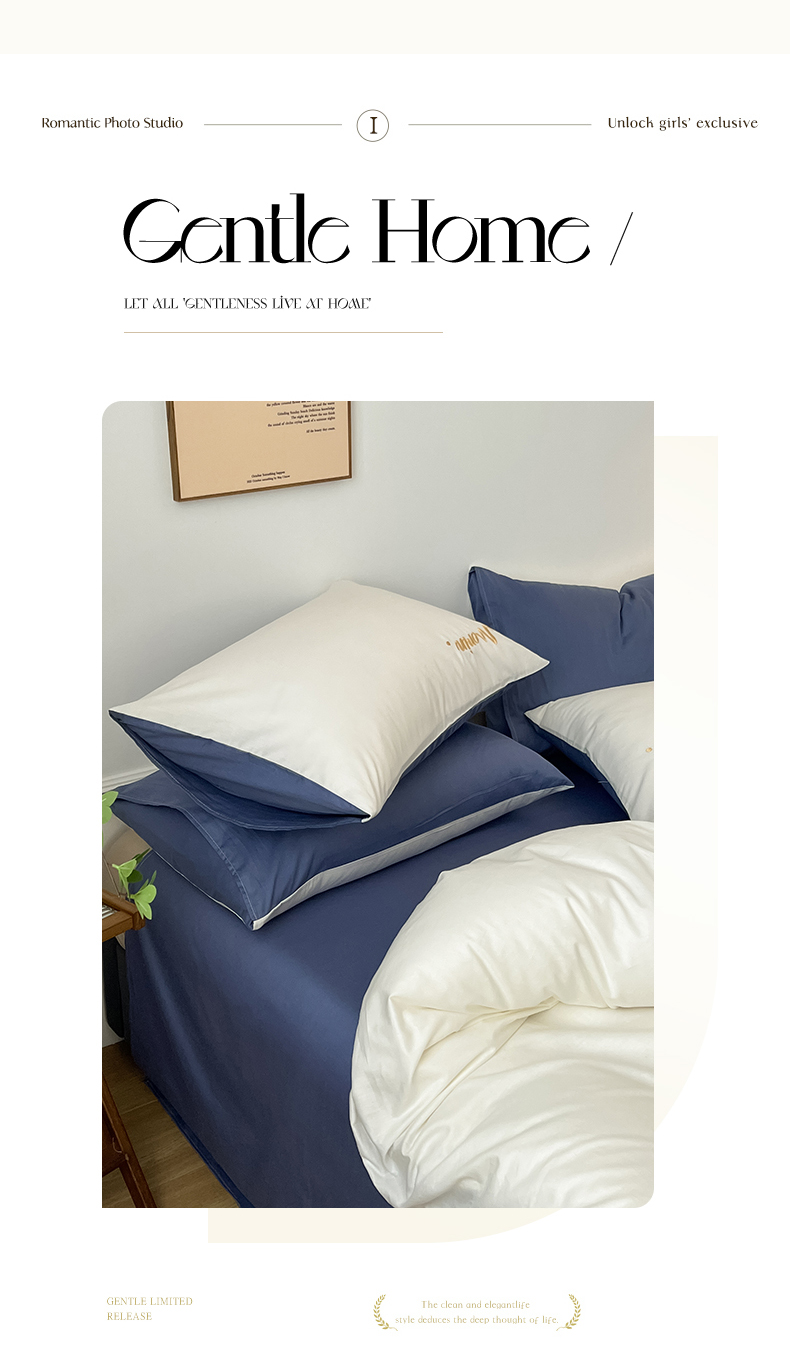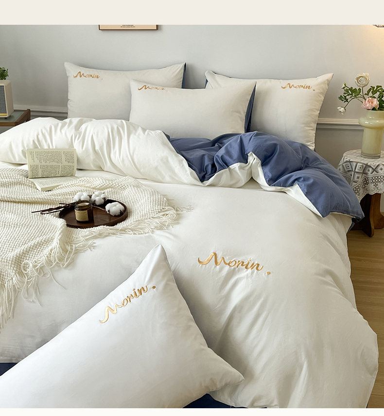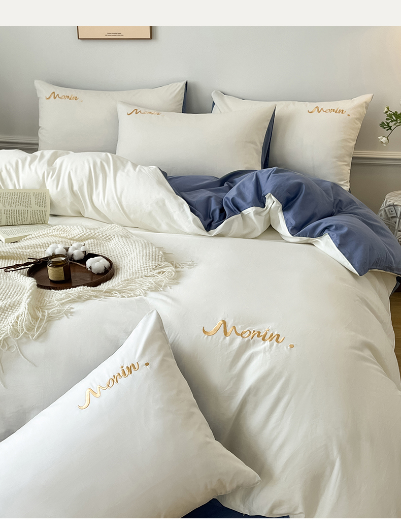 多品家纺 2024新款全棉纯色双拼刺绣四件套 奶白宝石蓝