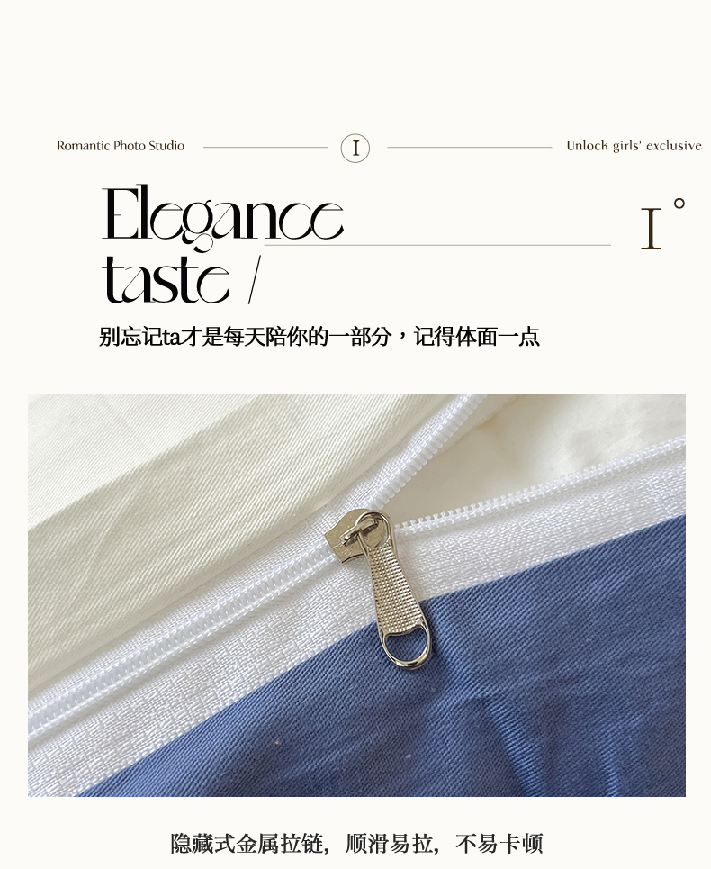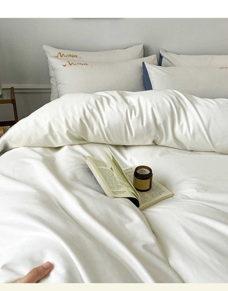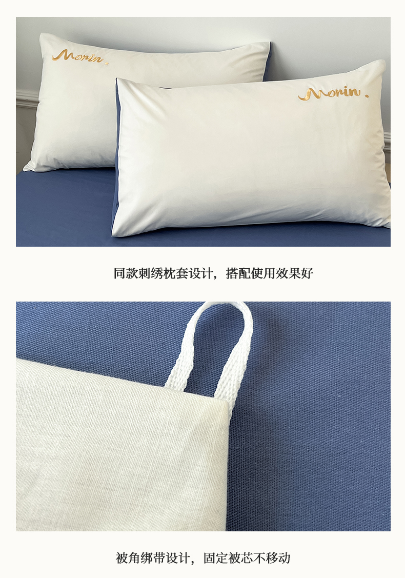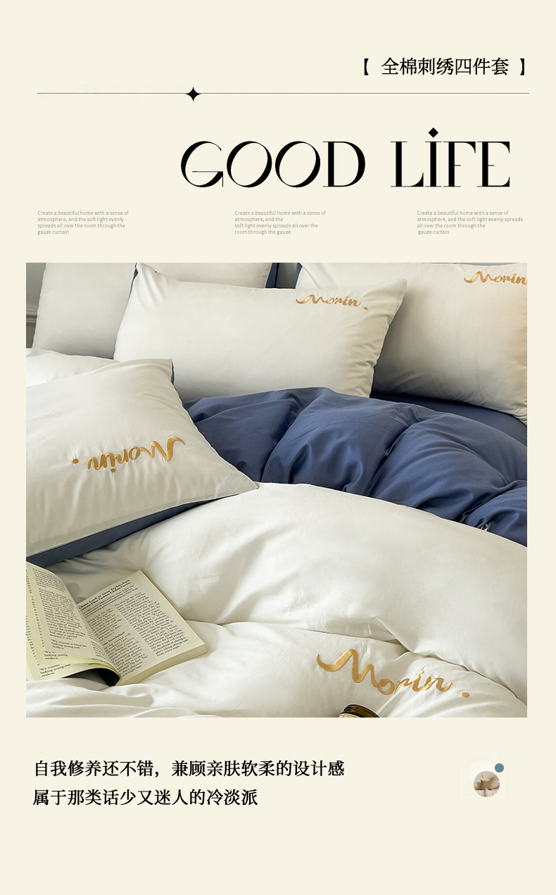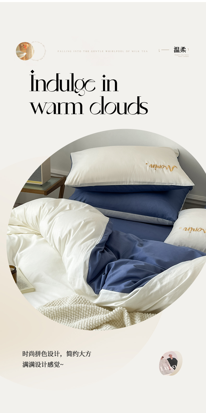 多品家纺 2024新款全棉纯色双拼刺绣四件套 奶白宝石蓝