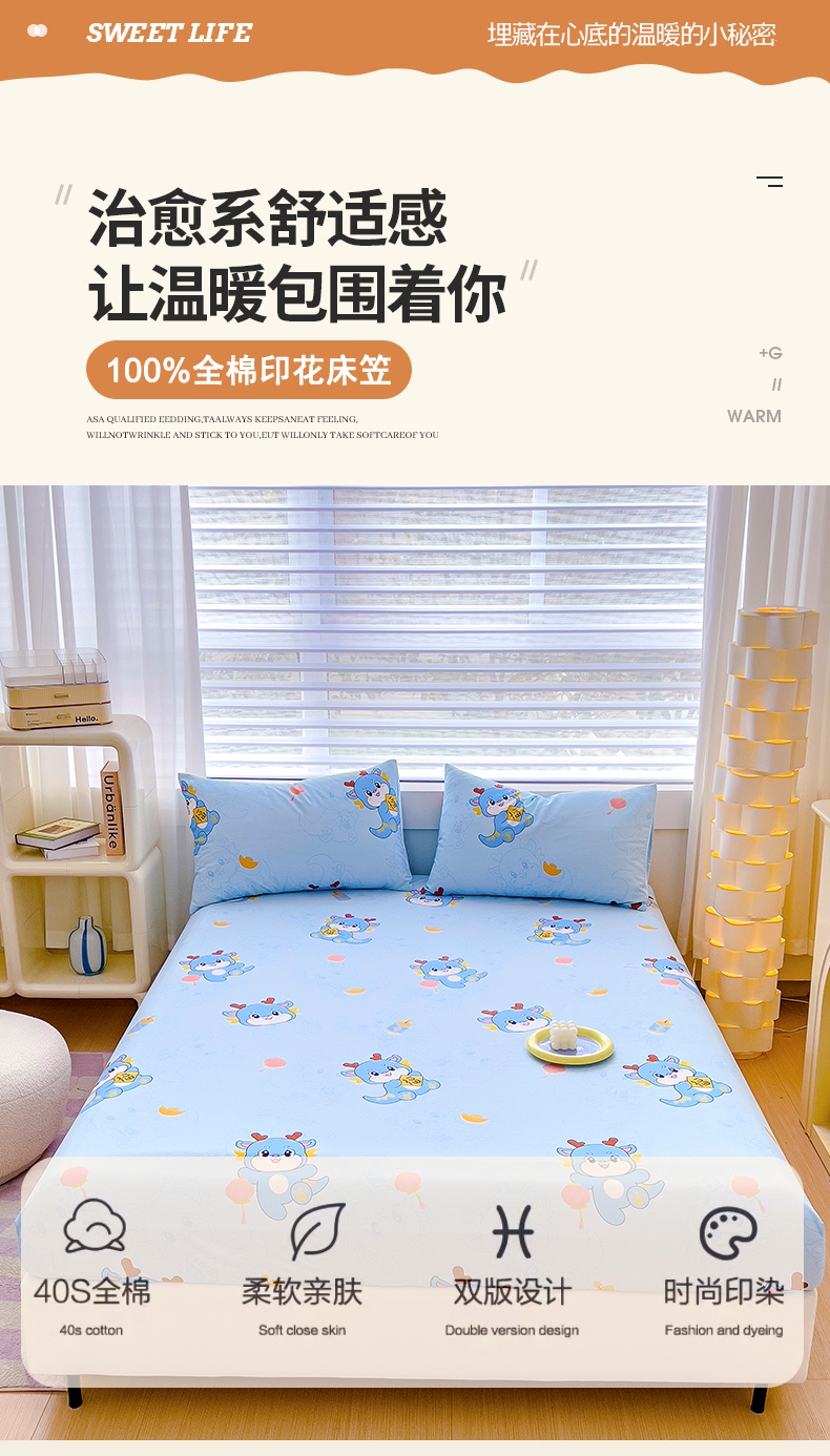商品名称:金鑫汇家纺 2024新款全棉卡通印花单品床笠系列 瑞龙送福