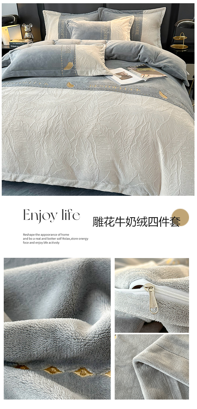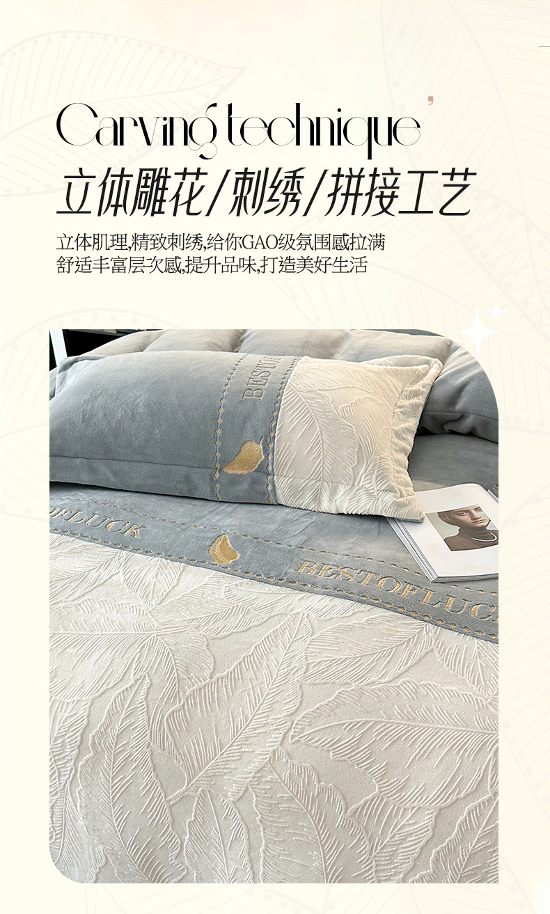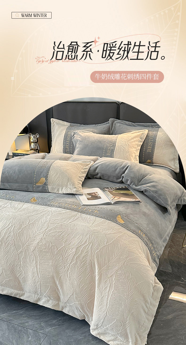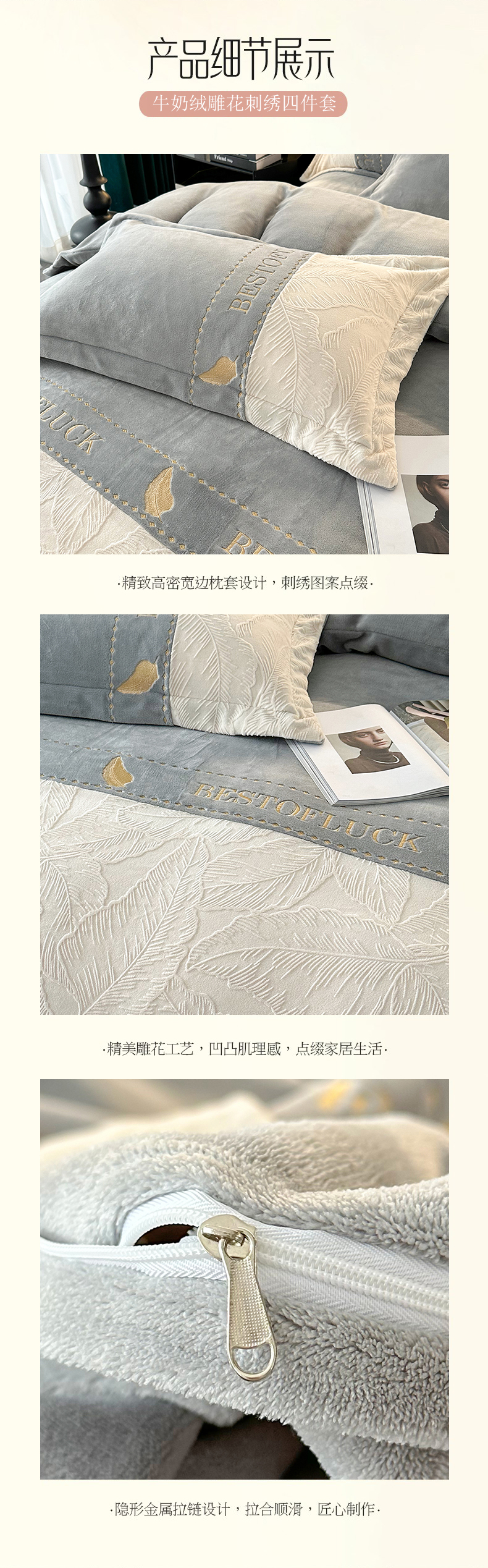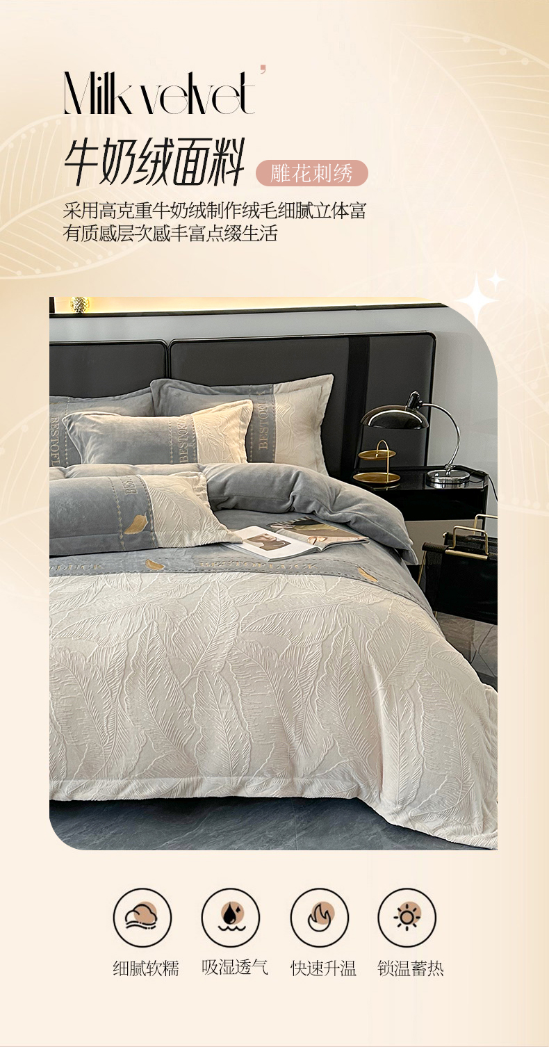莱凯家纺 2025新款牛奶绒雕花刺绣四件套-叶屿 叶屿-灰
