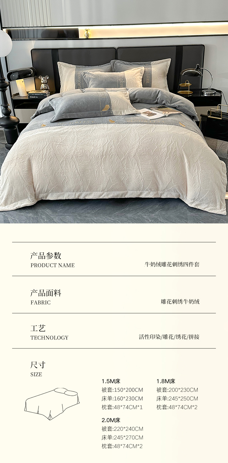 商品名称:莱凯家纺 2025新款牛奶绒雕花刺绣四件套-叶屿 叶屿-灰