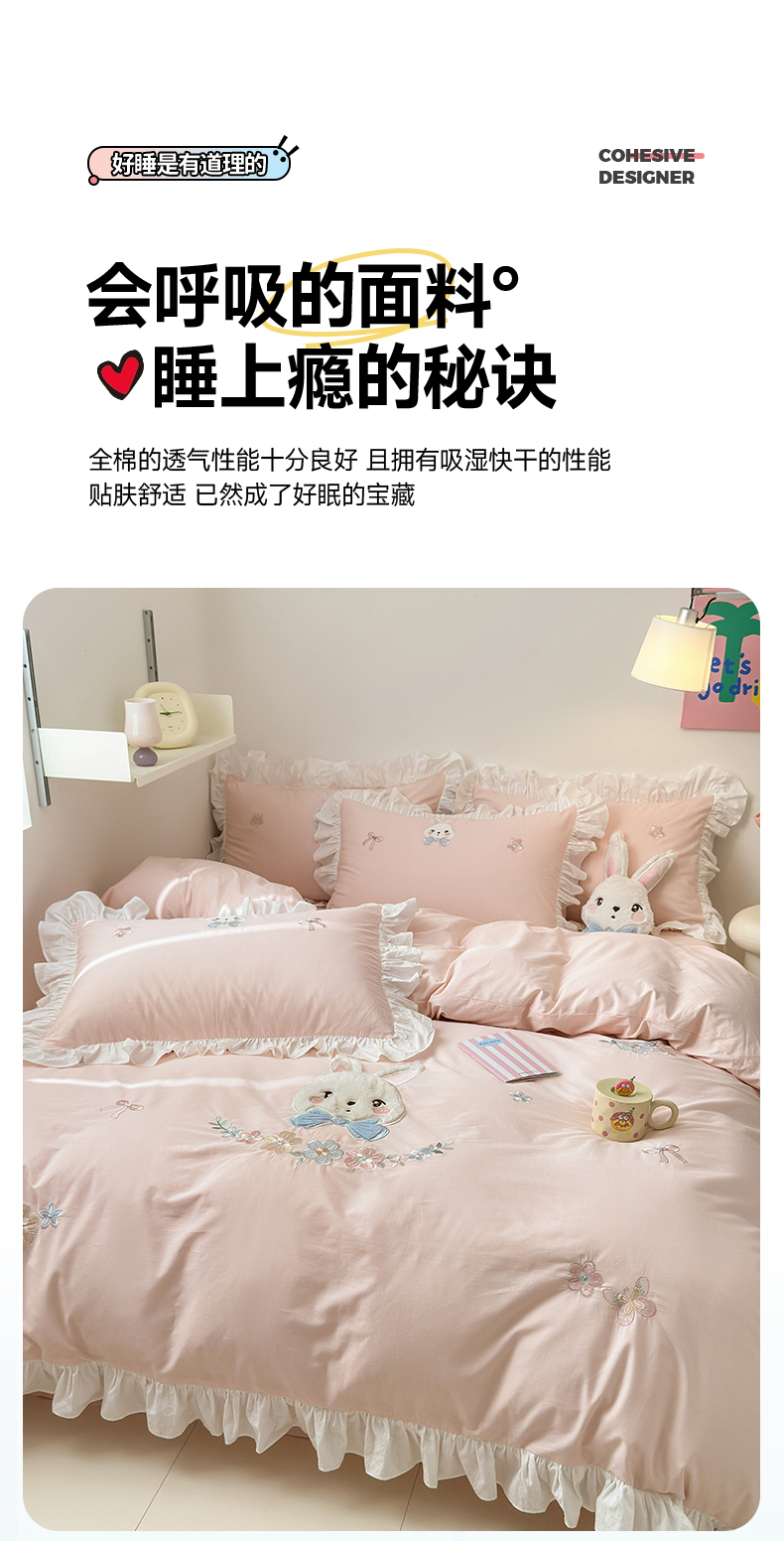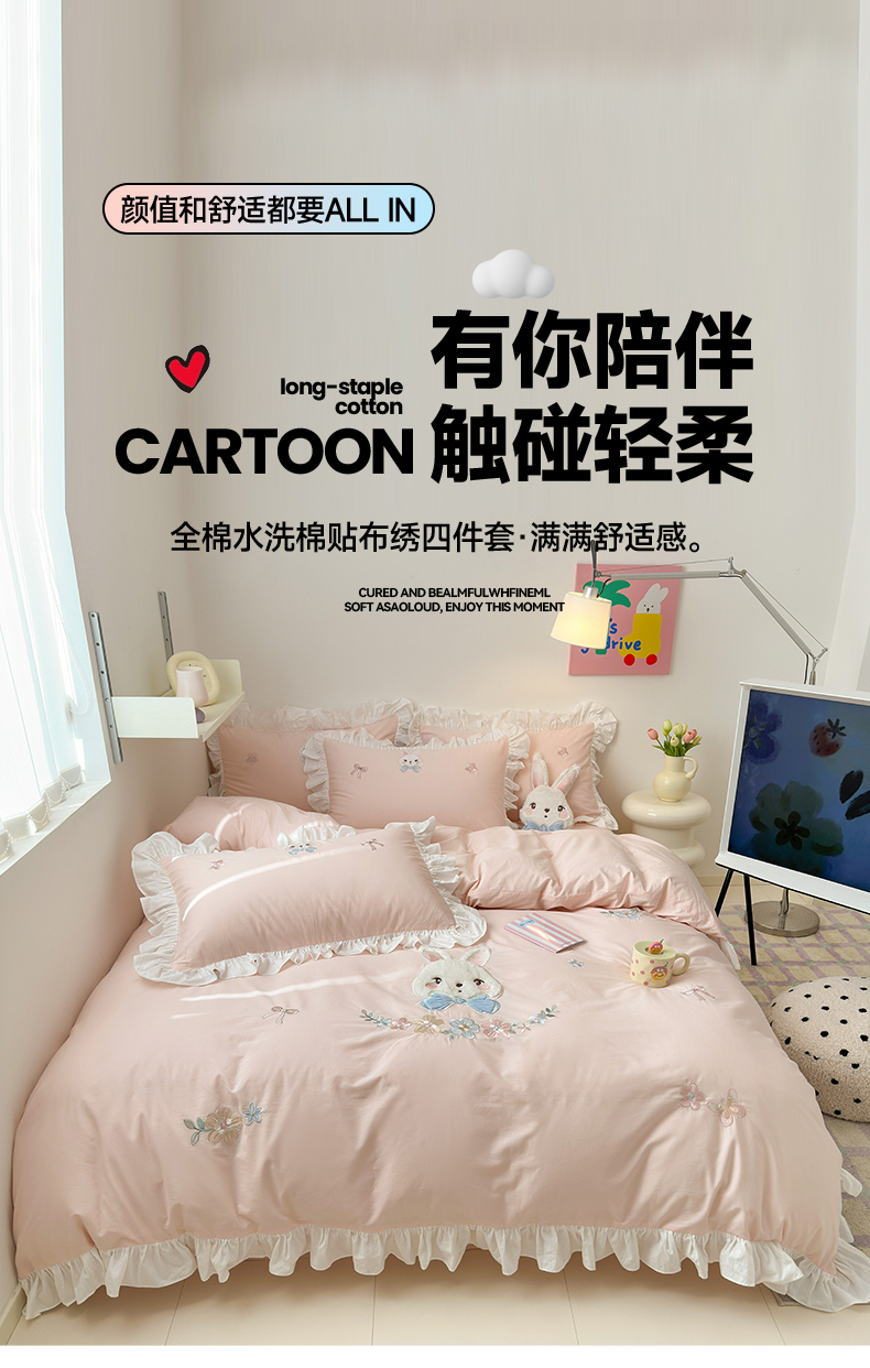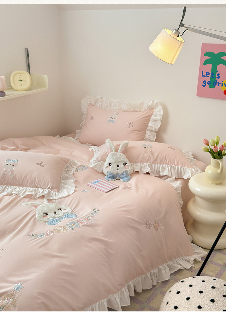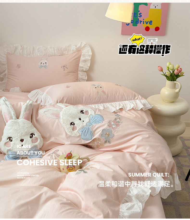 商品名称:蜜柚 2024新款全棉加厚水洗棉韩版小清新绣花工艺四件套-萌萌兔 萌萌兔粉