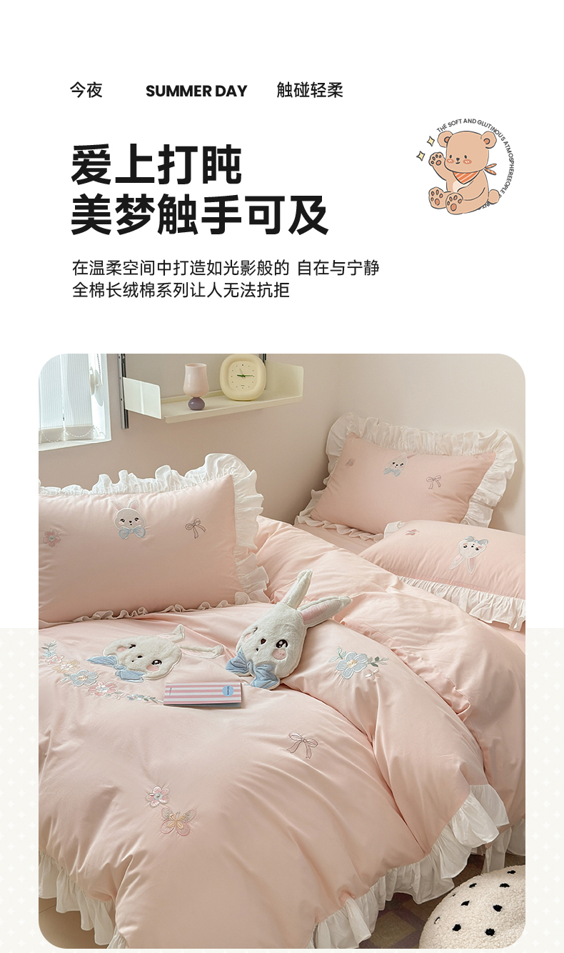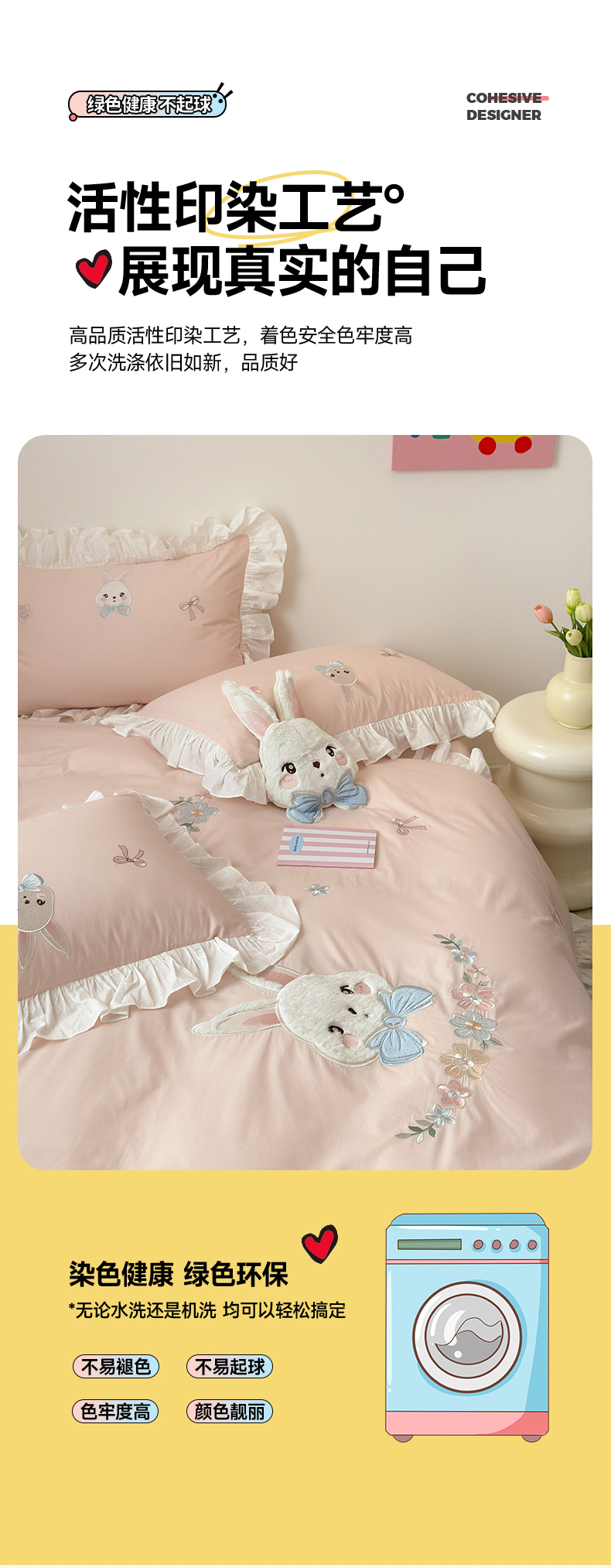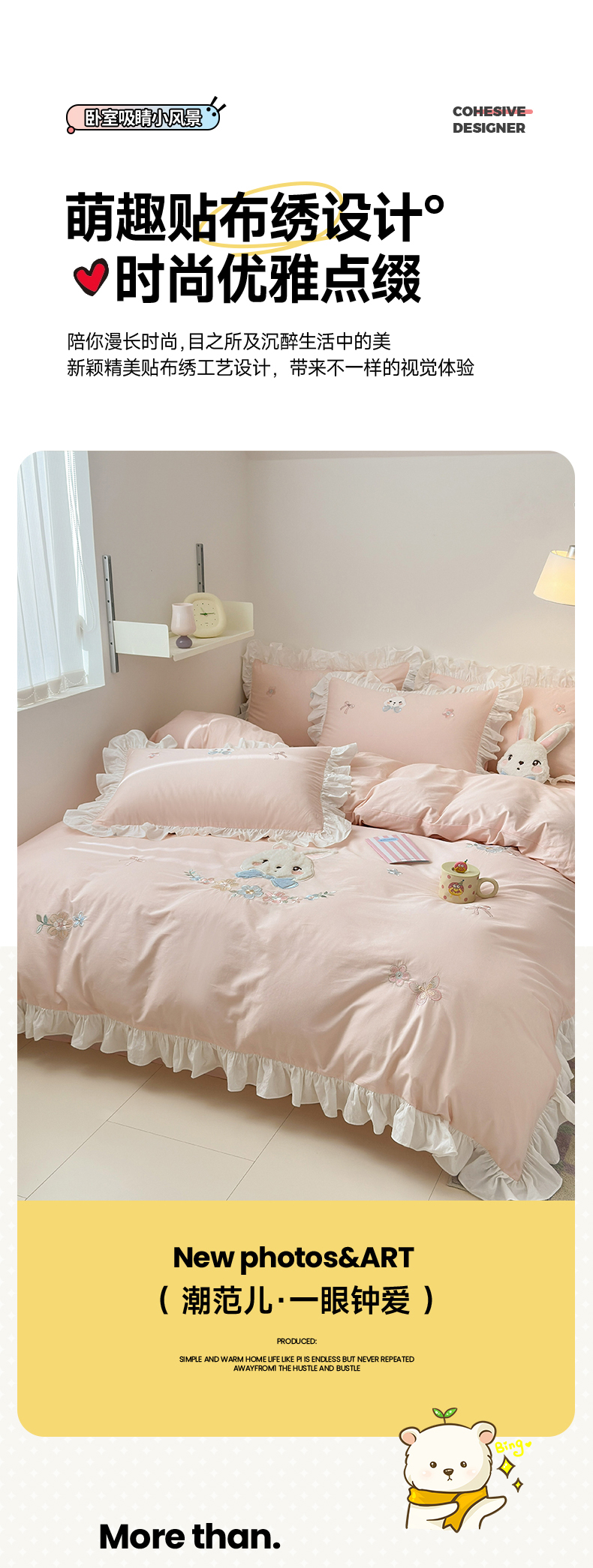 商品名称:蜜柚 2024新款全棉加厚水洗棉韩版小清新绣花工艺四件套-萌萌兔 萌萌兔粉