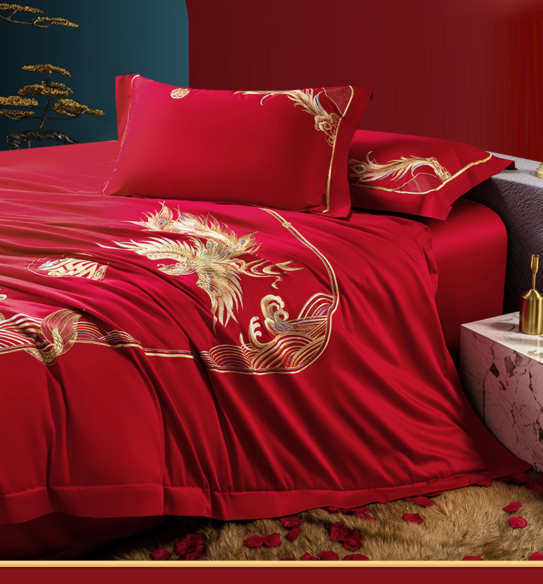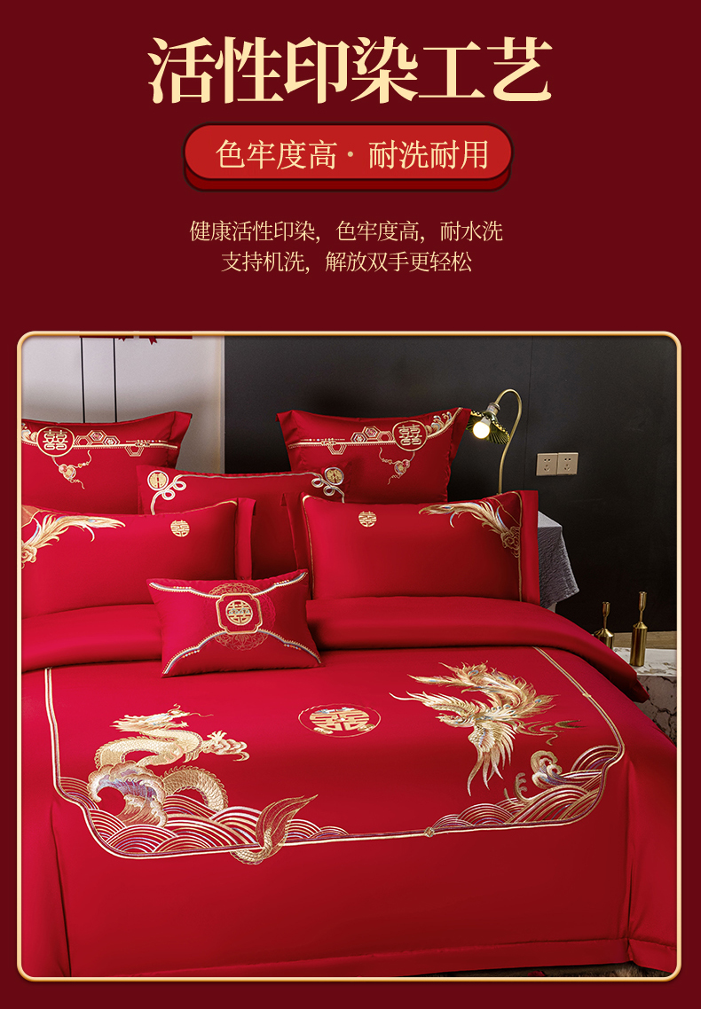 • 91家纺网 家纺一手货源 找家纺 2025新款长绒棉长绒棉贡缎提花款新中式古典韵味精美刺绣婚庆四件套多件套 龙凤喜韵