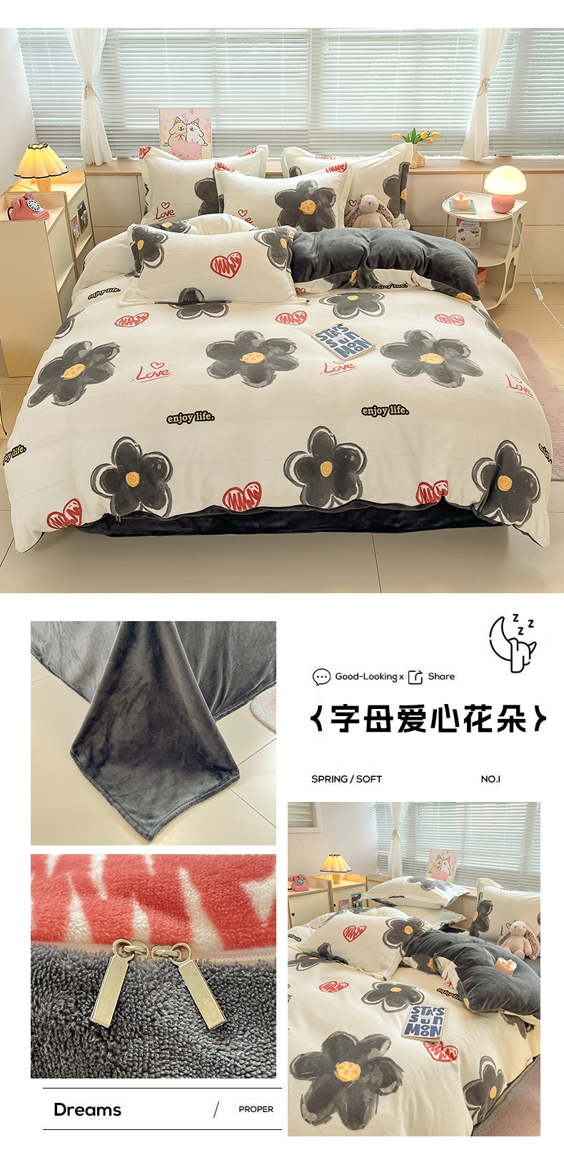 2024新款A类AB版加厚保暖双面牛奶绒印花四件套--小清新系列 字母爱心花朵