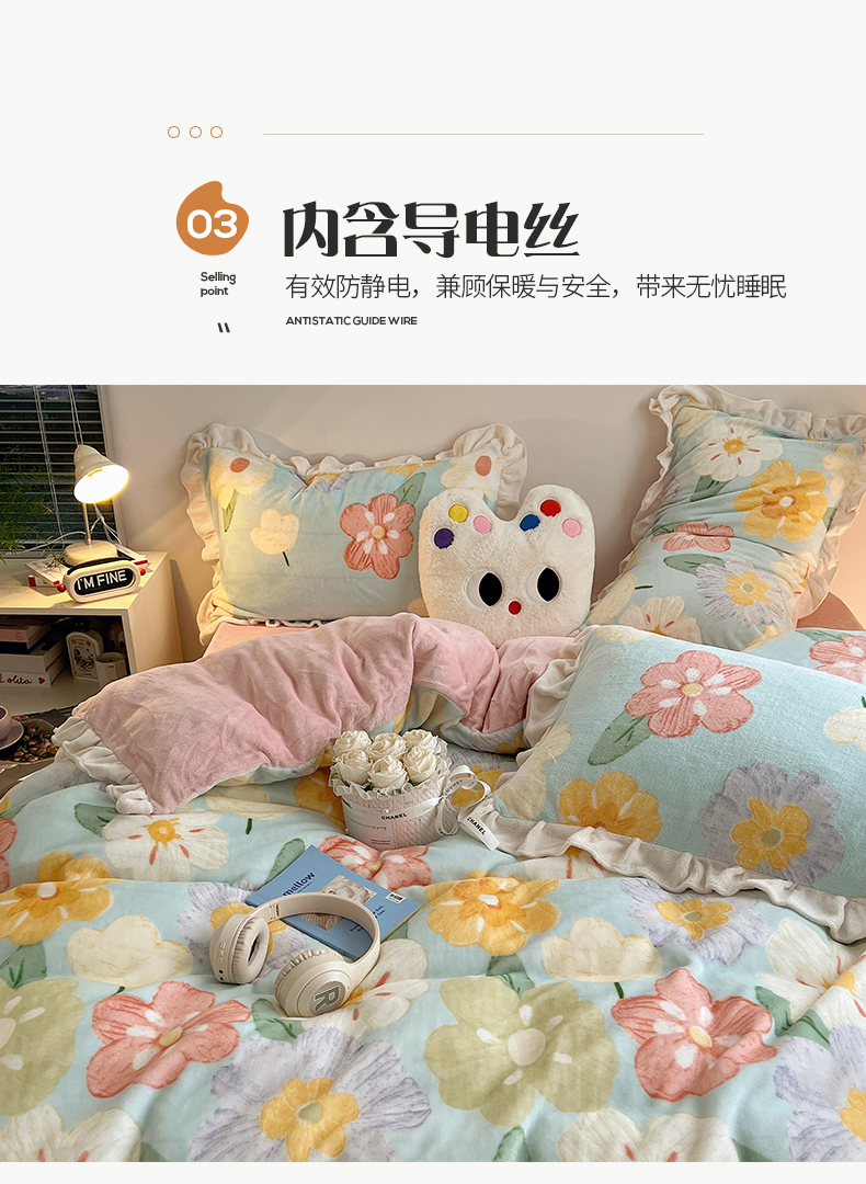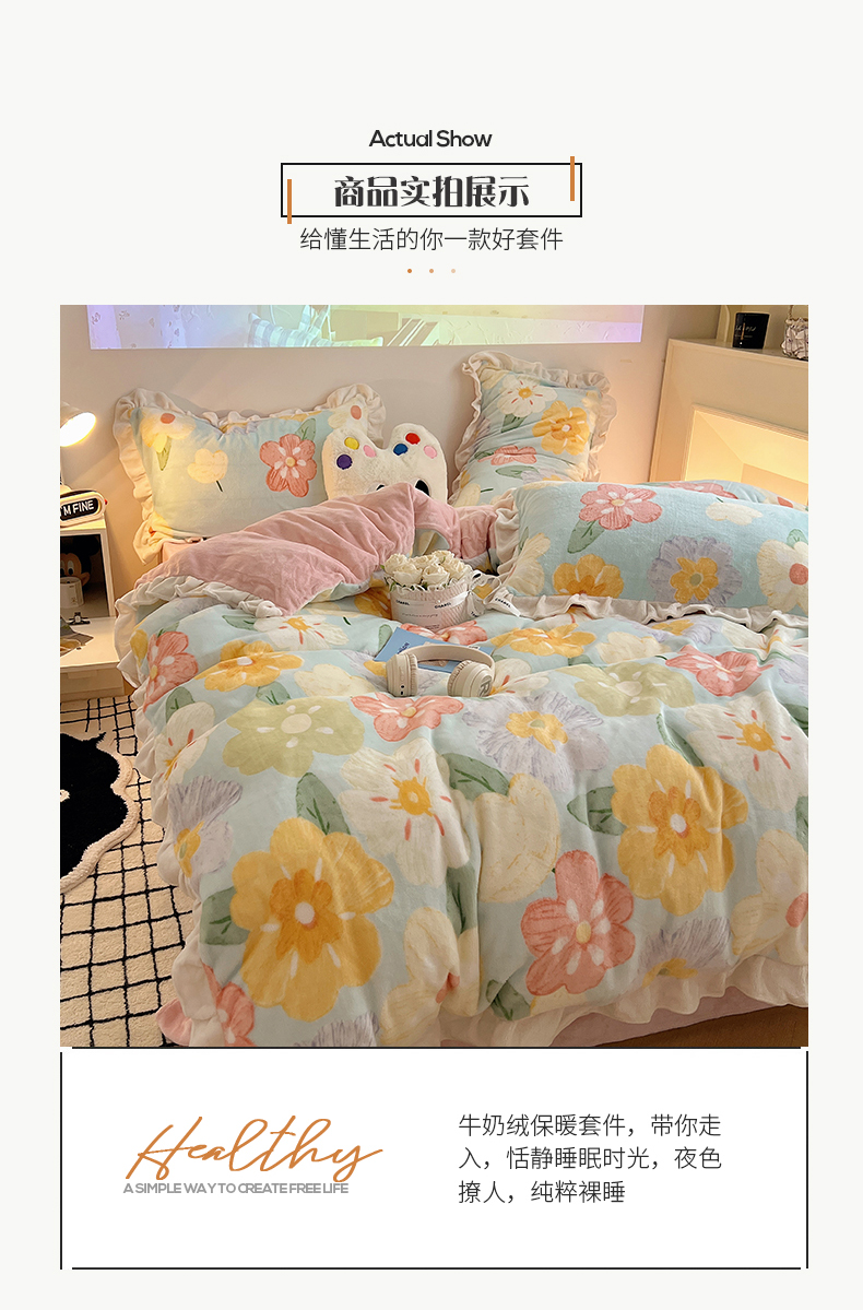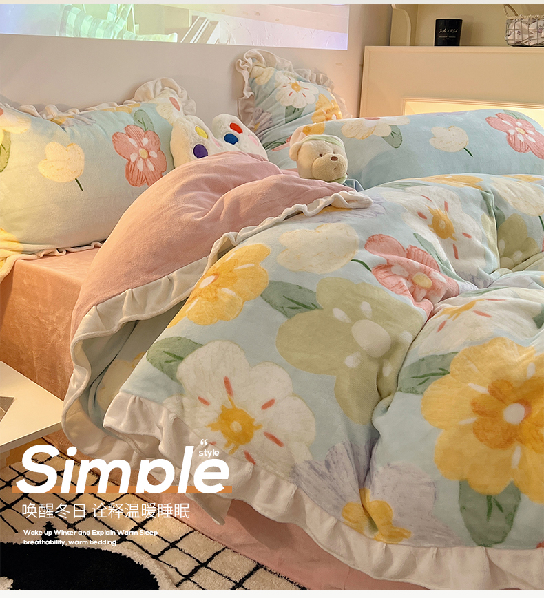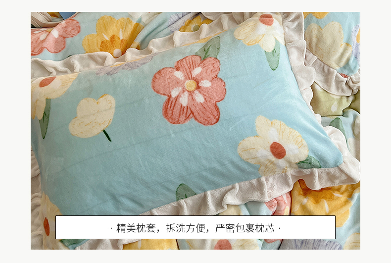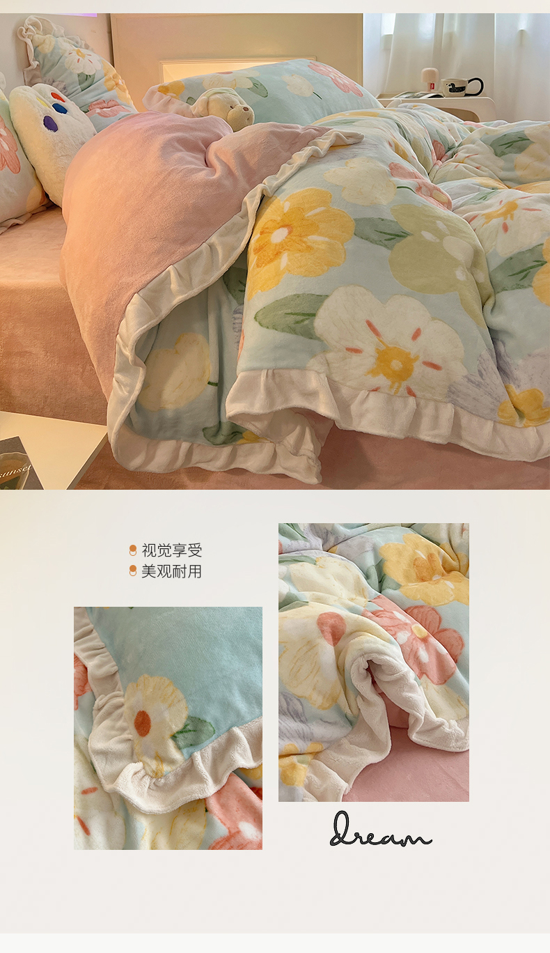 商品名称:桃子家居 2024新款A类ins韩版花边少女心加厚牛奶绒四件套 绒-花边花儿多多