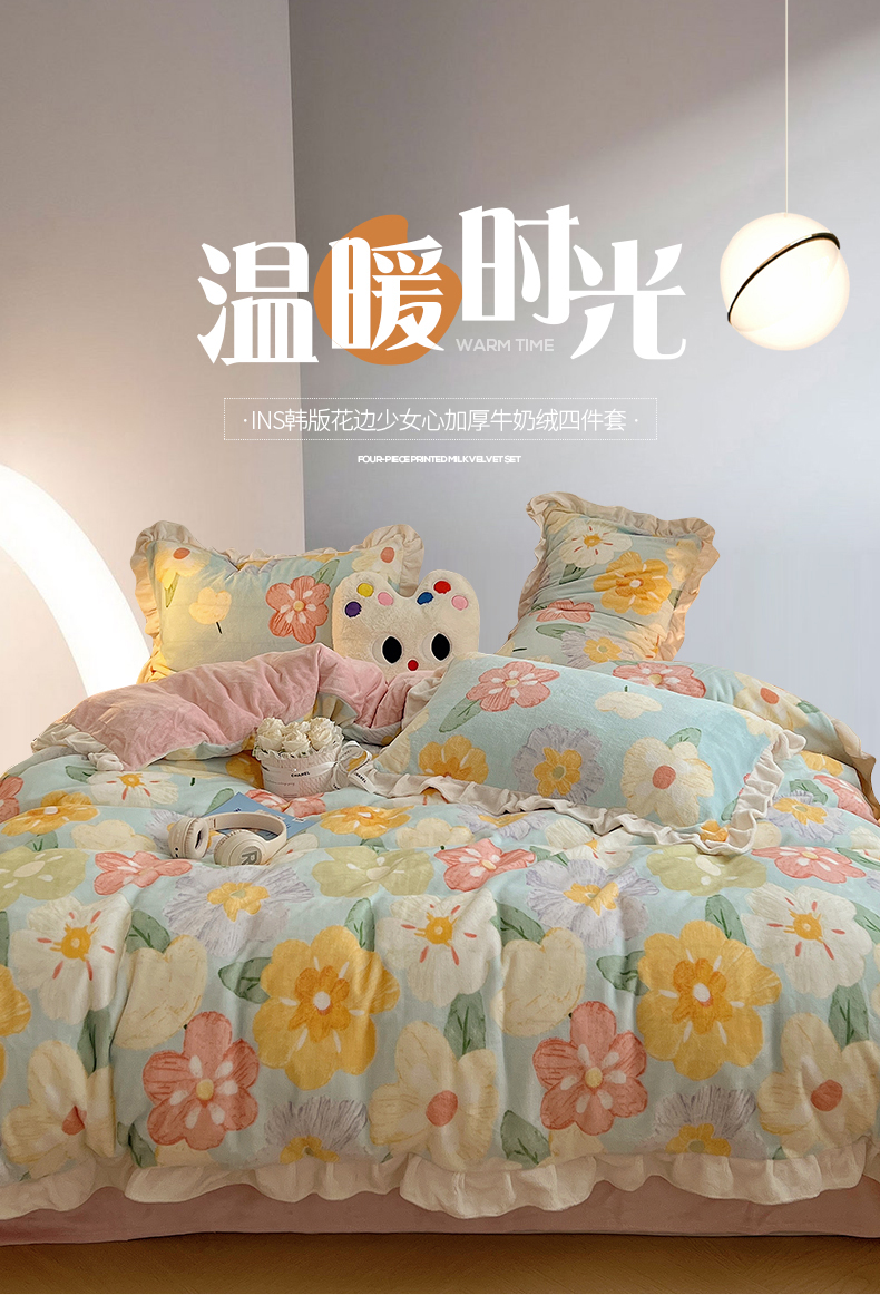 桃子家居 2024新款A类ins韩版花边少女心加厚牛奶绒四件套 绒-花边花儿多多