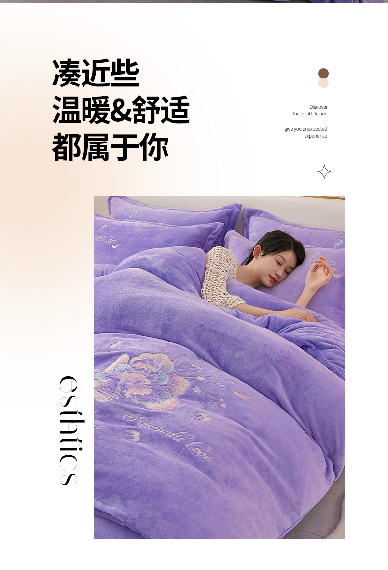 绒小宣 2025新款高克重牛奶绒刺绣四件套 花开富贵-浅夏紫