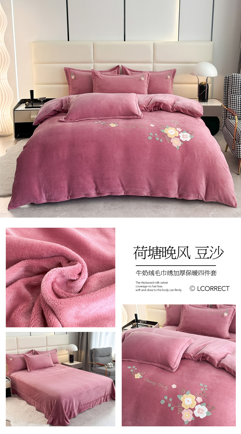 商品名称:恋佳居 2025新款牛奶绒180克毛巾绣四件套 荷塘晚风豆沙
