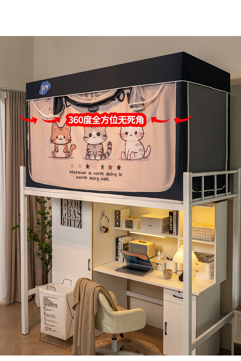 新太阳蚊帐 2025新款大空间卡通印花窗帘款学生宿舍涂层强遮光加密网纱蚊帐 三只小猫