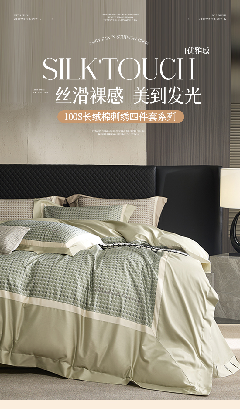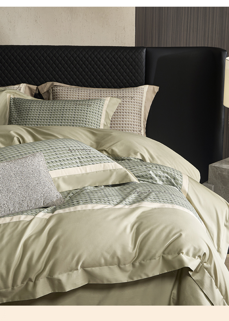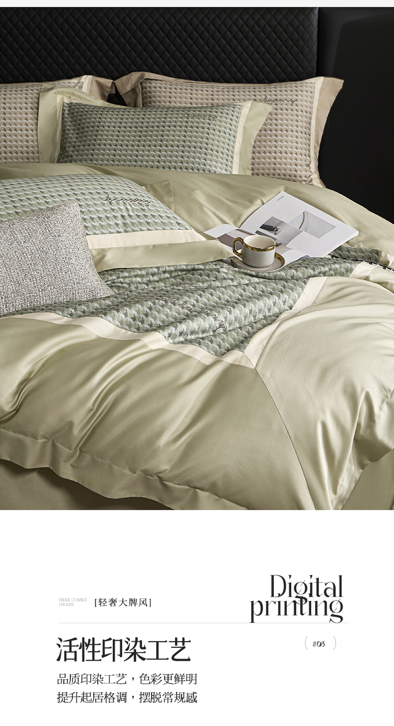 商品名称:名品优仓 2024新款高支高密长绒棉数码印花加刺绣拼角款四件套-克鲁亚 克鲁亚-薄荷奶绿