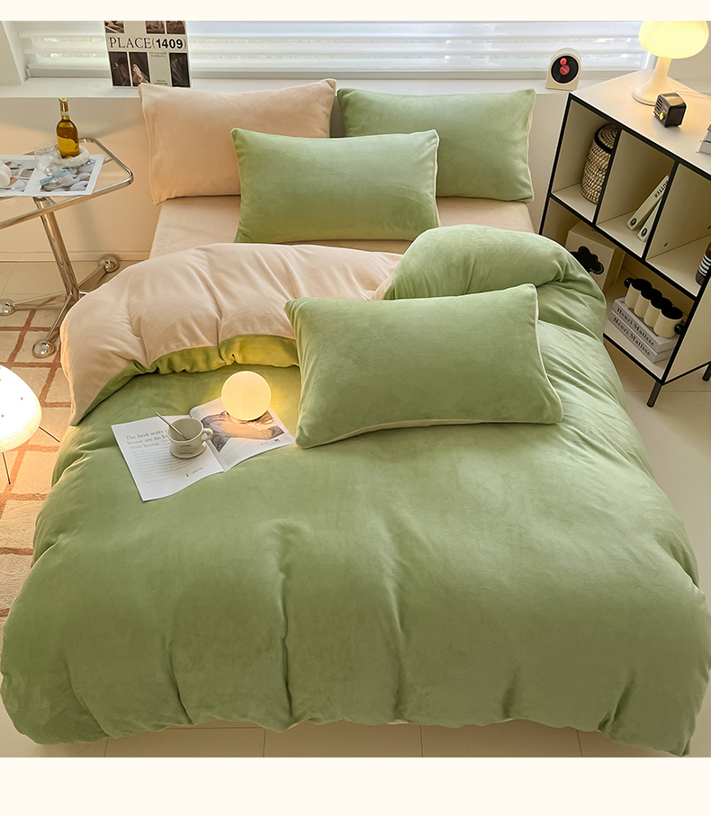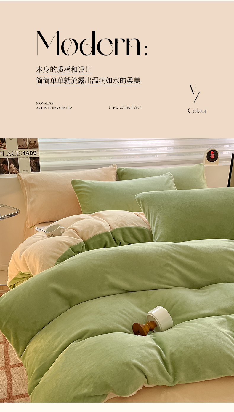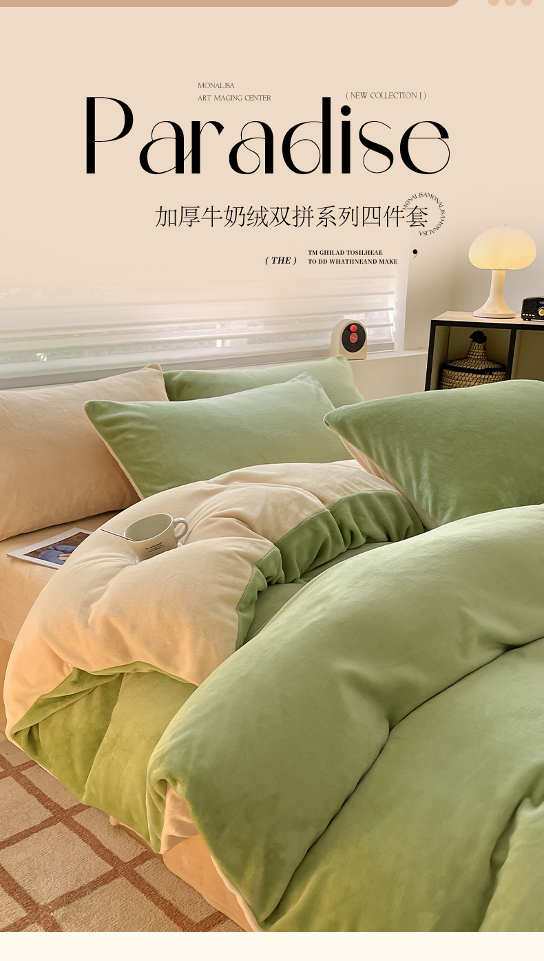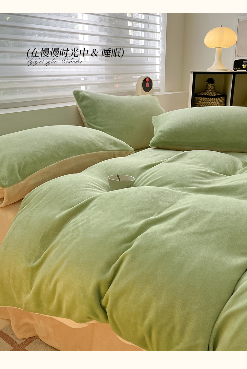 商品名称:绘萱 2025新款高克重纯色双拼牛奶绒四件套 奶油绿黄