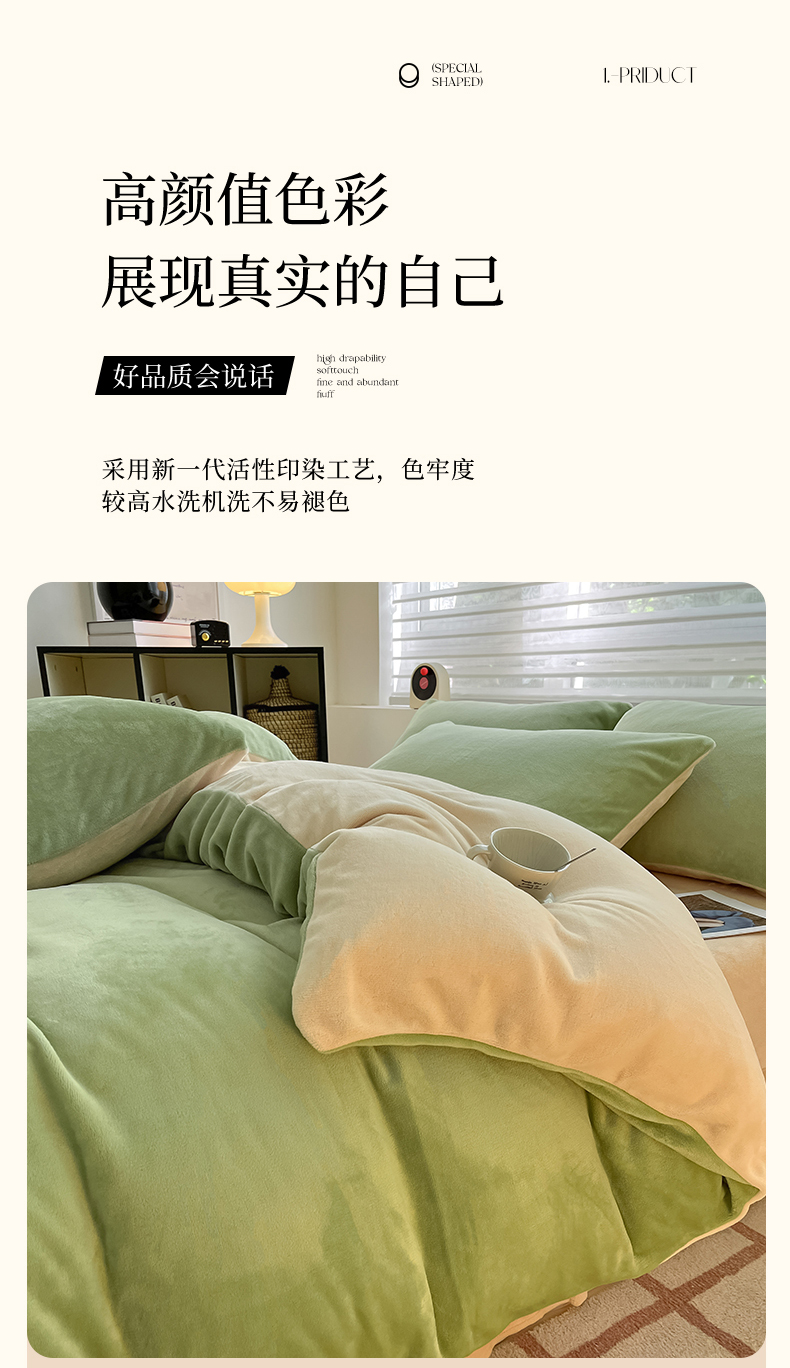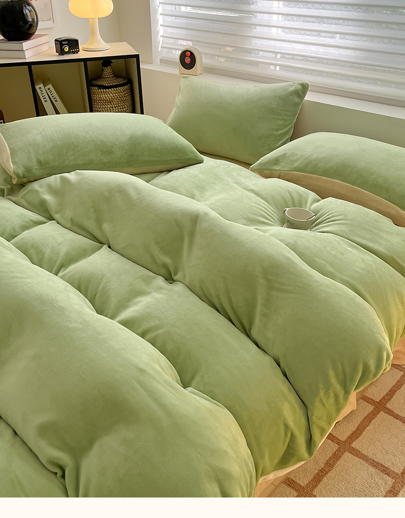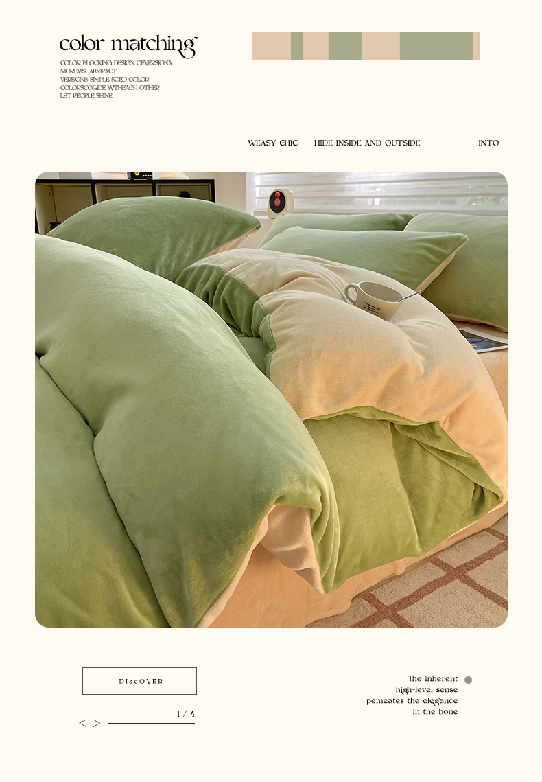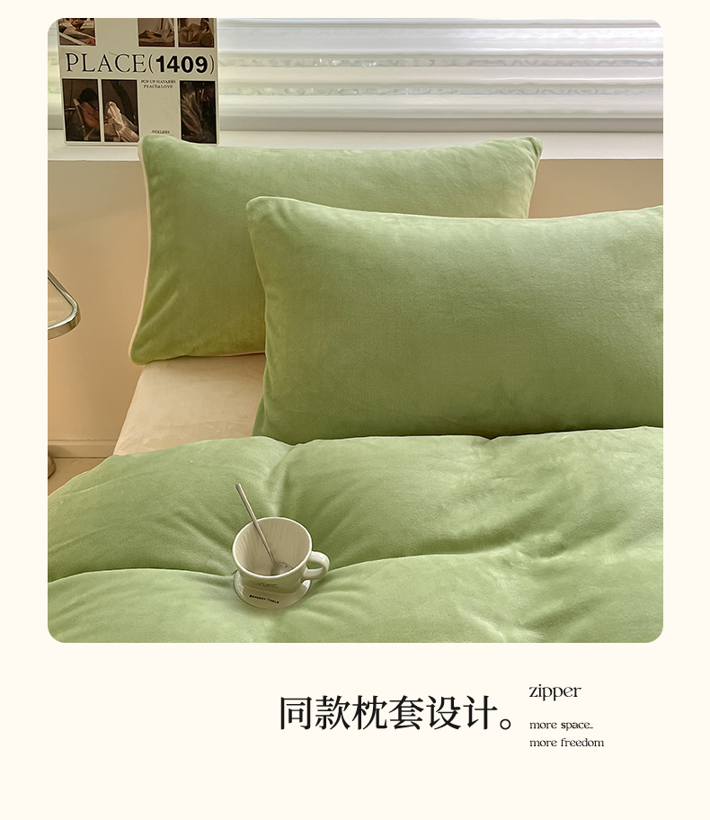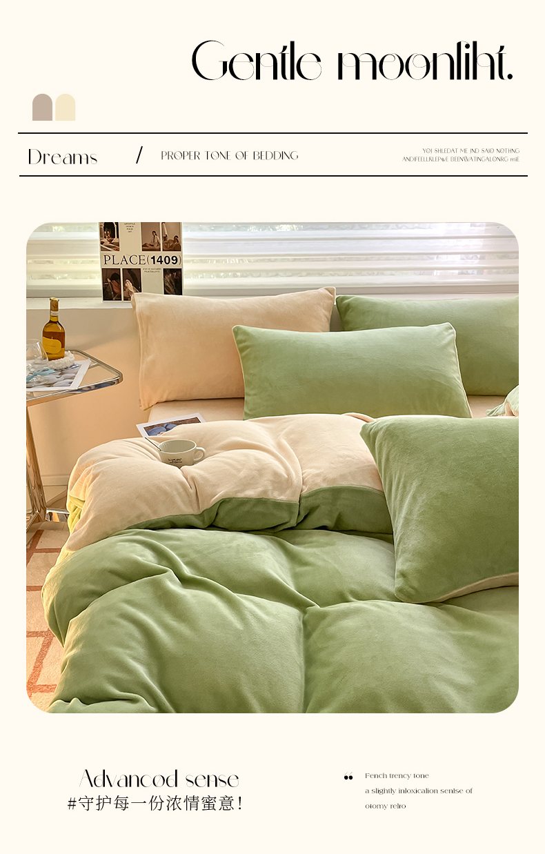 商品名称:绘萱 2025新款高克重纯色双拼牛奶绒四件套 奶油绿黄