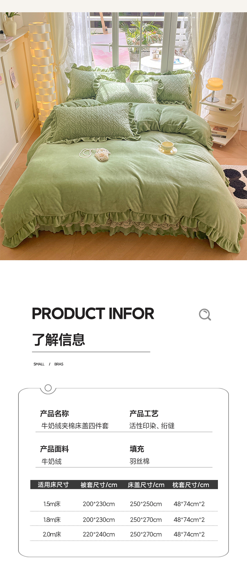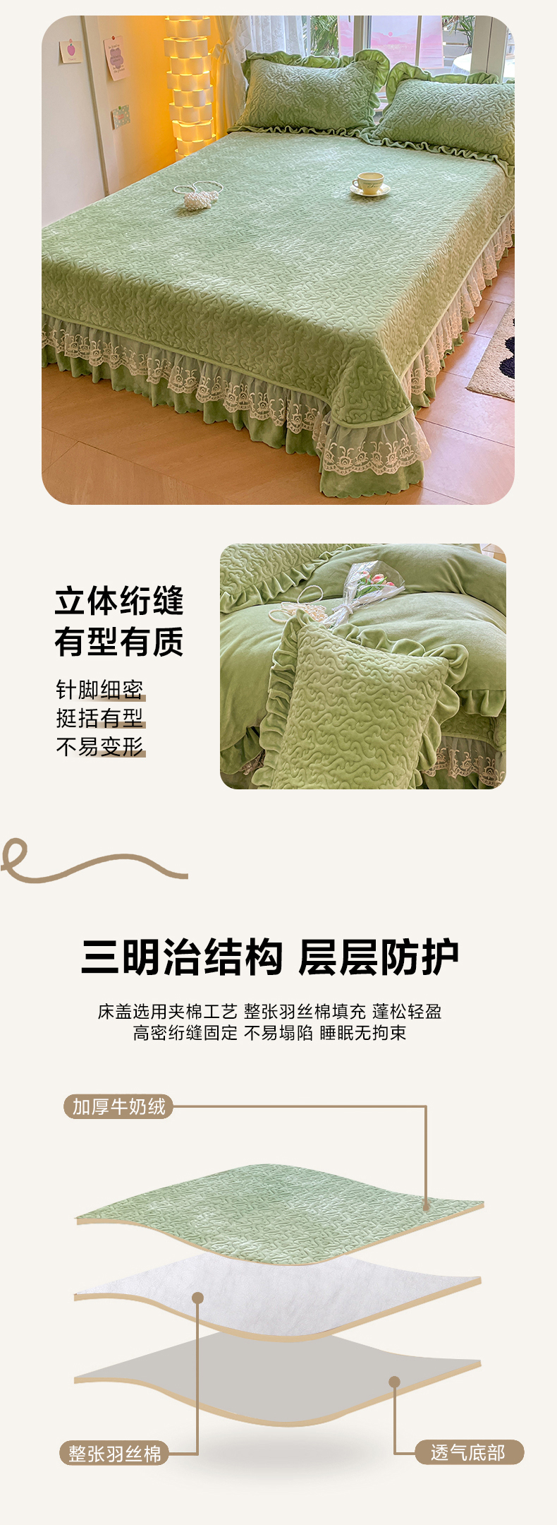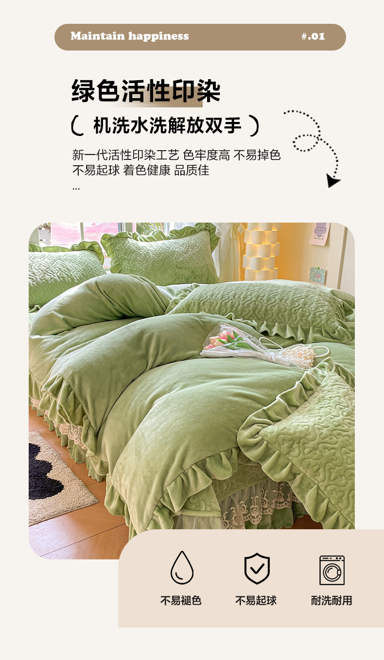商品名称:畅畅家纺 2024新款冬季韩版花边蕾丝牛奶绒床盖四件套 草绿