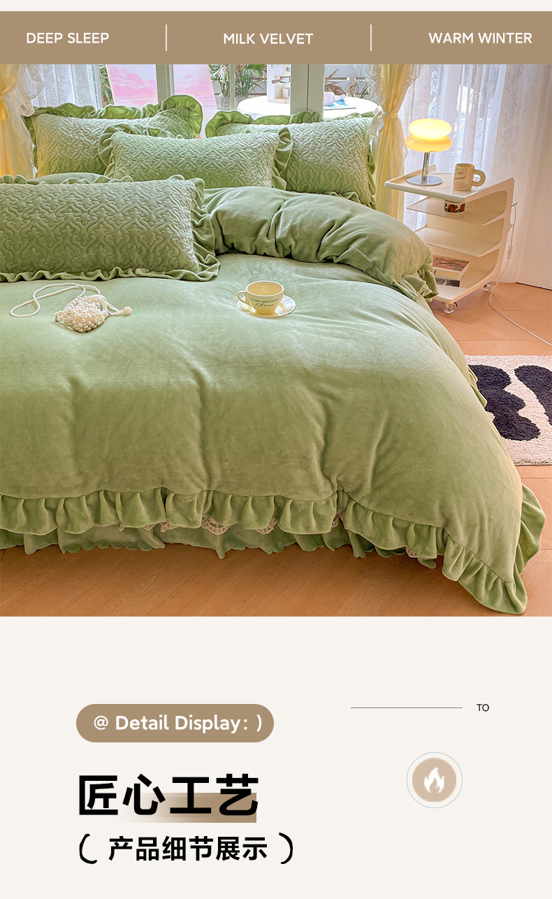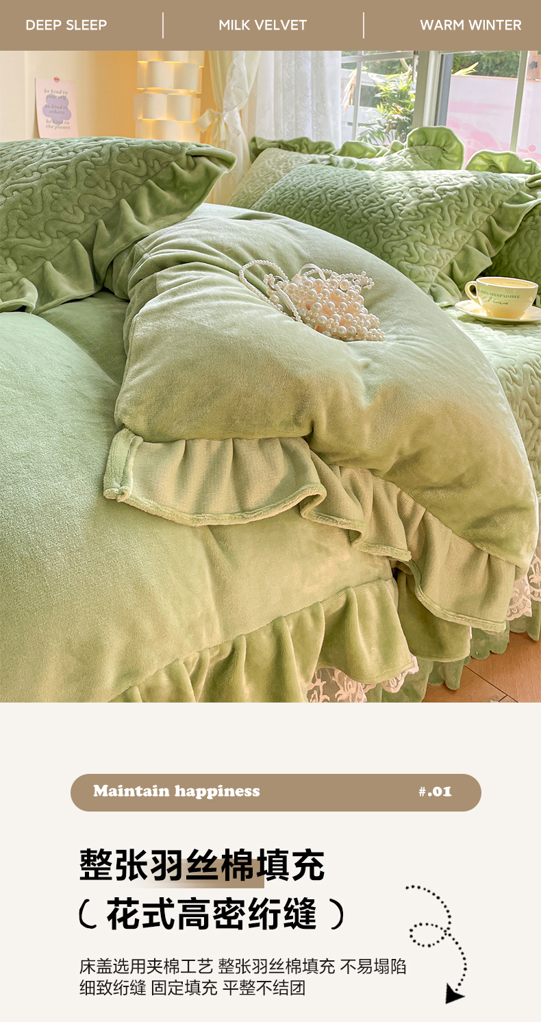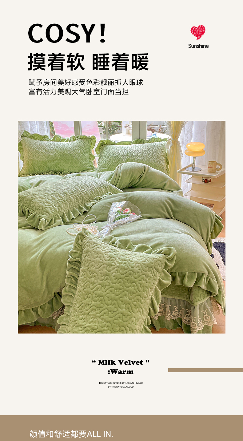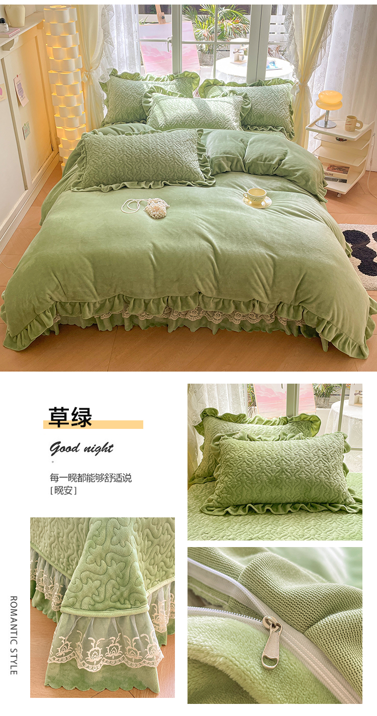 畅畅家纺 2024新款冬季韩版花边蕾丝牛奶绒床盖四件套 草绿