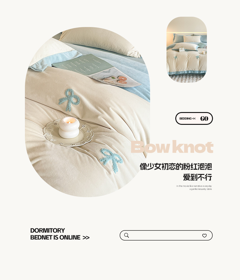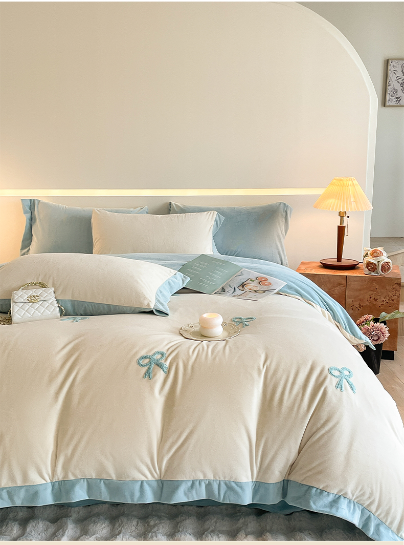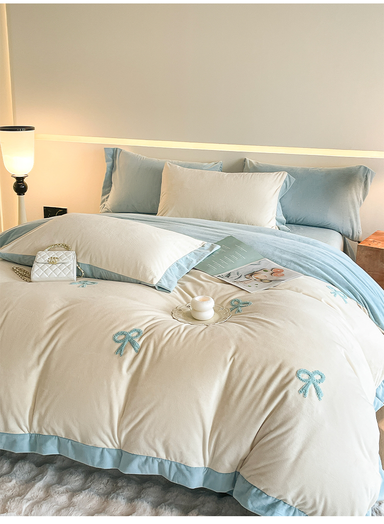2024新款水晶绒拼角满版毛巾绣四件套 蝴蝶结-奶白蓝