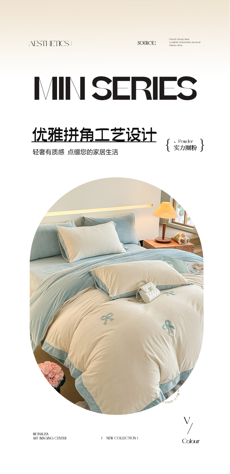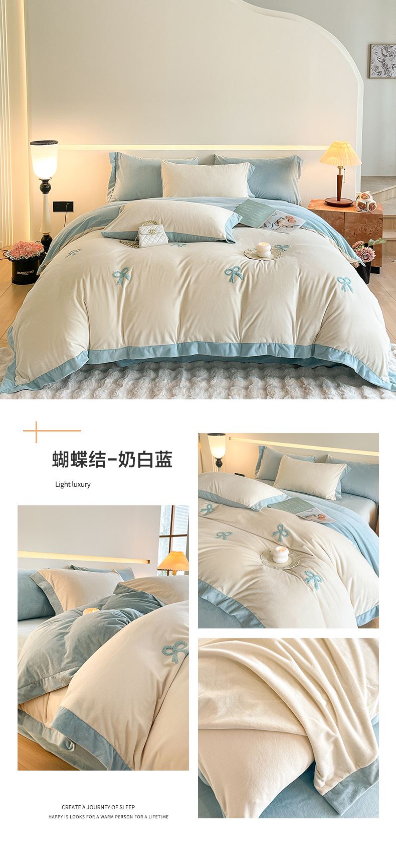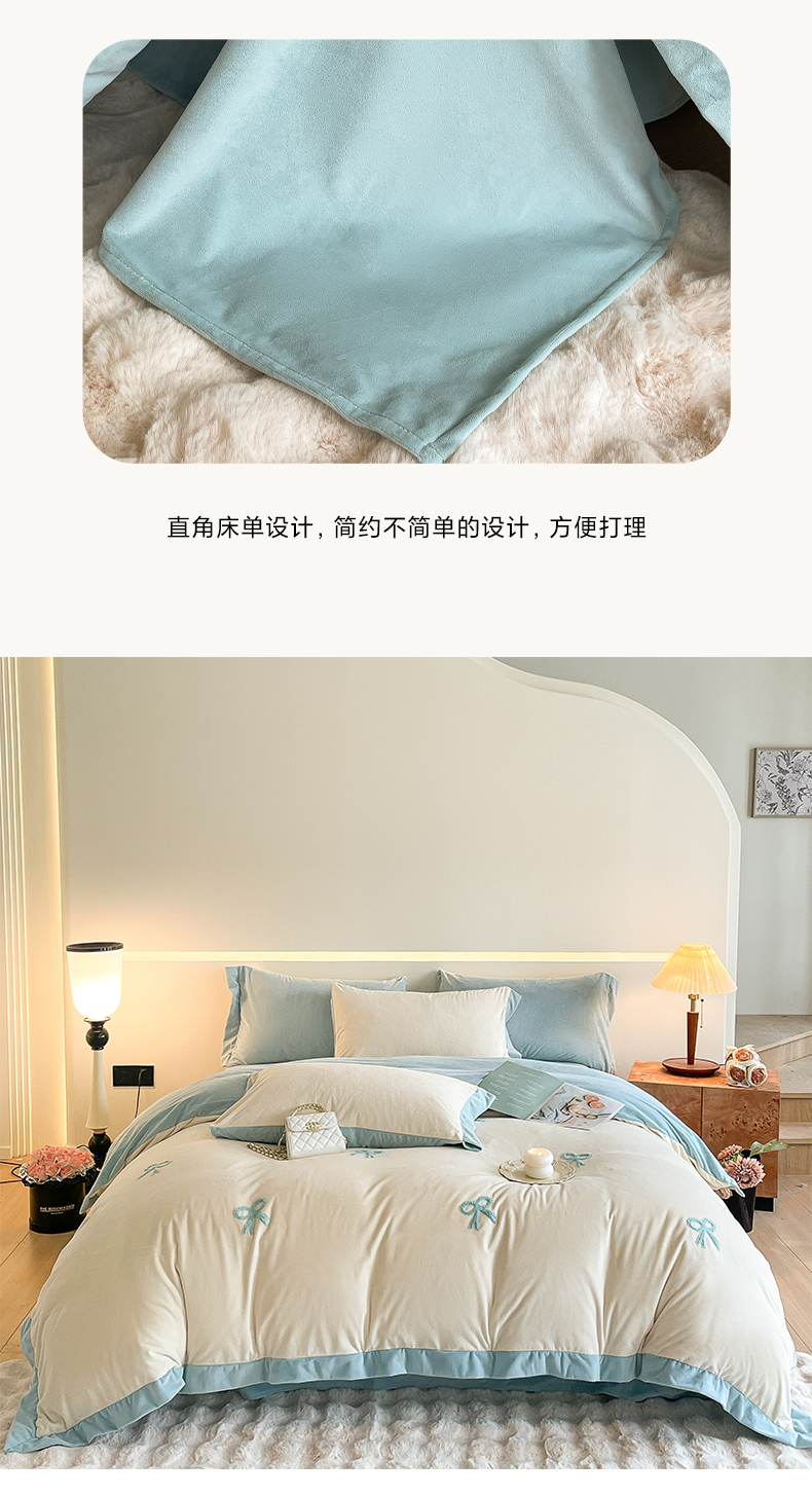 商品名称:2024新款水晶绒拼角满版毛巾绣四件套 蝴蝶结-奶白蓝