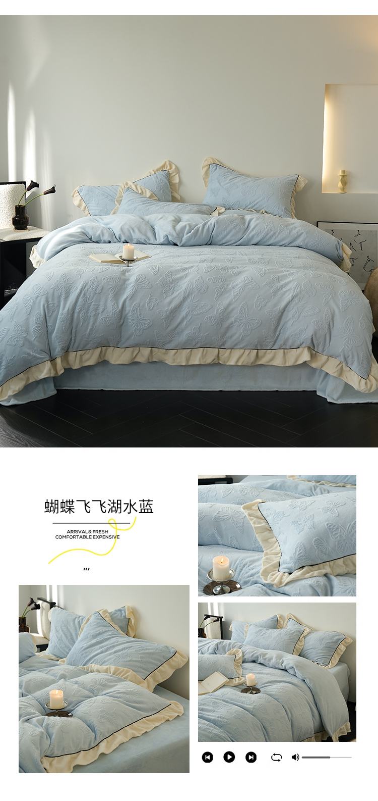 商品名称:萝莉家纺 2024新款加厚牛奶绒提花浪漫雕花绒四件套 蝴蝶飞飞湖水蓝