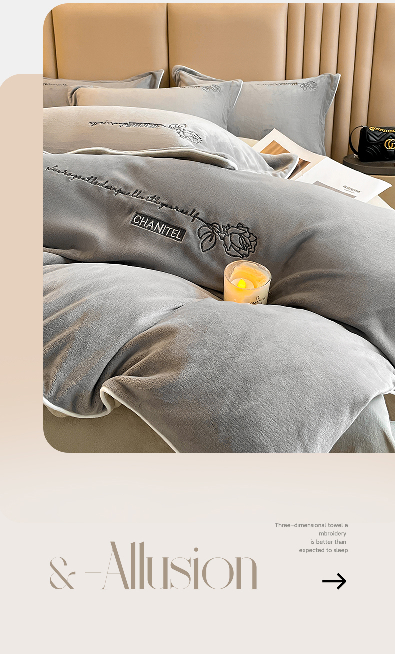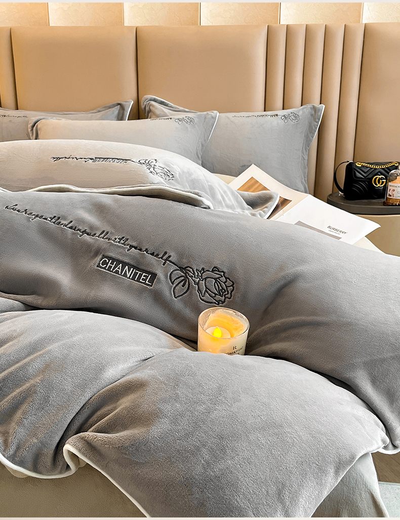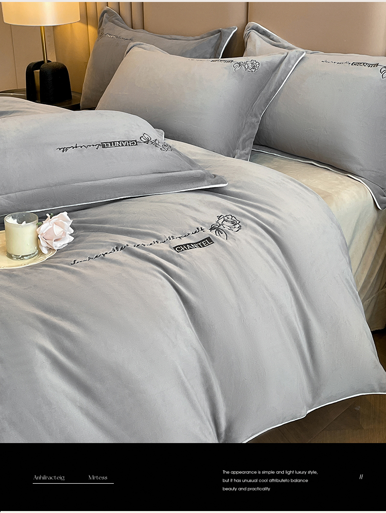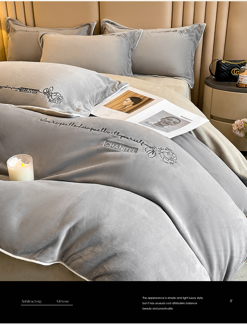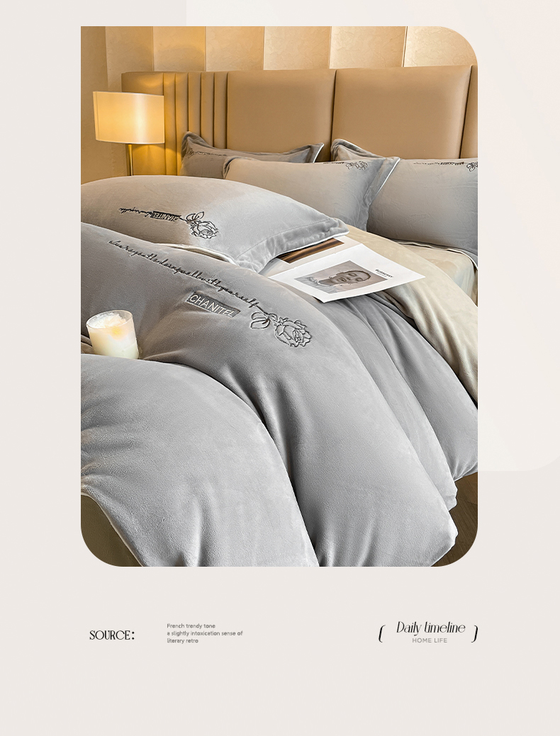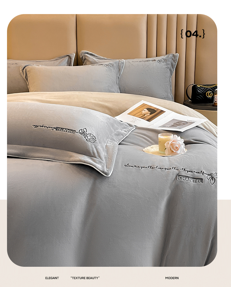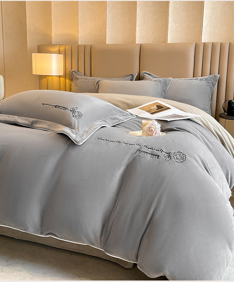 嗯呢家纺 2024新款A类高克重全消光婴儿绒刺绣双拼四件套 漫灰-蜜合灰
