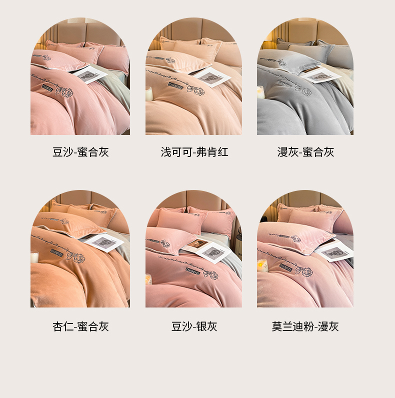 (总)嗯呢家纺 2024新款A类高克重全消光婴儿绒刺绣双拼四件套,豆沙-蜜合灰,豆沙-银灰,漫灰-蜜合灰,莫兰迪粉-漫灰,浅可可-弗肯红,杏仁-蜜合灰