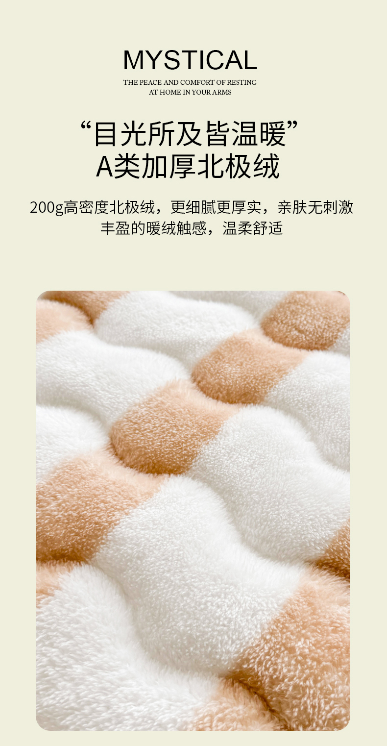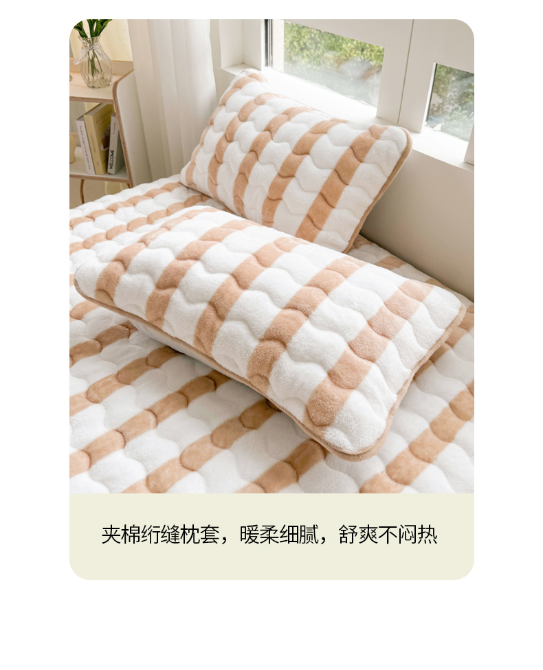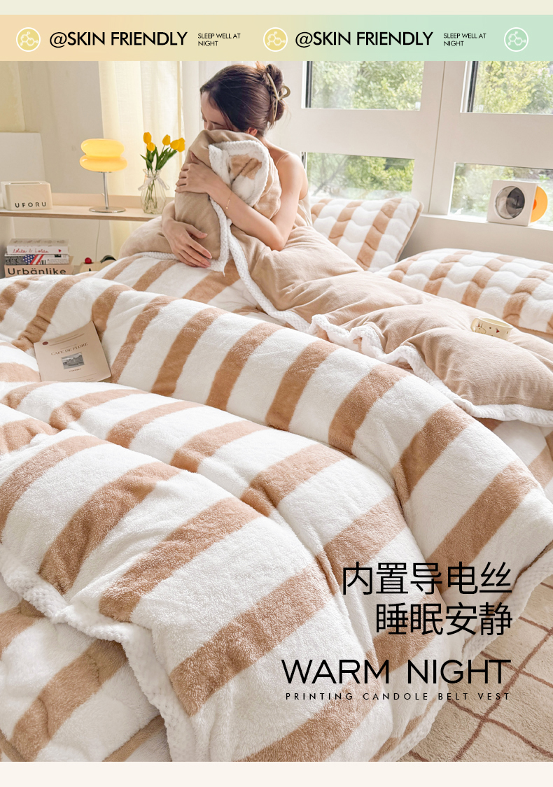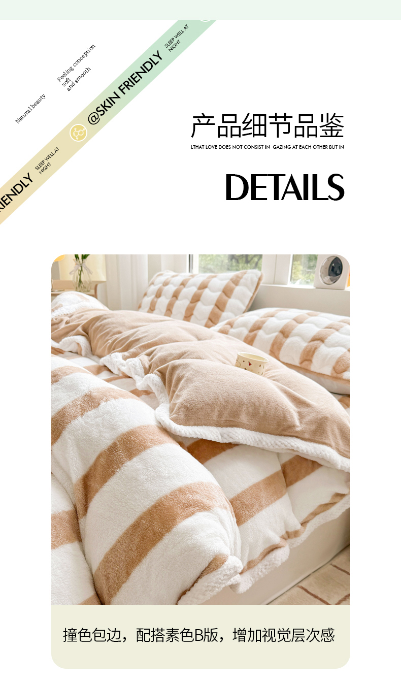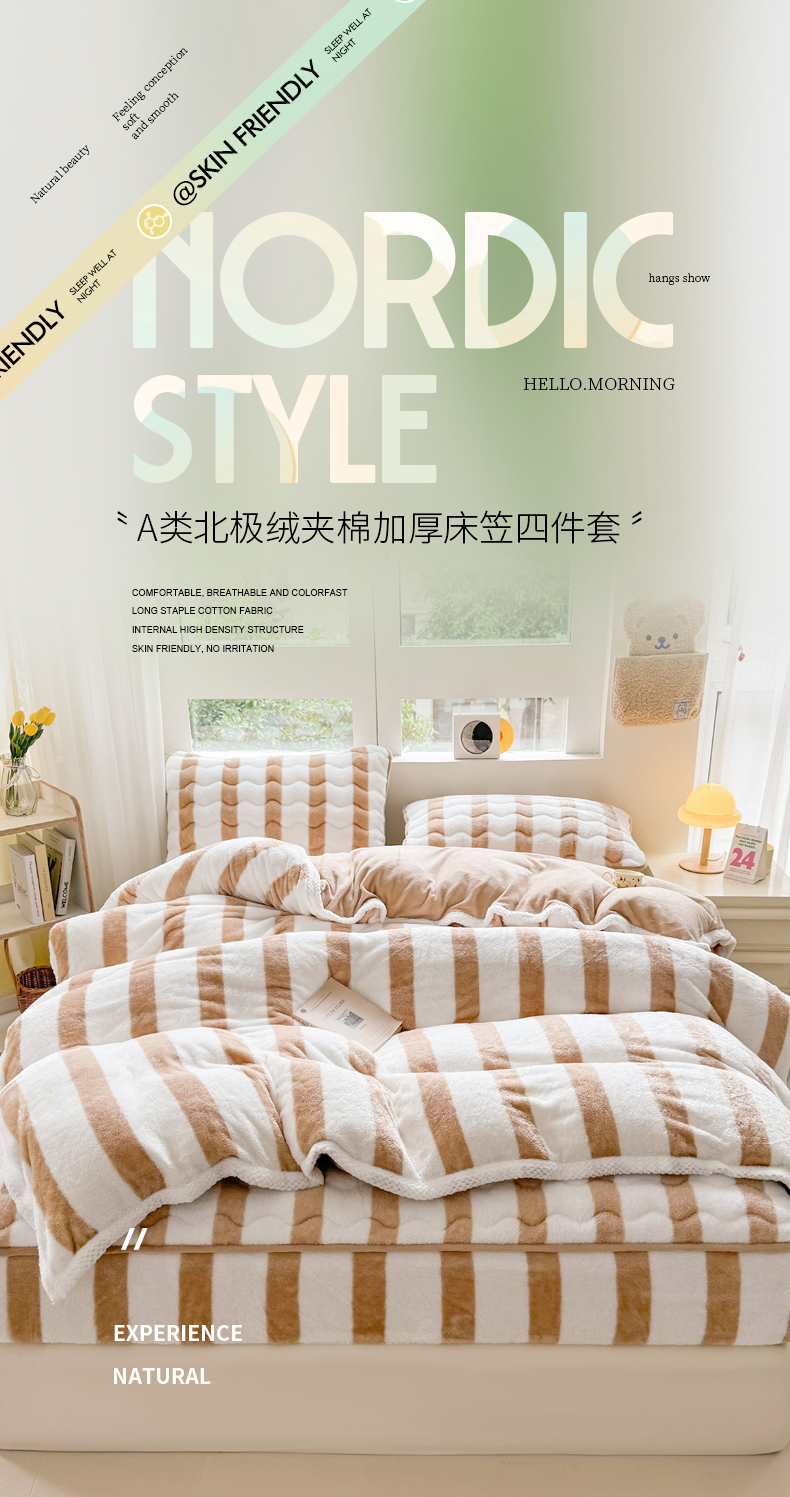 商品名称:2024秋冬新款A类北极绒加厚夹棉床笠+北极绒宽包边被套四件套(自然光图) 条纹-奶咖