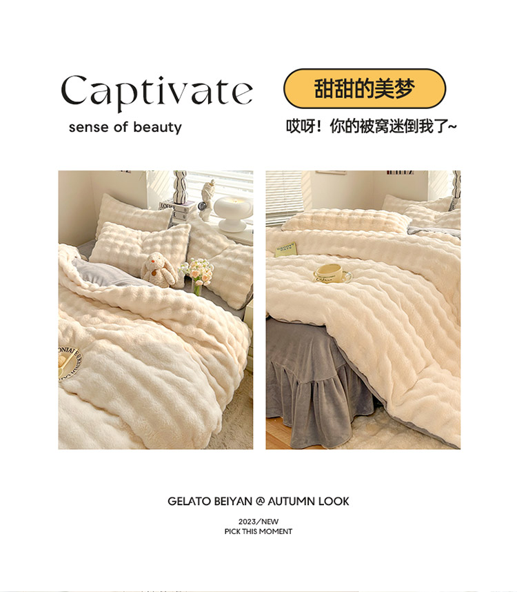 丝印良品 2024直播秋冬高克重500克床裙款泡泡四件套纯色印花泡泡-奶白灰