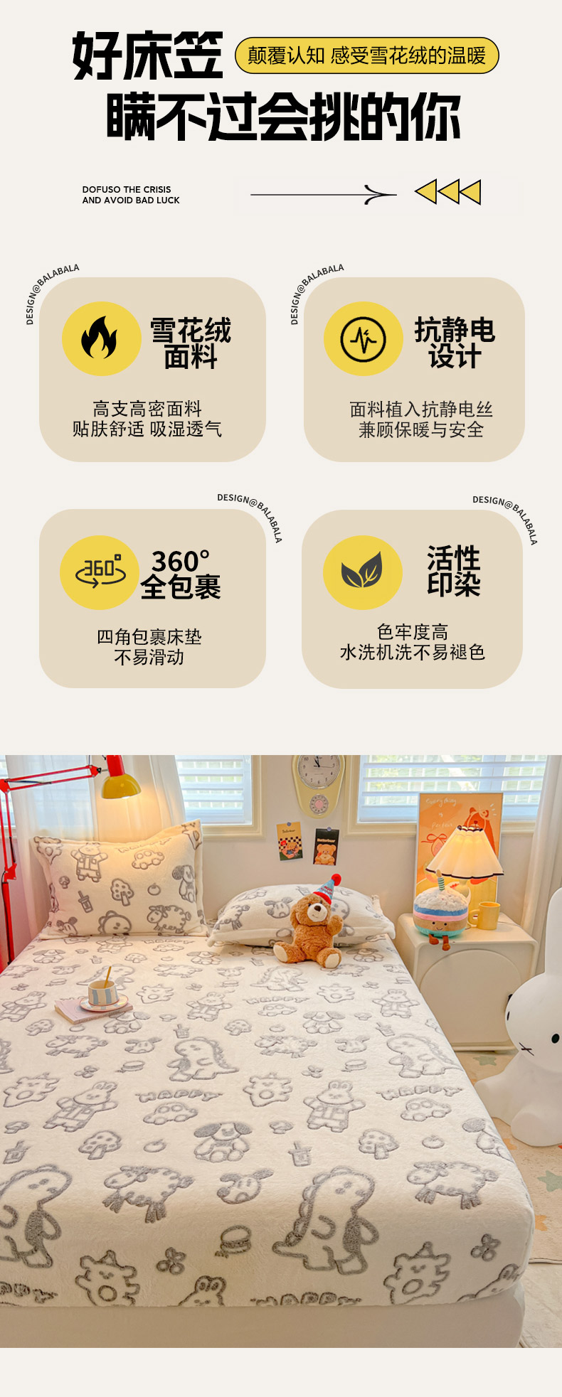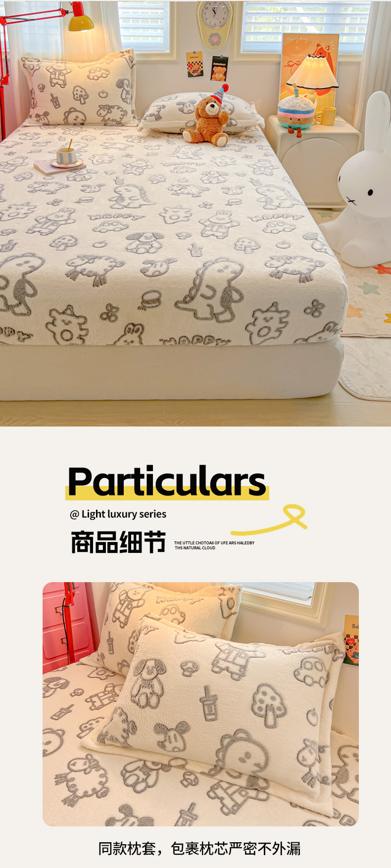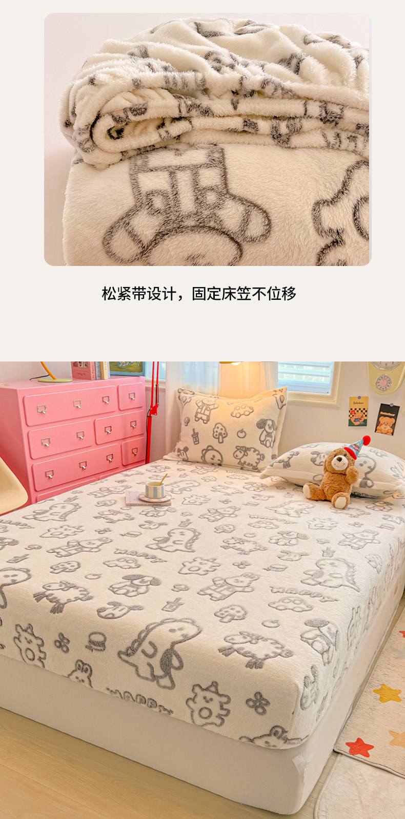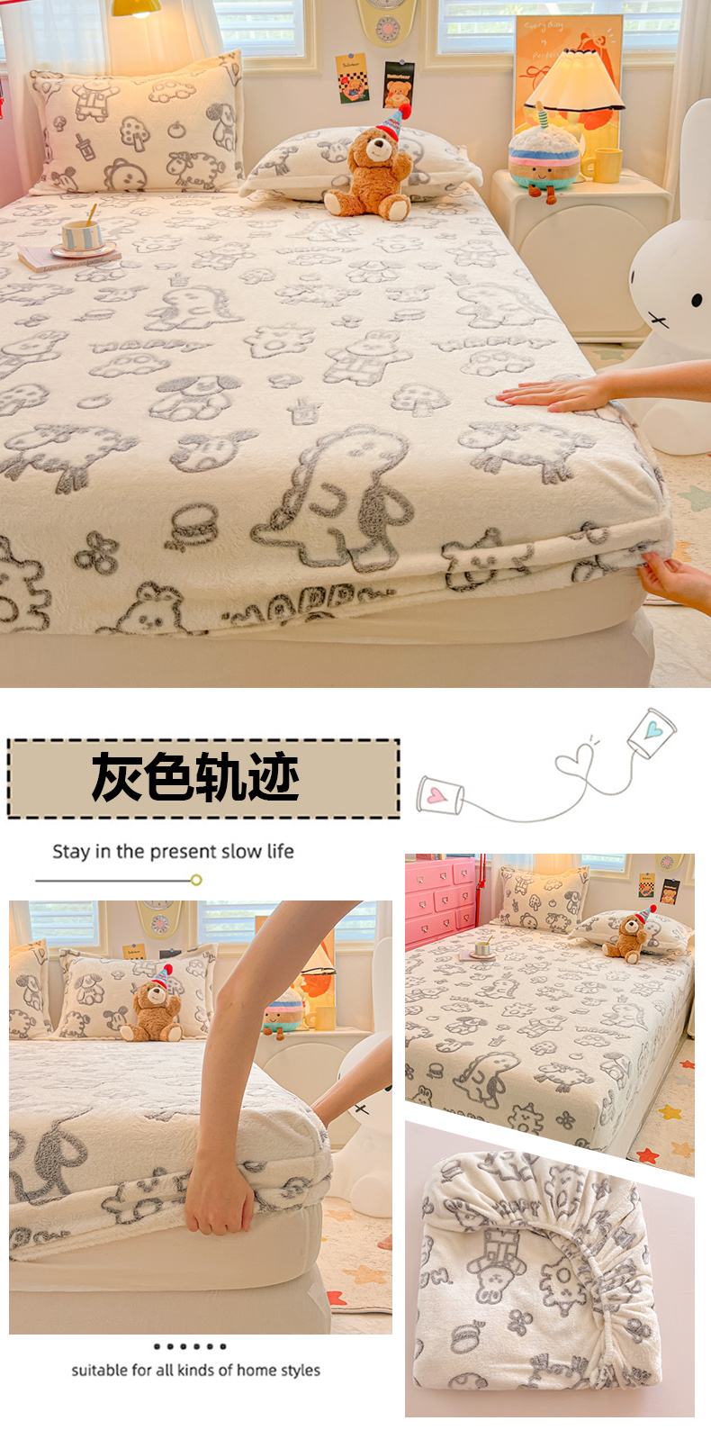 韩巢家纺 2024新款加厚雪花绒卡通印花保暖床笠三件套 灰色轨迹