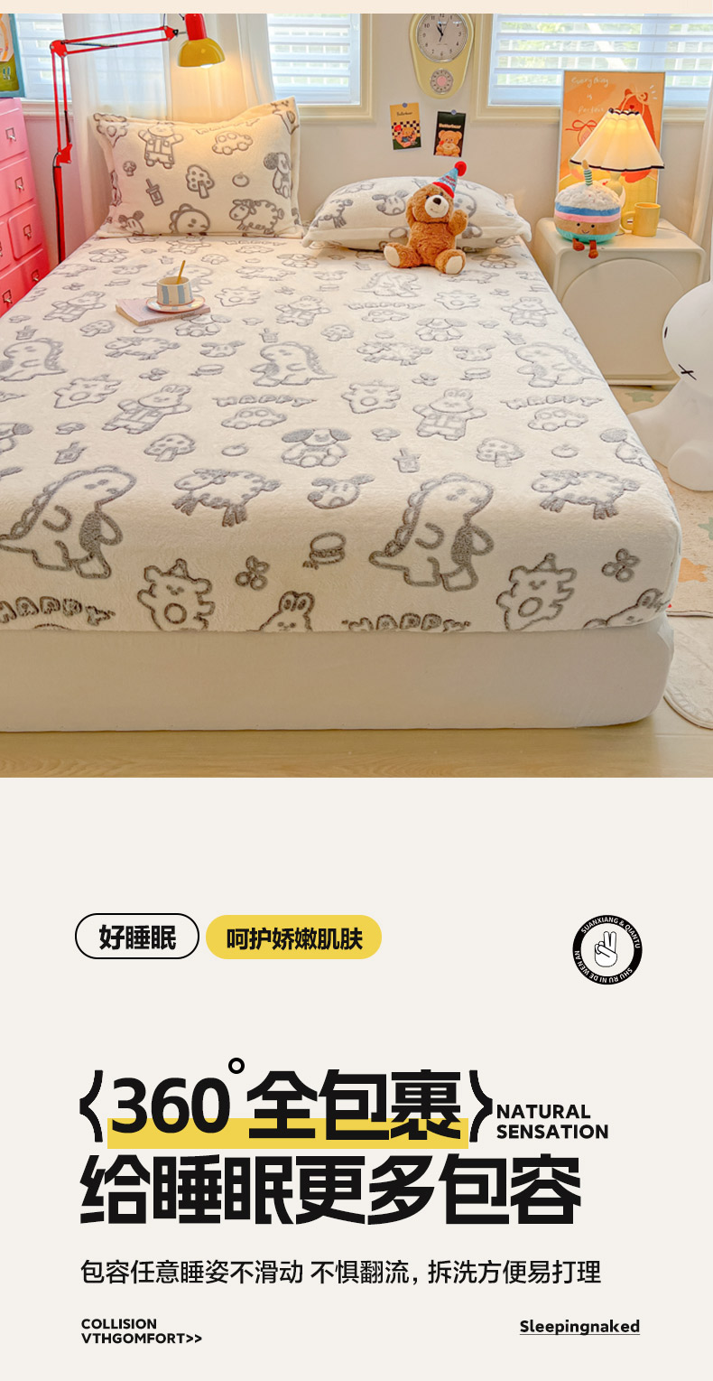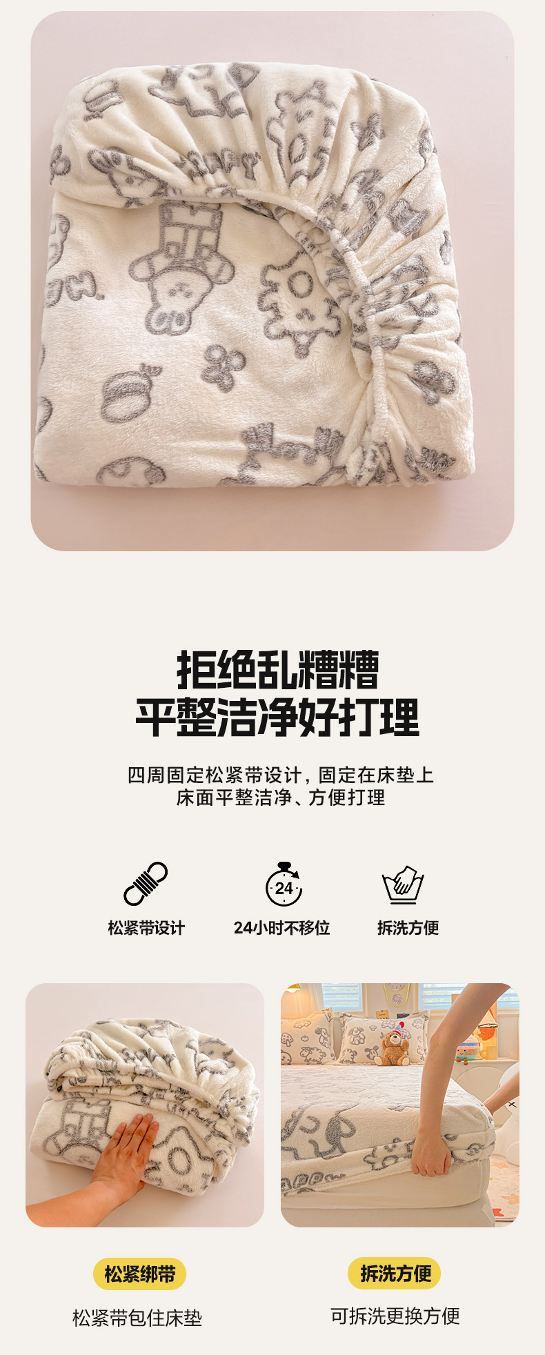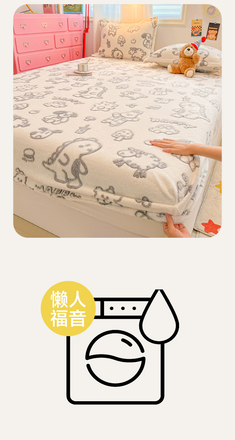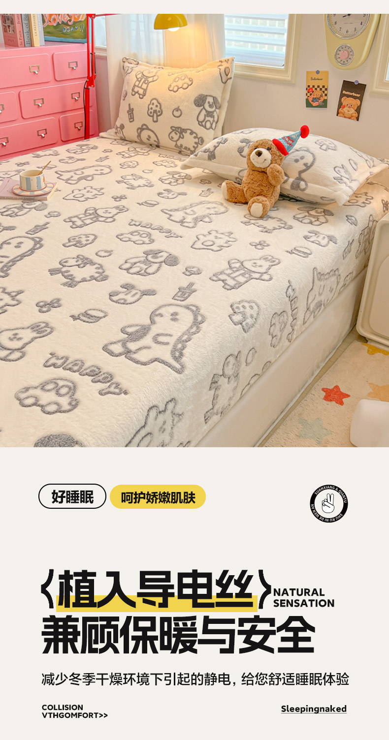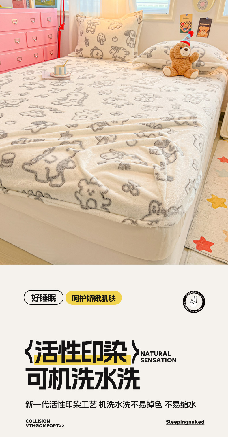 韩巢家纺 2024新款加厚雪花绒卡通印花保暖床笠三件套 灰色轨迹
