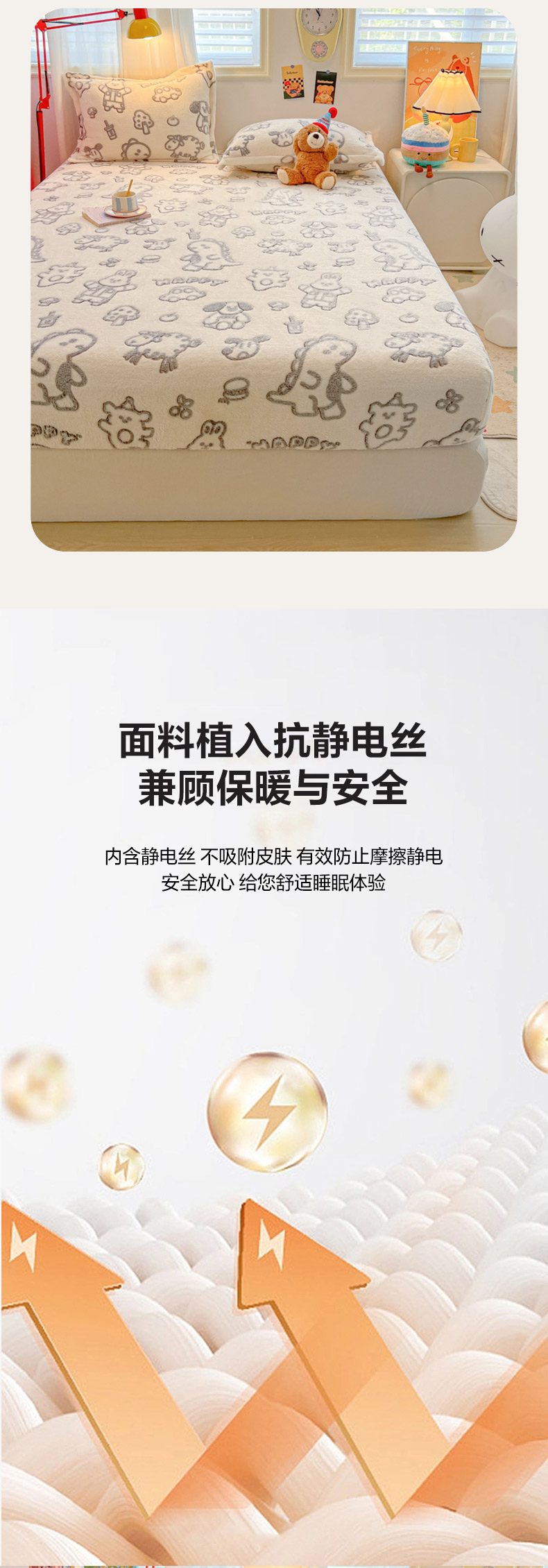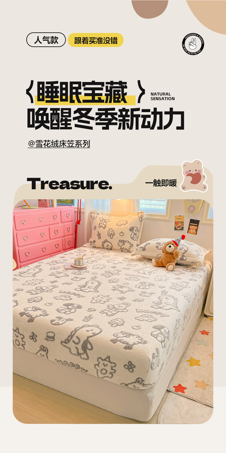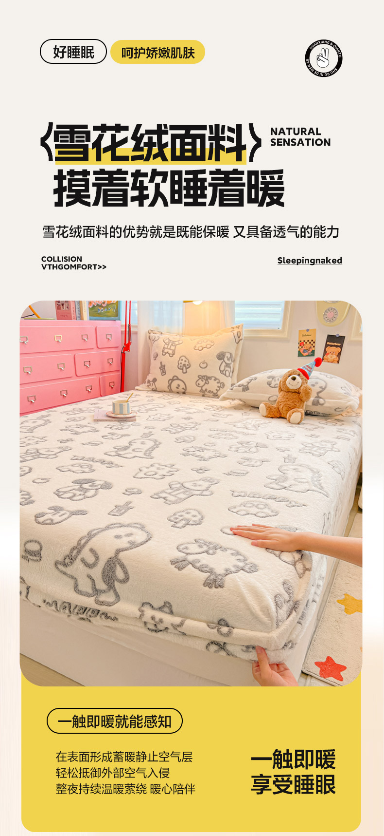 • 91家纺网 家纺一手货源 找家纺 韩巢家纺 2024新款加厚雪花绒卡通印花保暖床笠三件套 灰色轨迹