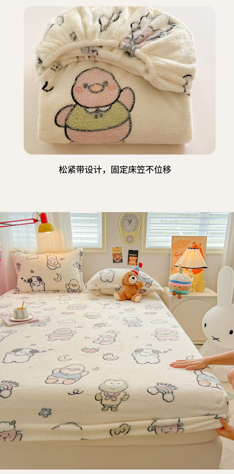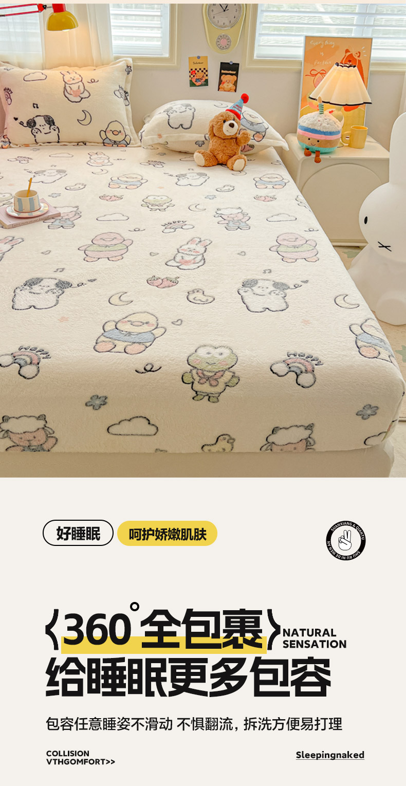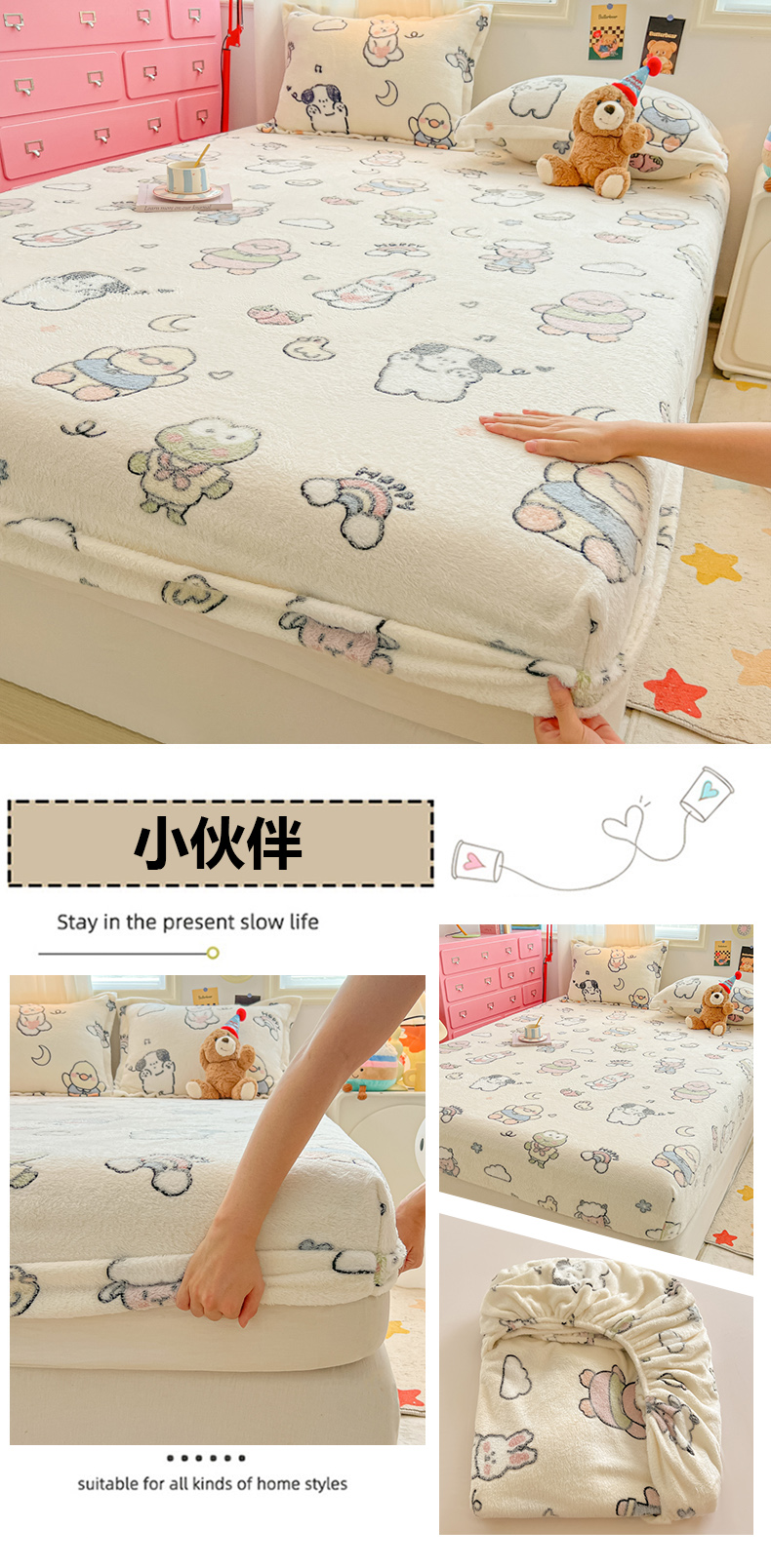 韩巢家纺 2024新款加厚雪花绒卡通印花保暖床笠三件套 小伙伴