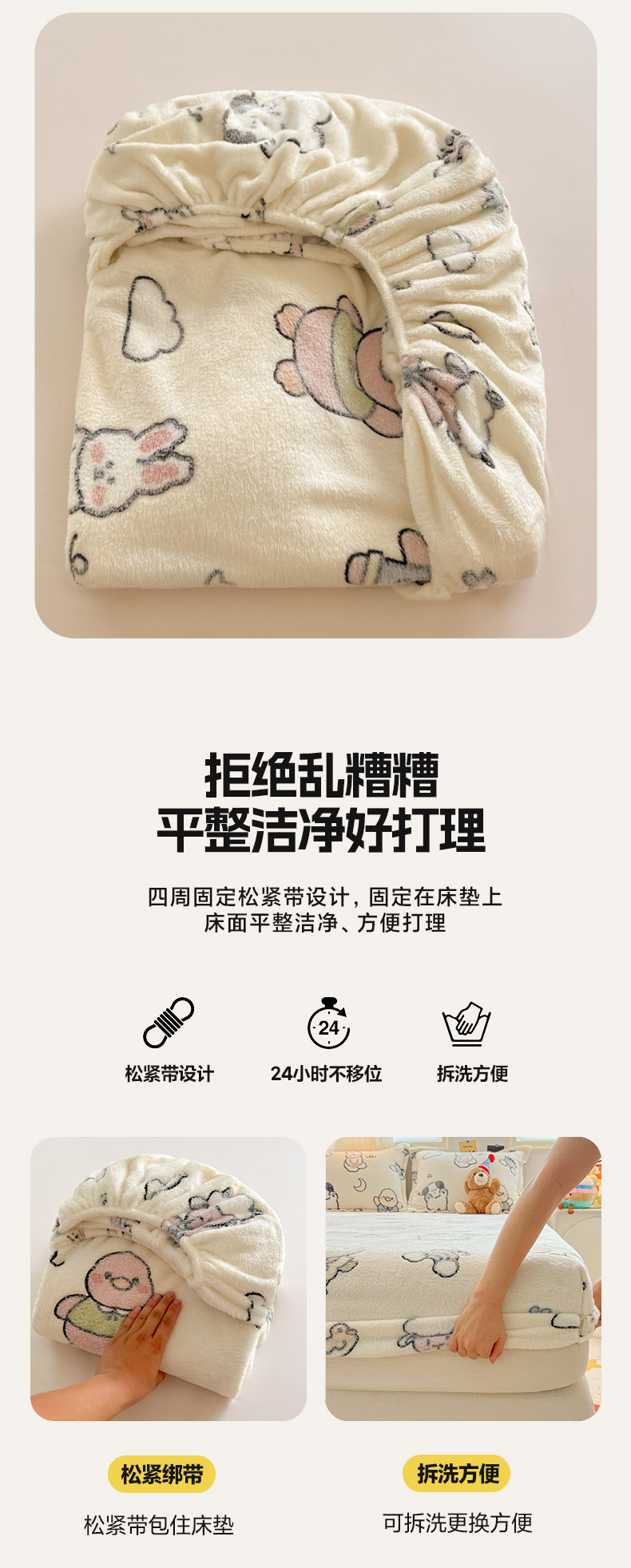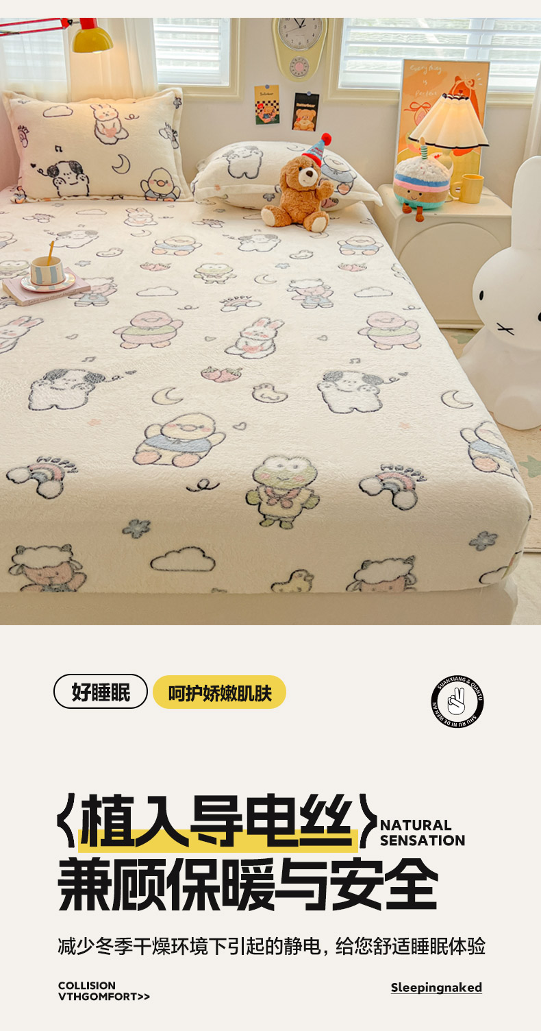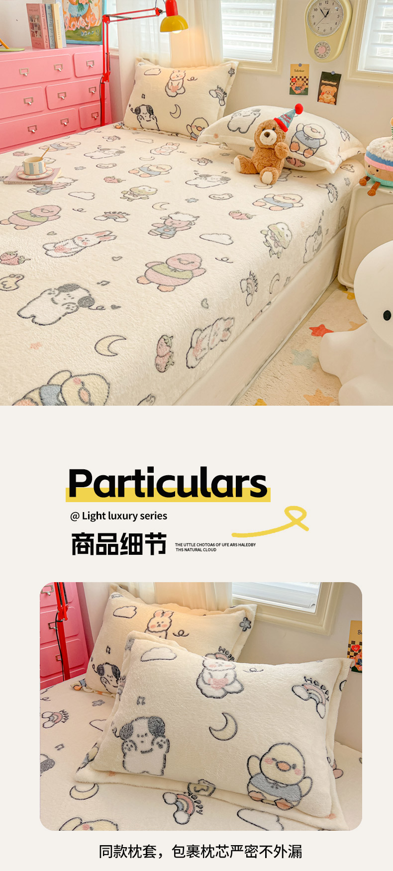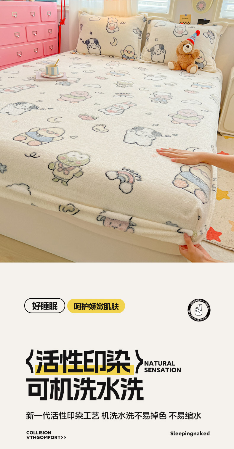 韩巢家纺 2024新款加厚雪花绒卡通印花保暖床笠三件套 小伙伴
